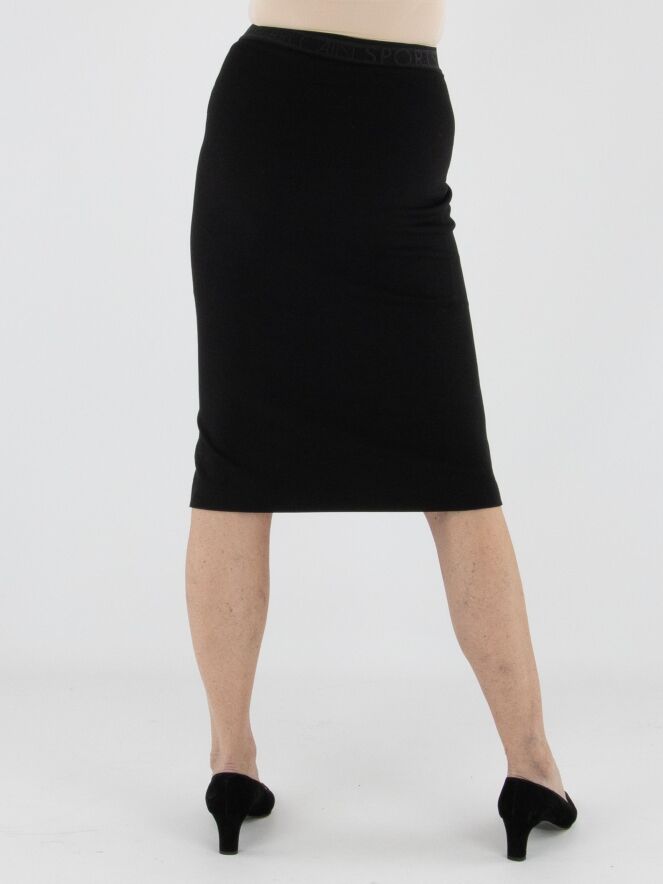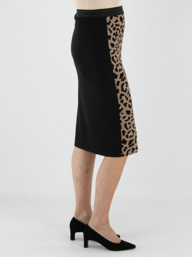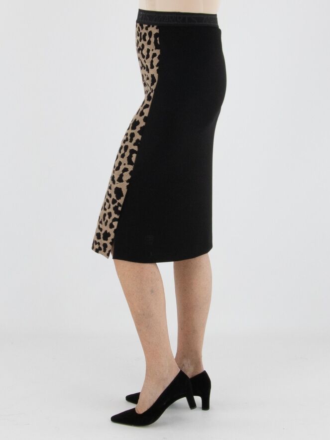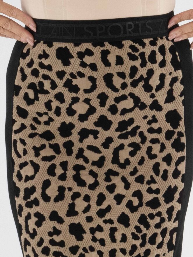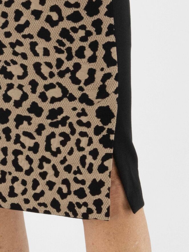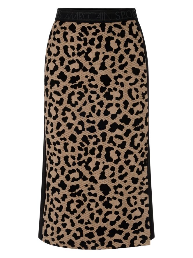 Une jupe de Marc Cain avec un imprimé léopard en camel et noir sur le devant. Le tissu imprimé est finement perforé, offrant un rendu moderne et raffiné. Le dos est réalisé en noir uni. La taille est soulignée par une ceinture élastique confortable. La jupe est entièrement doublée et peut être lavée à 30 degrés.