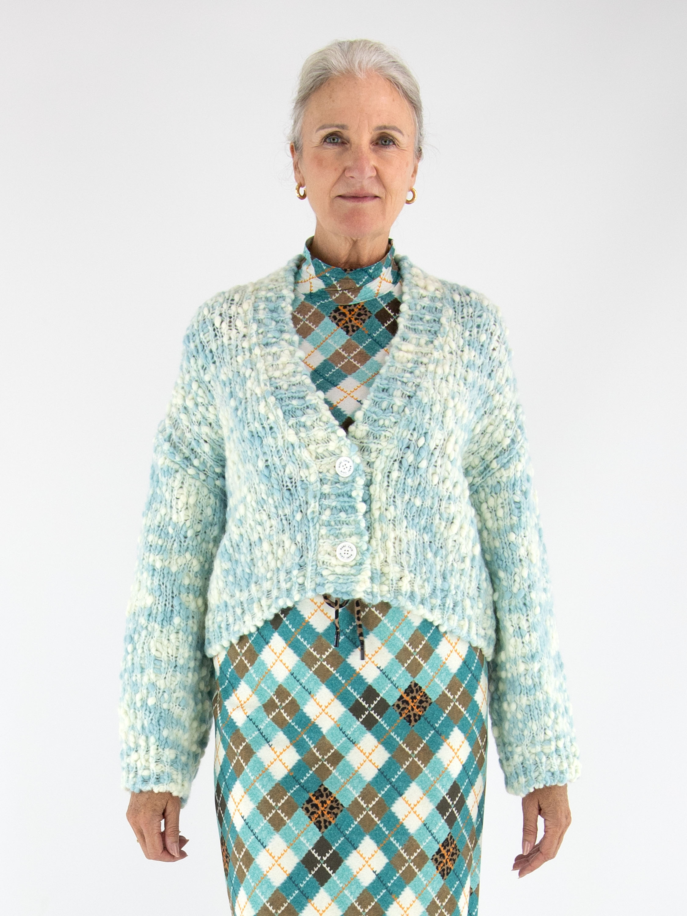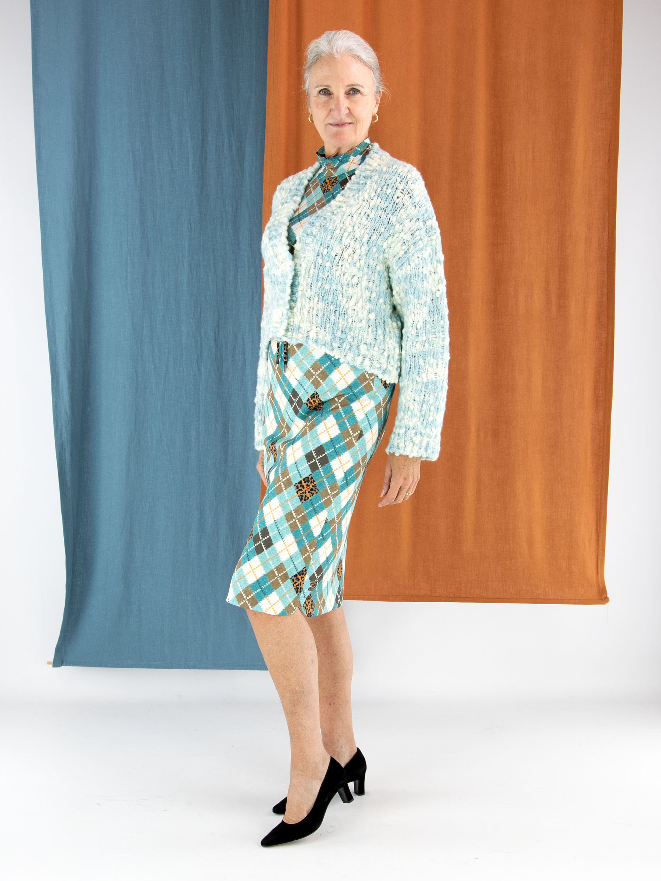 Une jupe remarquable de Marc Cain réalisée dans une matière scuba confortable. Elle est ornée d’un motif argyle classique décliné dans des tons de turquoise, brun, orange et blanc cassé. La taille est soulignée par une large ceinture élastique à imprimé léopard, agrémentée d’un cordon de serrage en tunnel pour plus de confort. La jupe est entièrement doublée et peut être lavée à 30 degrés.