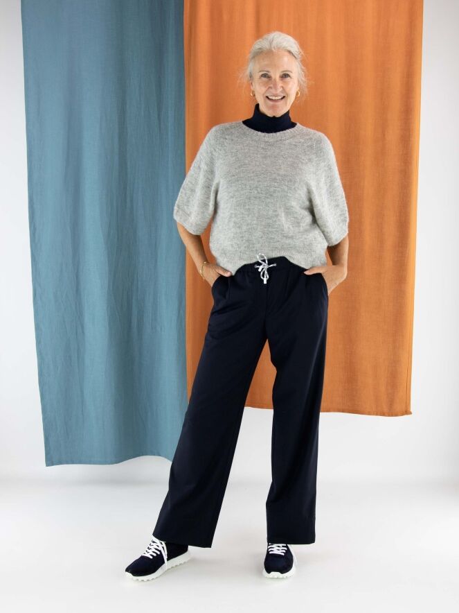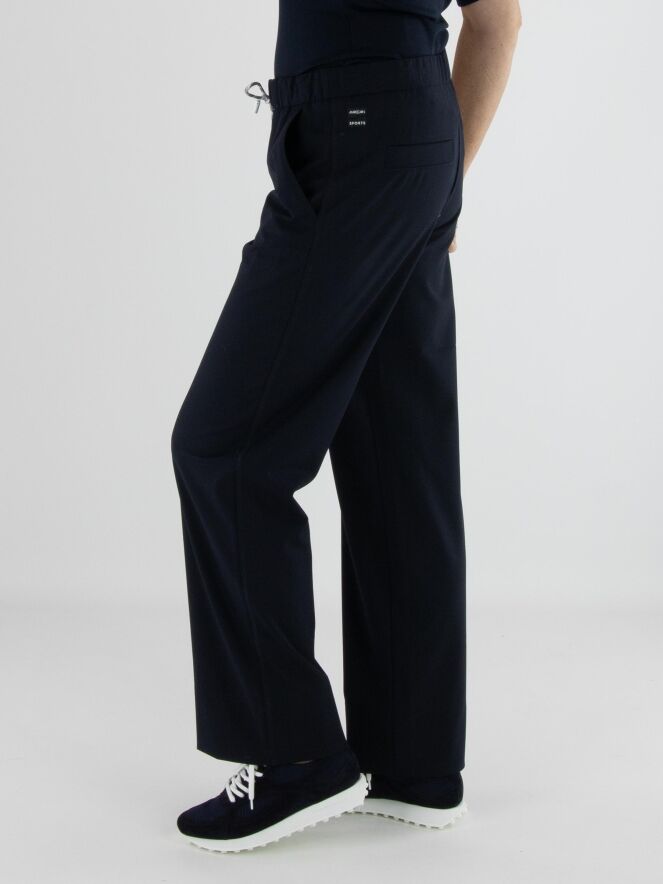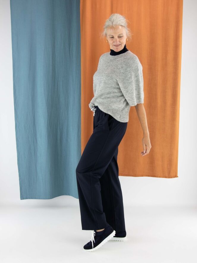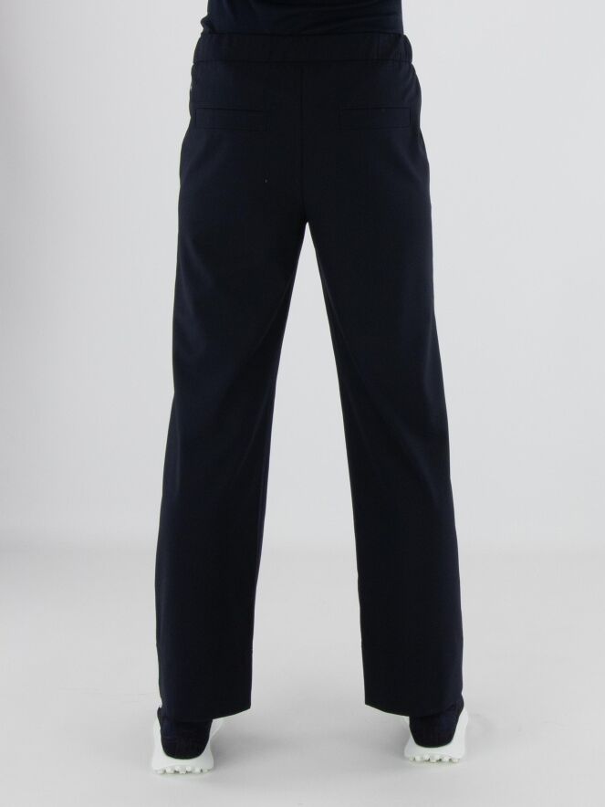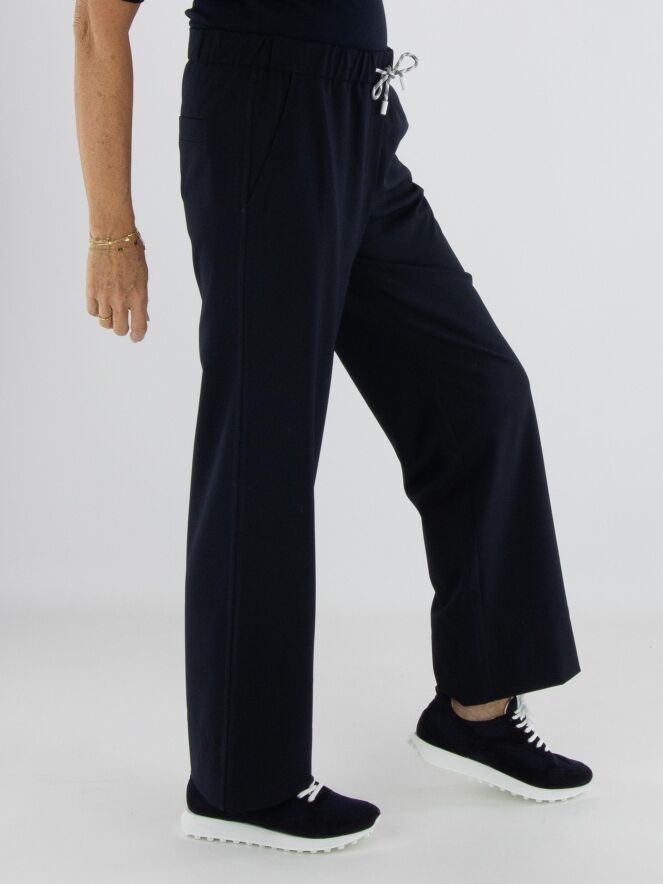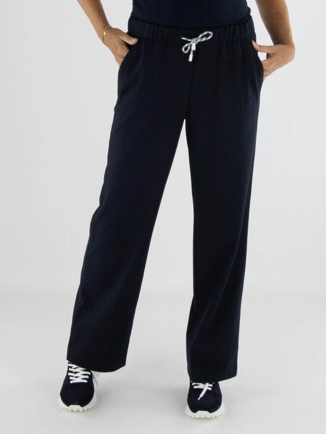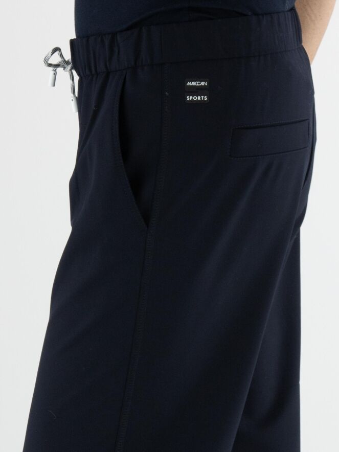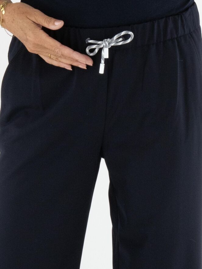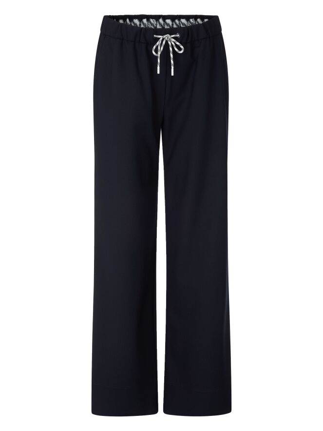 Pantalon de jogging de la marque Marc Cain en bleu marine. La taille est dotée d’une ceinture élastique plissée avec un cordon dans une coulisse. Dix centimètres au-dessus de l’ourlet des jambes se trouve une double surpiqûre. Le pantalon a des poches fendues et peut être lavé à 30 degrés.