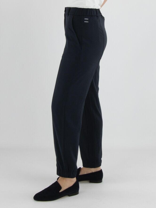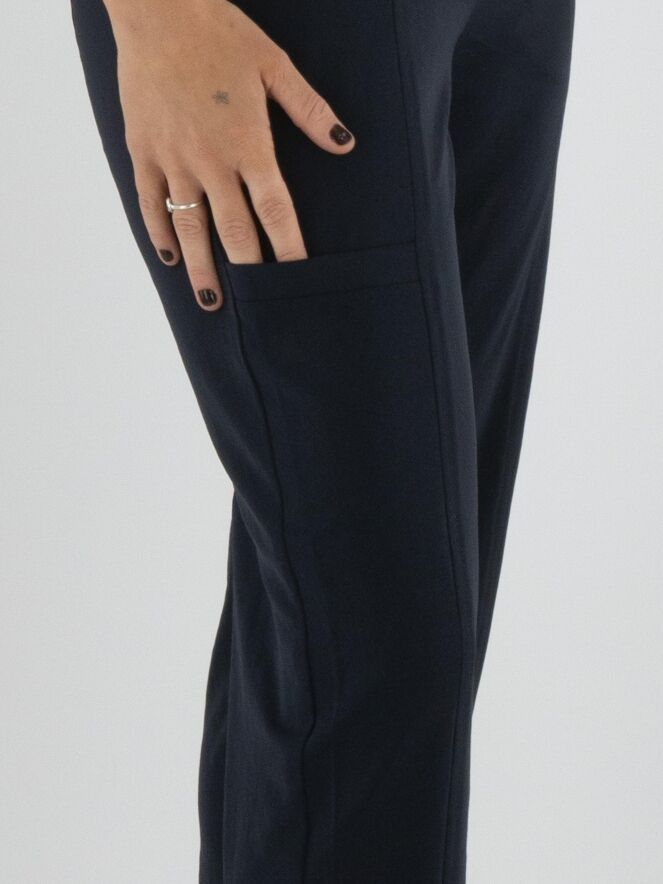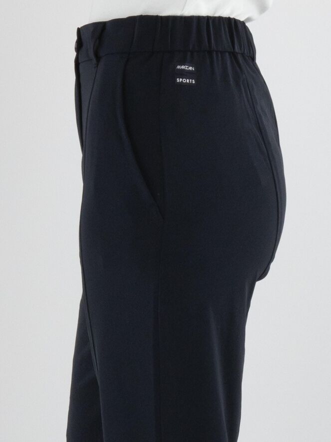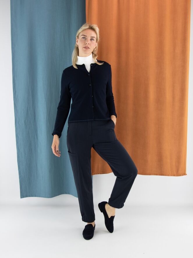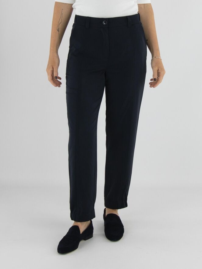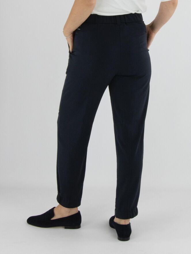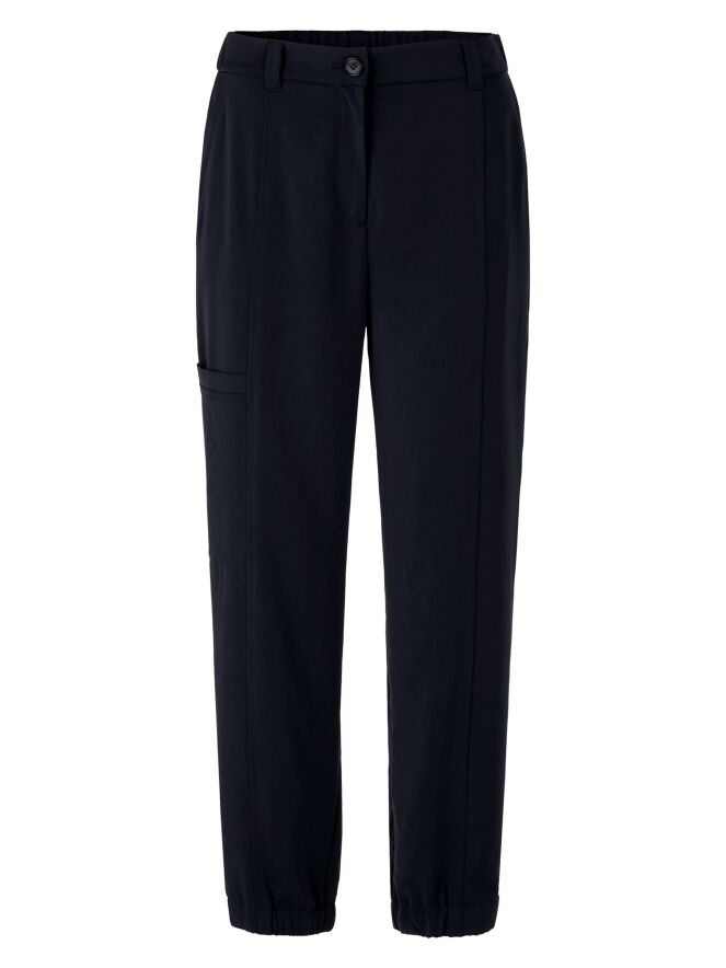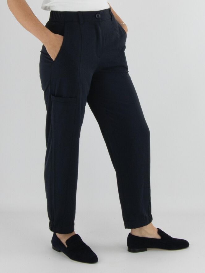 Un pantalon cargo de Marc Cain dans une couleur bleu marine. La ceinture présente un élastique finement froncé qui s’étend des côtés jusqu’au dos. Le bas des jambes est également terminé par une bande élastique finement froncée. Ce pantalon peut être lavé à 30 degrés.
