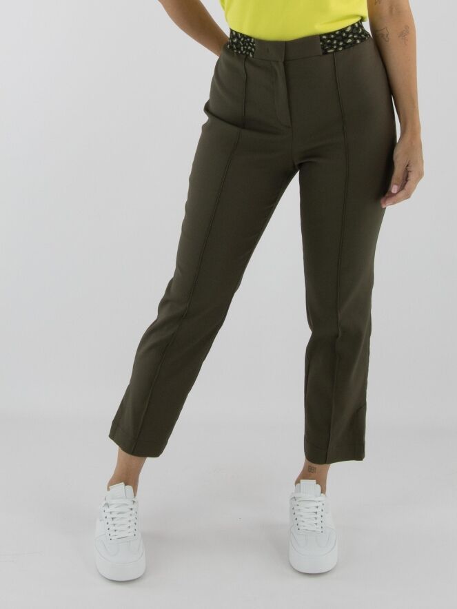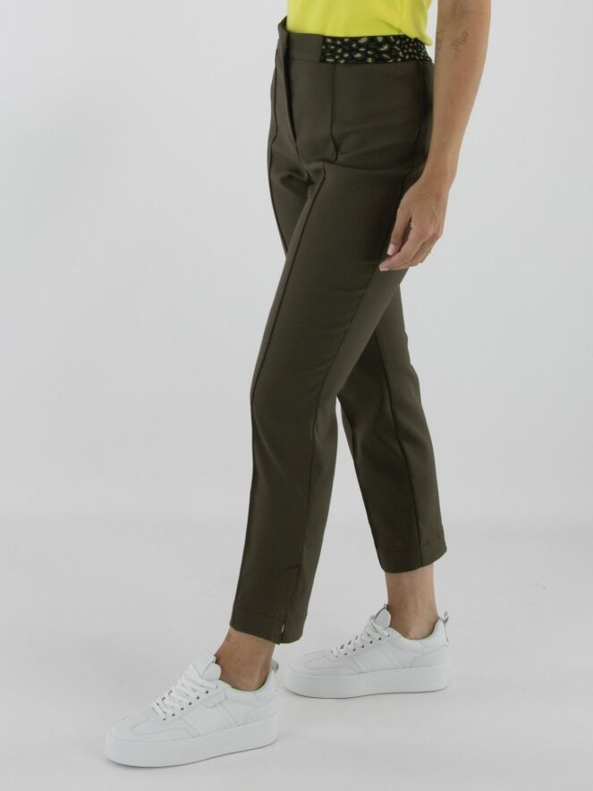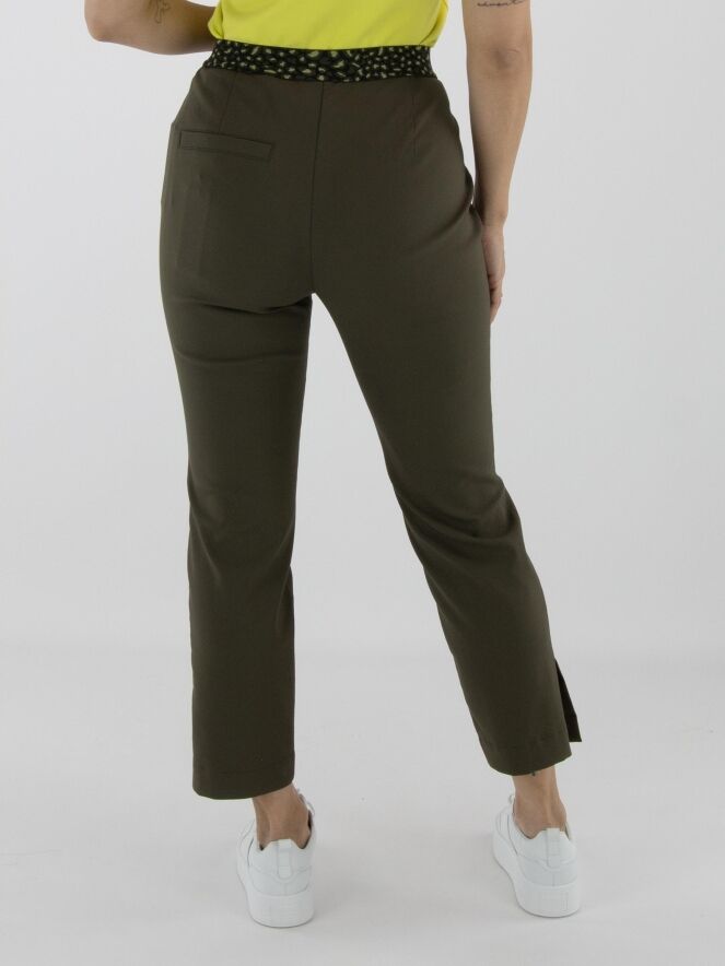 Pantalon de chez Marc Cain en vert olive. Une couture inversée traverse le centre des jambes. La taille est élastiquée avec un imprimé léopard dans les tons vert citron et vert olive. Ce pantalon peut être lavé à 30 degrés.