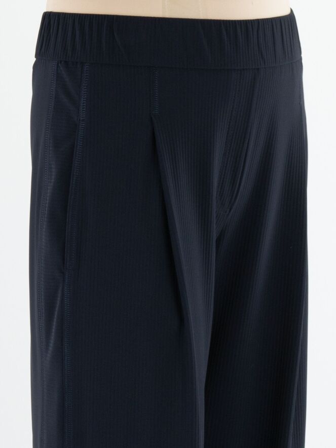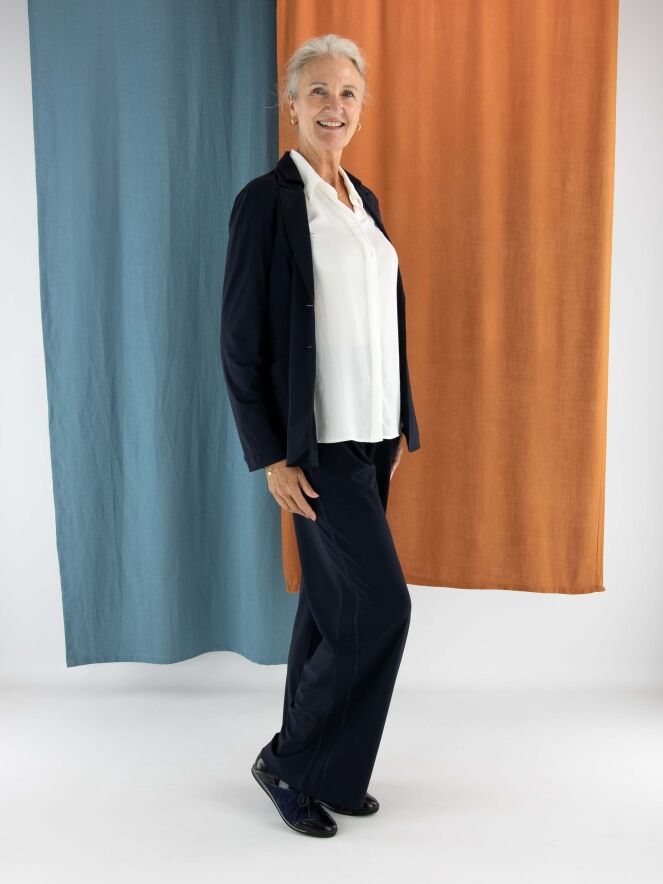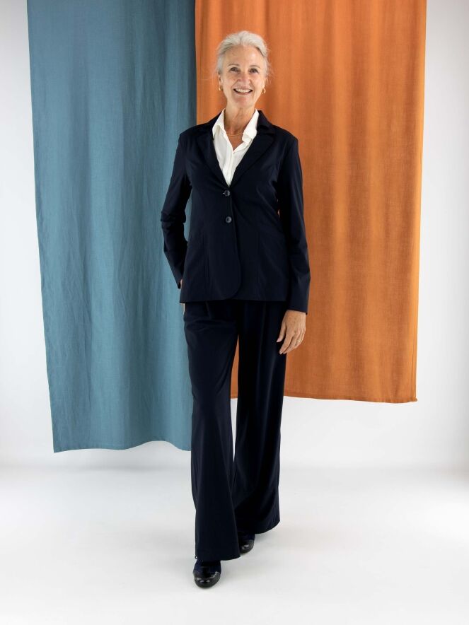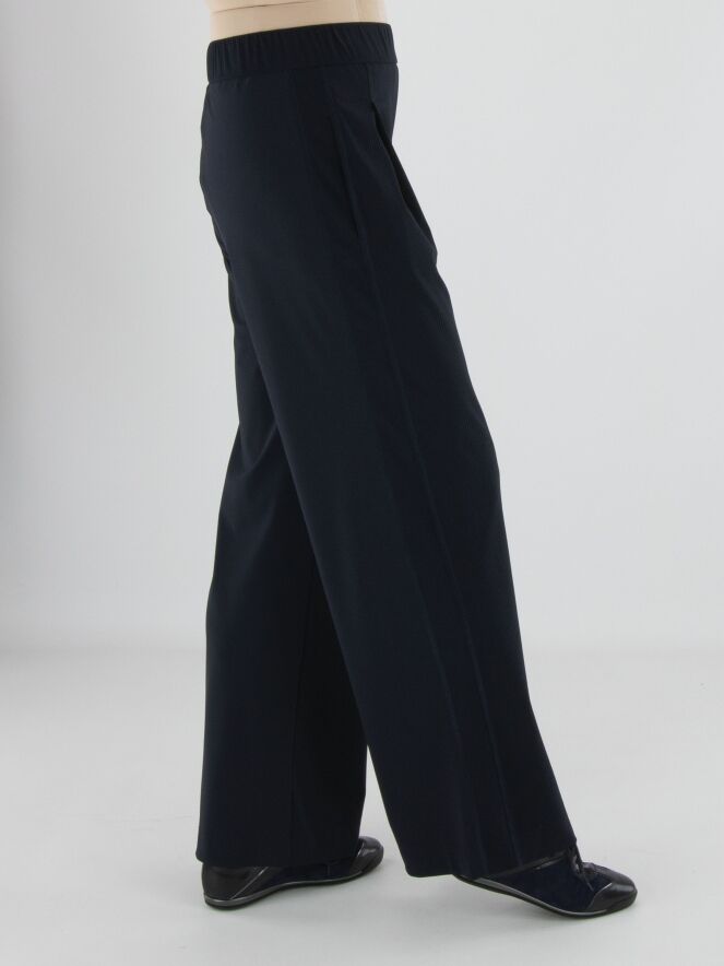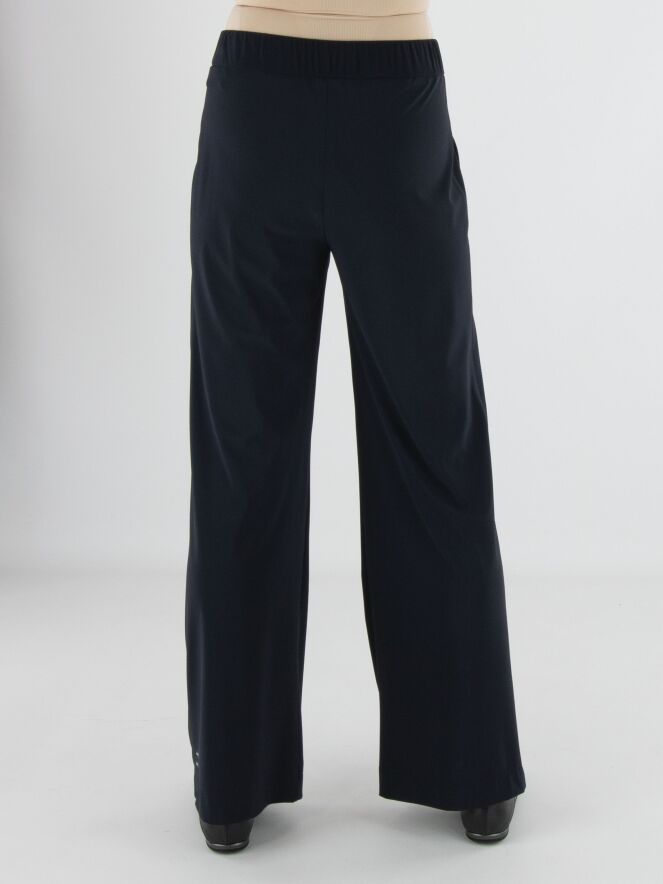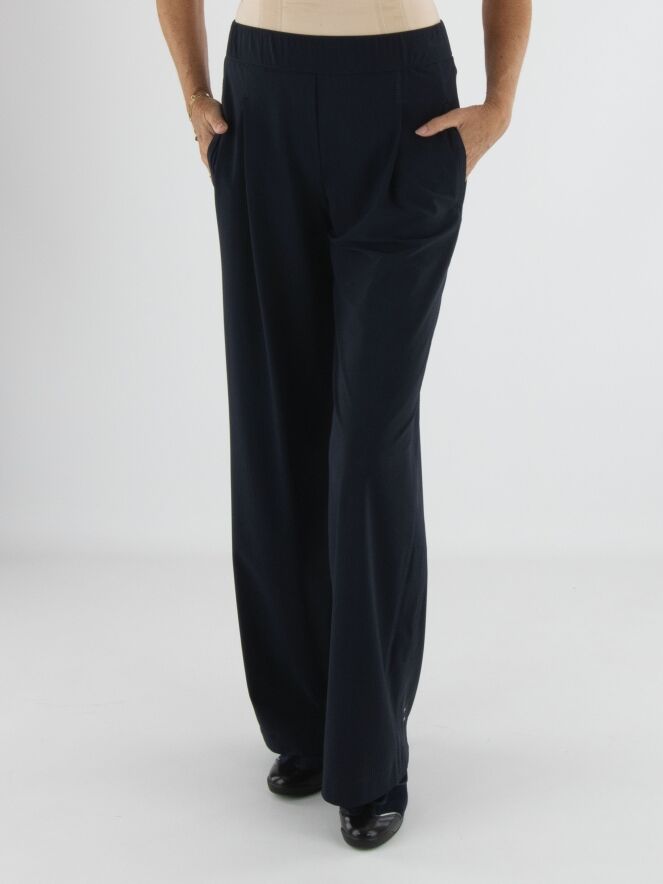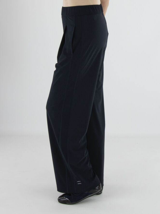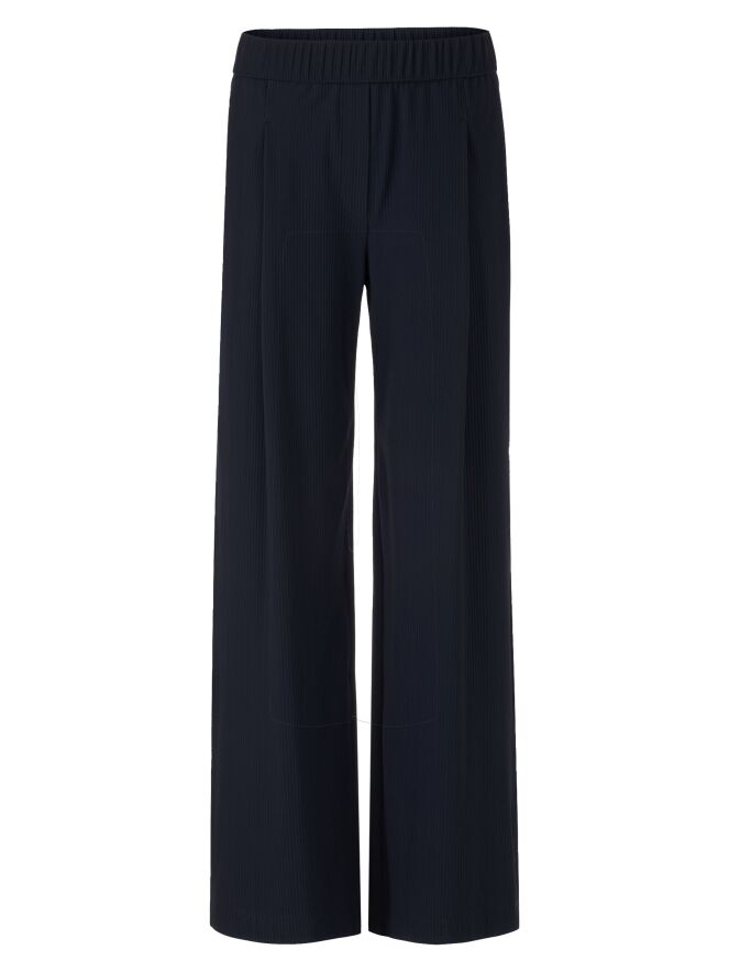 Pantalon ample de Marc Cain avec une texture à rayures fines sur le devant et un tissu uni au dos. La ceinture est dotée d’un élastique intégré. Le pantalon présente des plis à la taille et des poches fendues. Ce pantalon peut être lavé à 30 degrés.