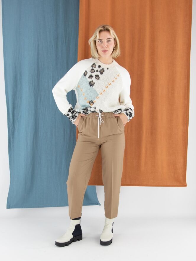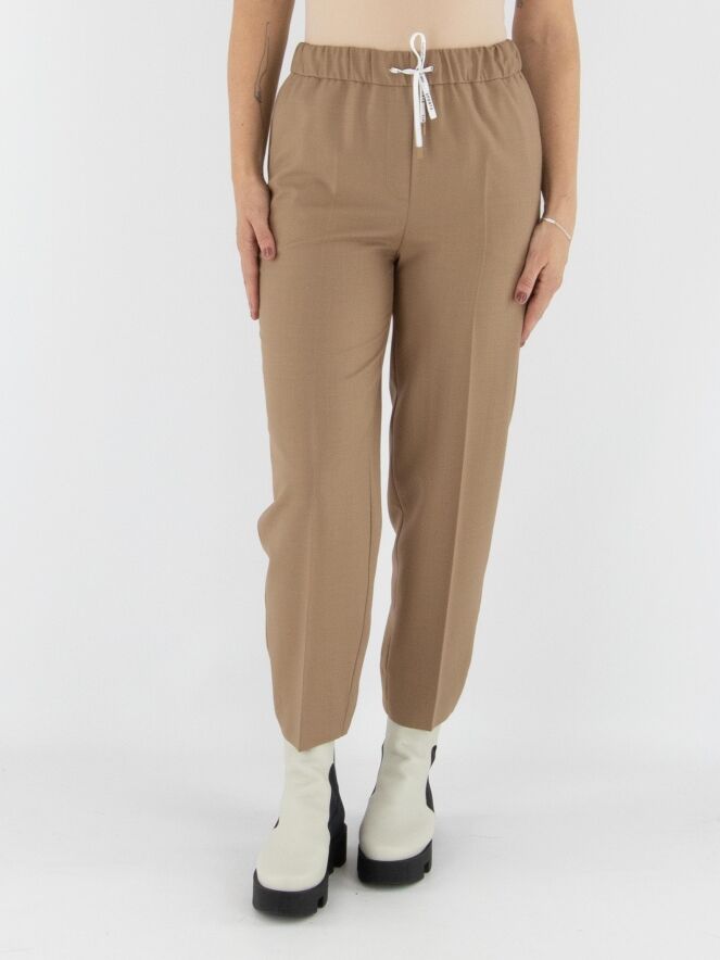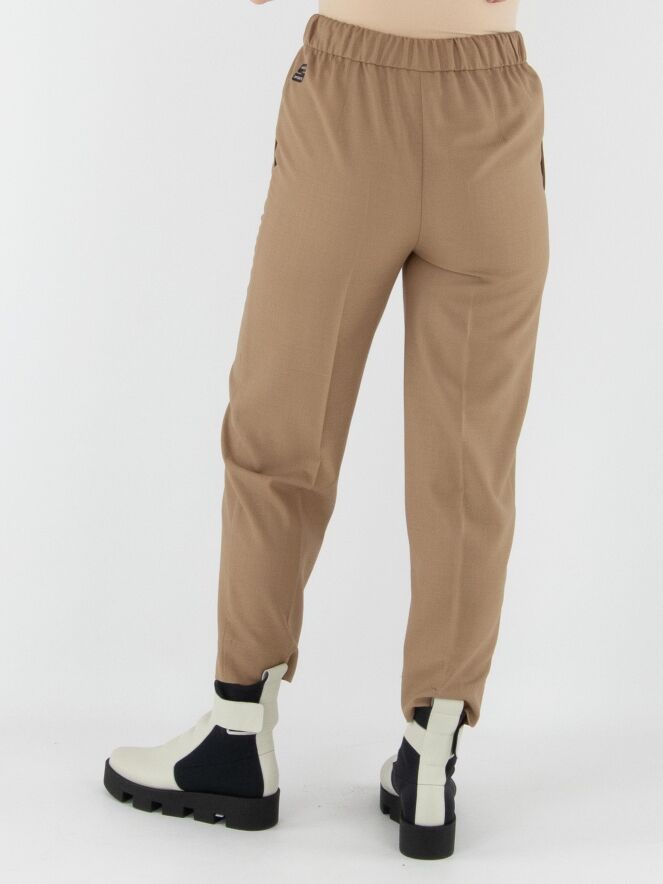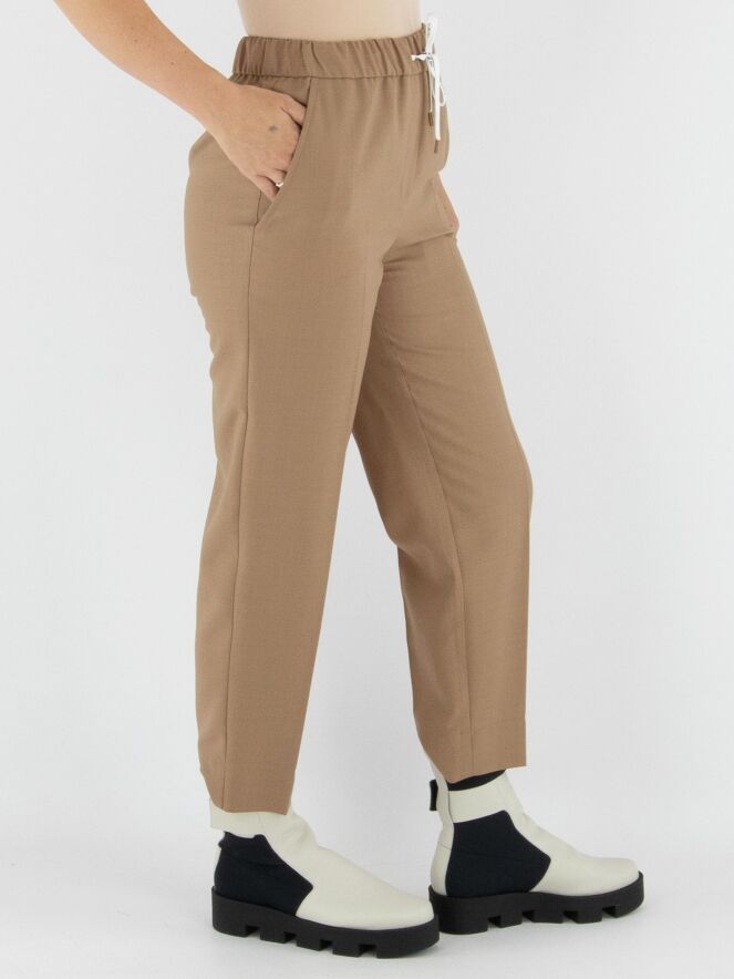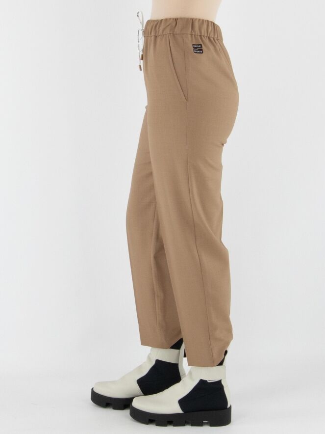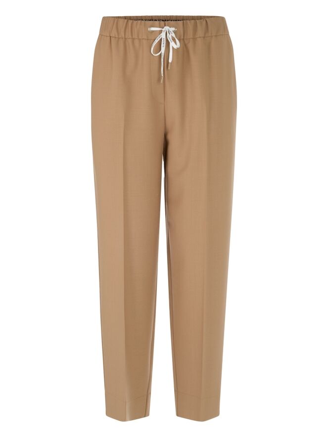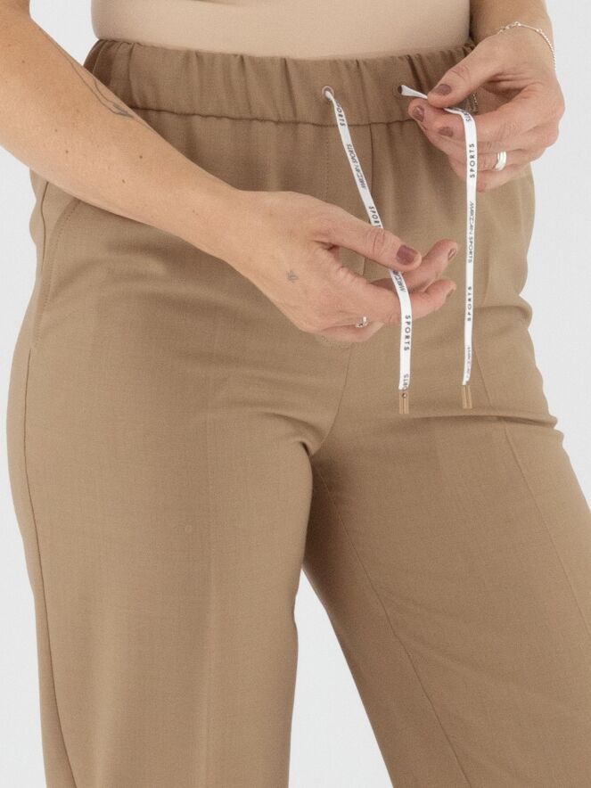 Un pantalon au style jogging de Marc Cain dans une teinte camel. La taille est dotée d’une ceinture élastique finement plissée avec un cordon inséré dans un tunnel. Le pantalon possède des poches sur les côtés et ne doit pas être lavé.