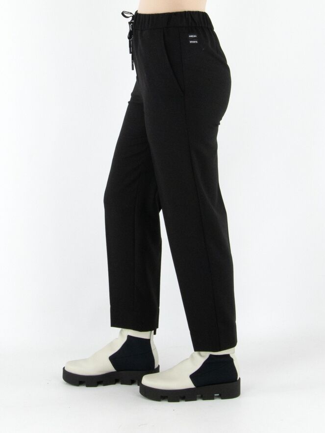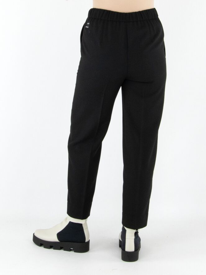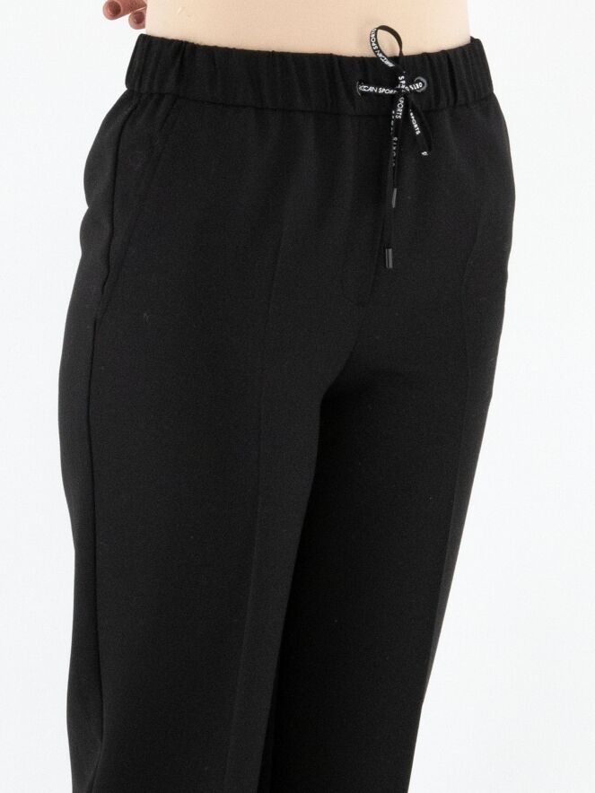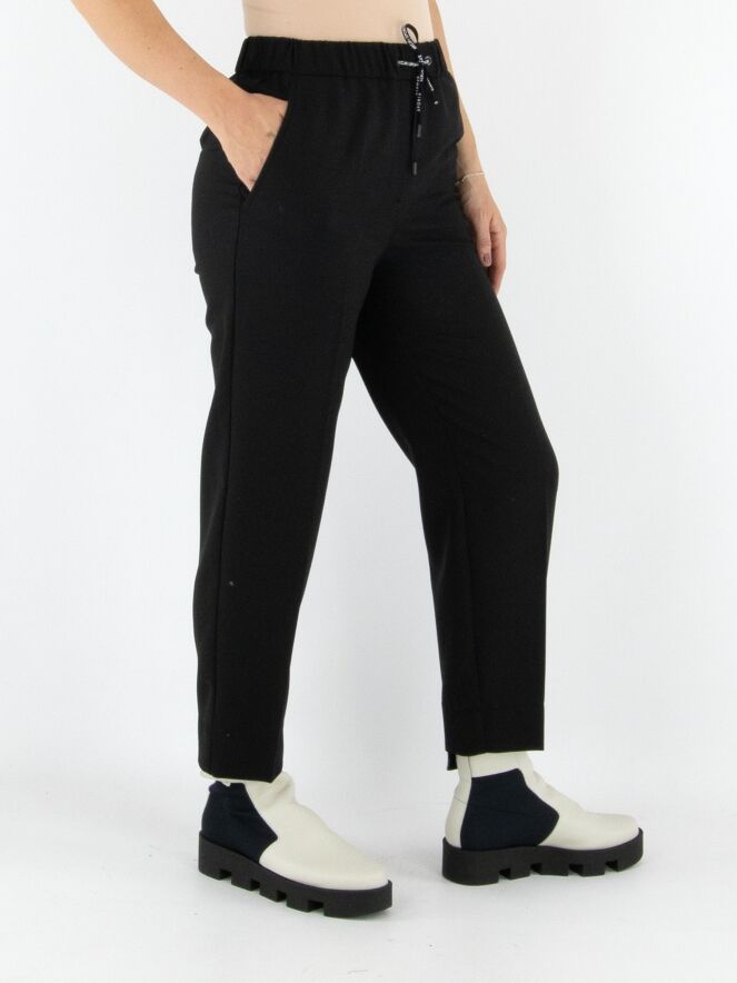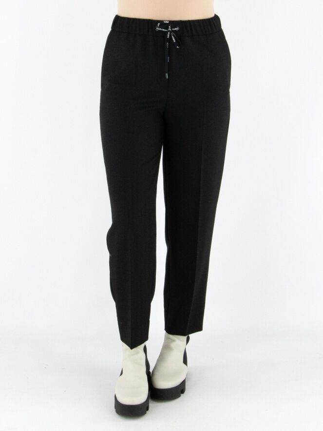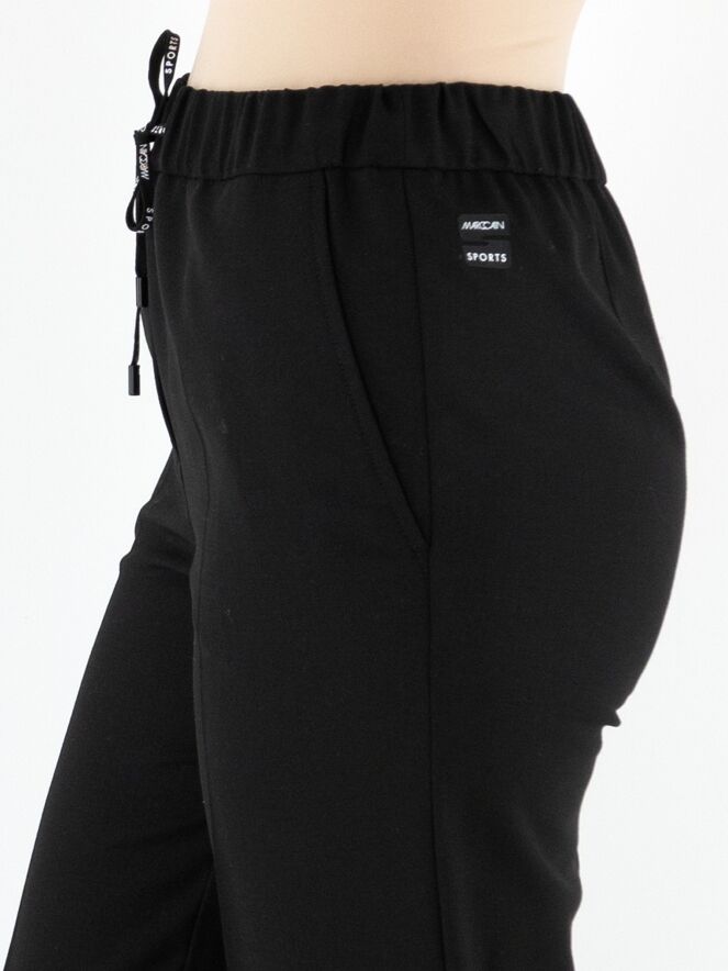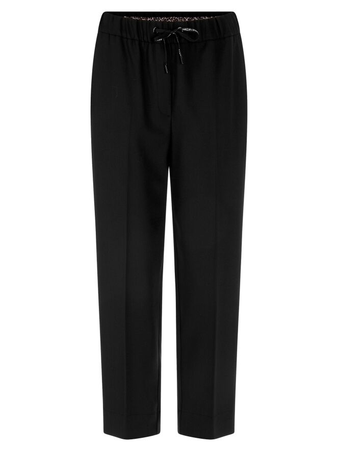 Un pantalon style jogging de Marc Cain en noir. La taille est dotée d’une ceinture élastique finement plissée avec un cordon de serrage dans une coulisse. Le pantalon possède des poches latérales et ne doit pas être lavé.