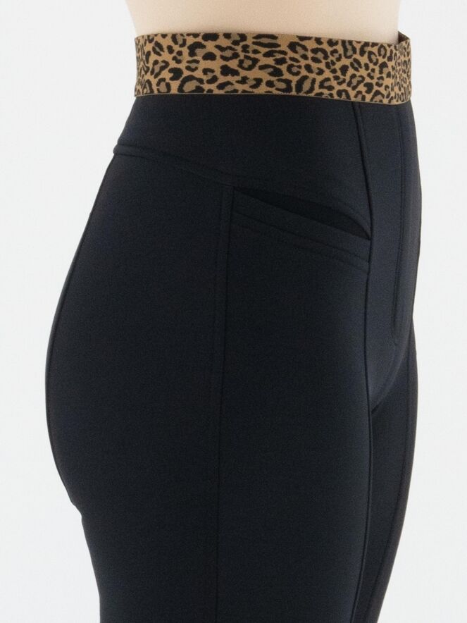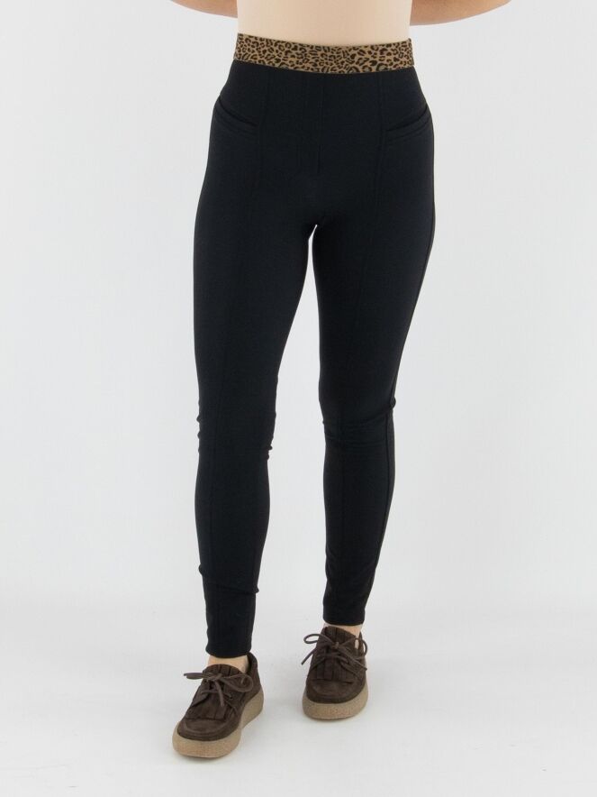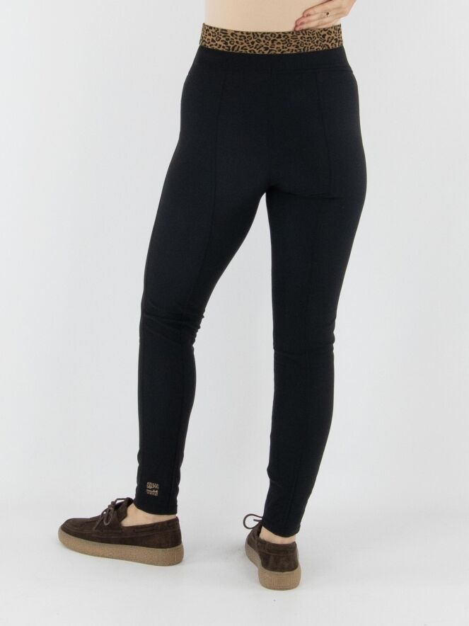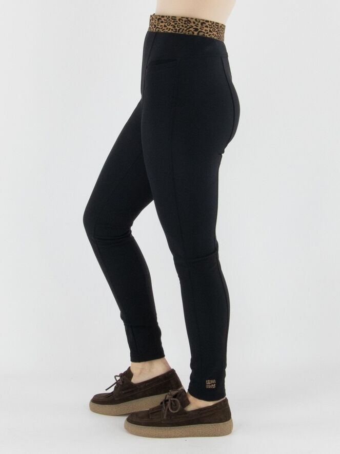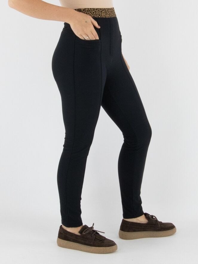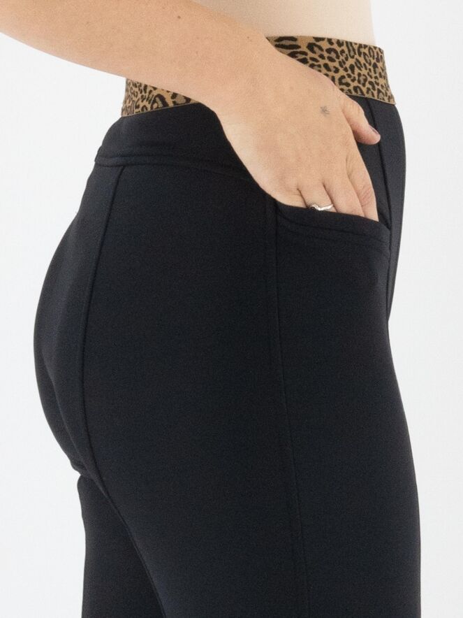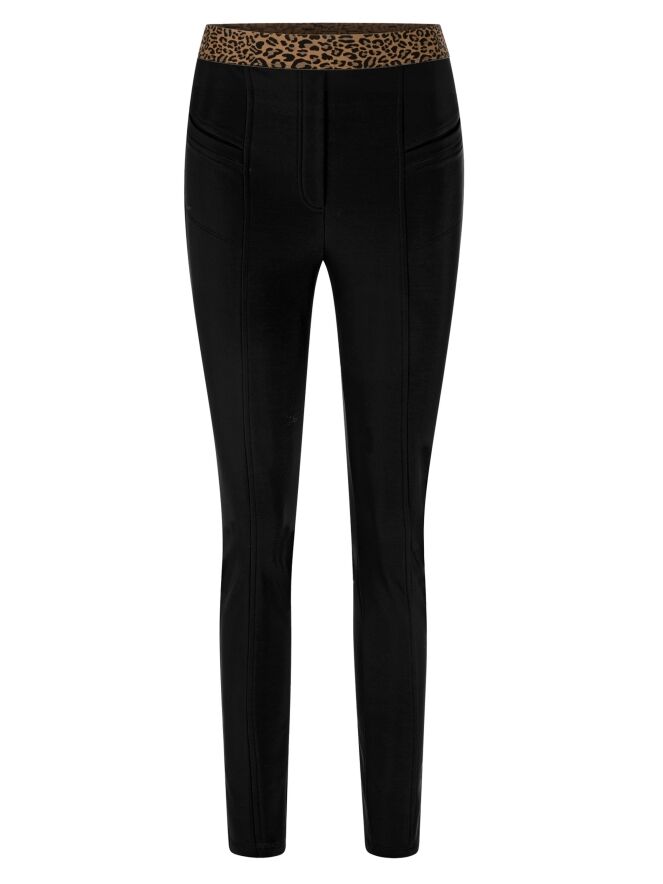 Un legging de Marc Cain en noir. La taille est soulignée par une ceinture élastique à imprimé léopard dans les tons brun et noir. Le legging est doté de petites poches et peut être lavé à 30 degrés.