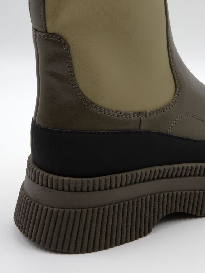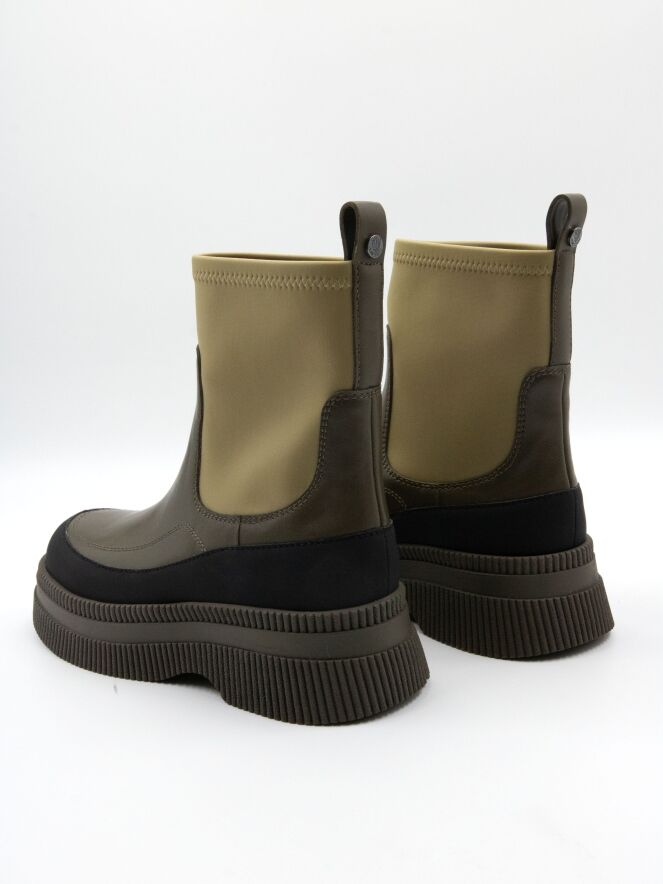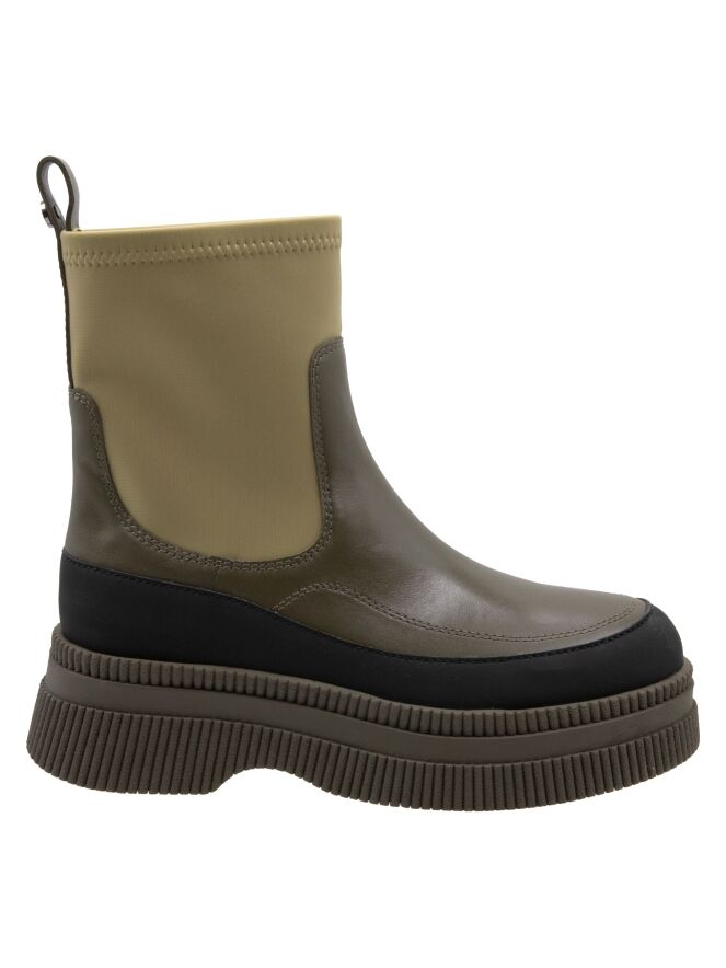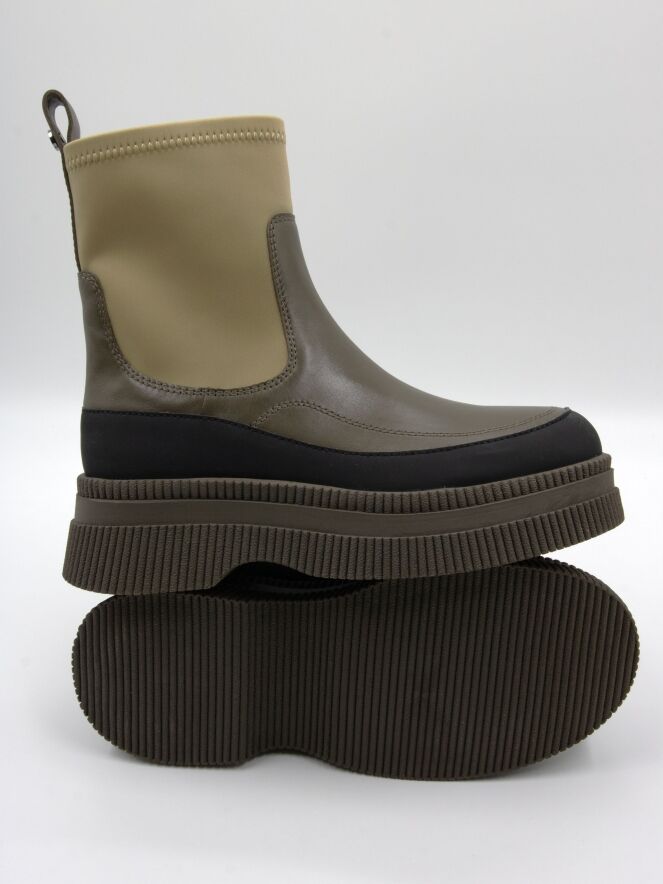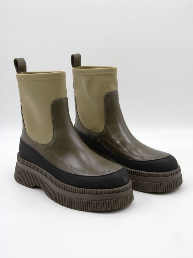 Bottine de Marc Cain dans plusieurs nuances de vert avec du noir. Le bord de la semelle finement côtelée en vert mousse est rehaussé d’un liseré en cuir noir mat. L’avant du pied, avec une fine bande jusqu’au talon, est en cuir vert olive. La tige est en vert pistache et réalisée dans une matière extensible.