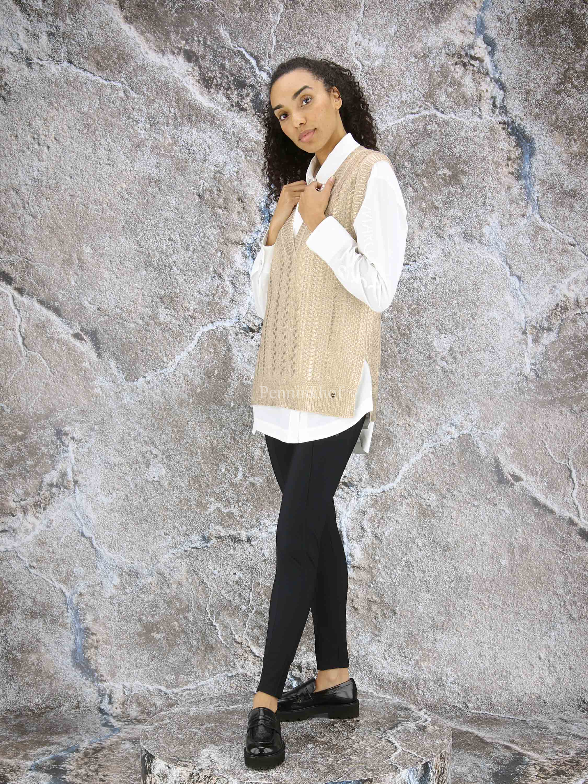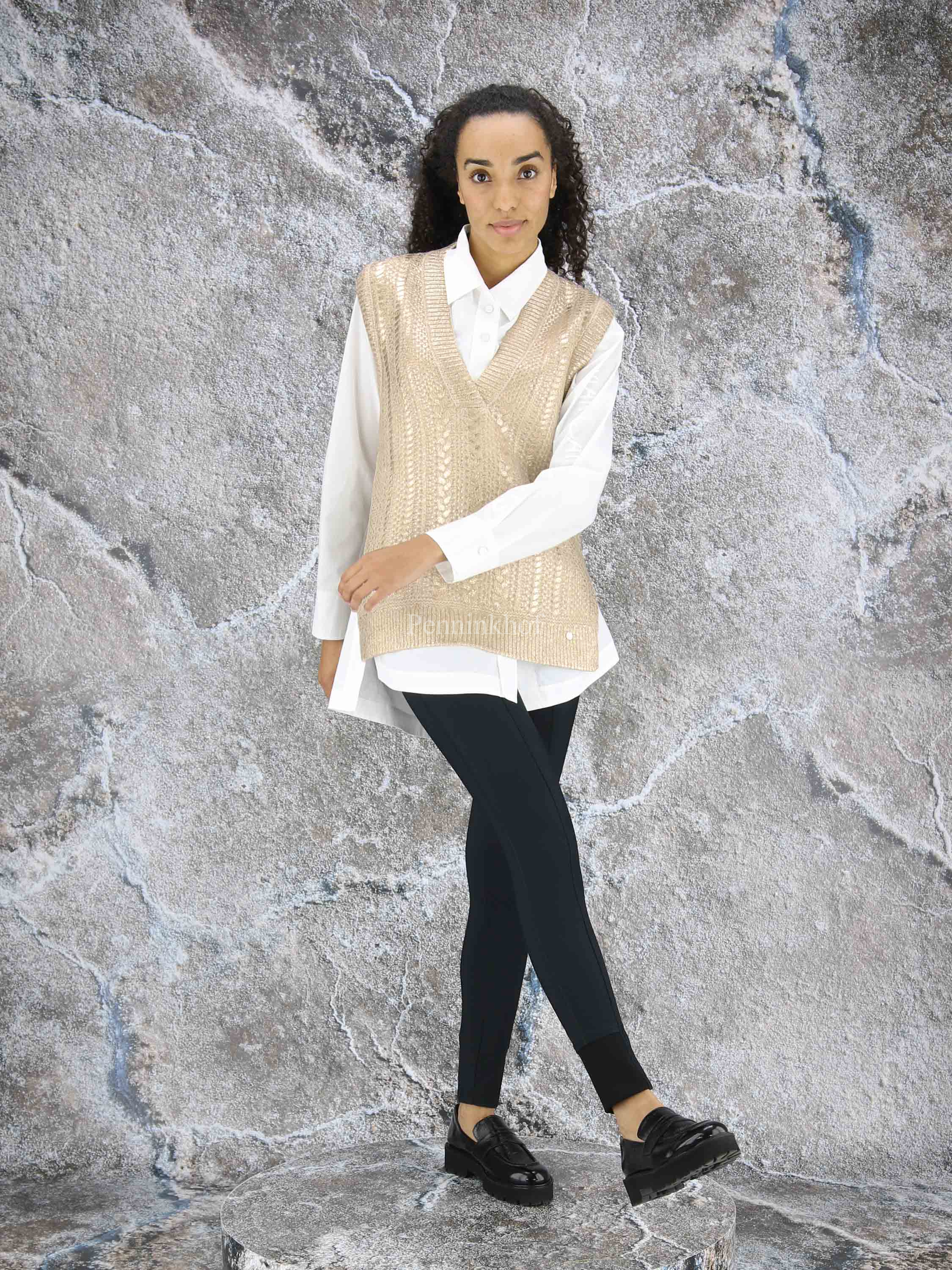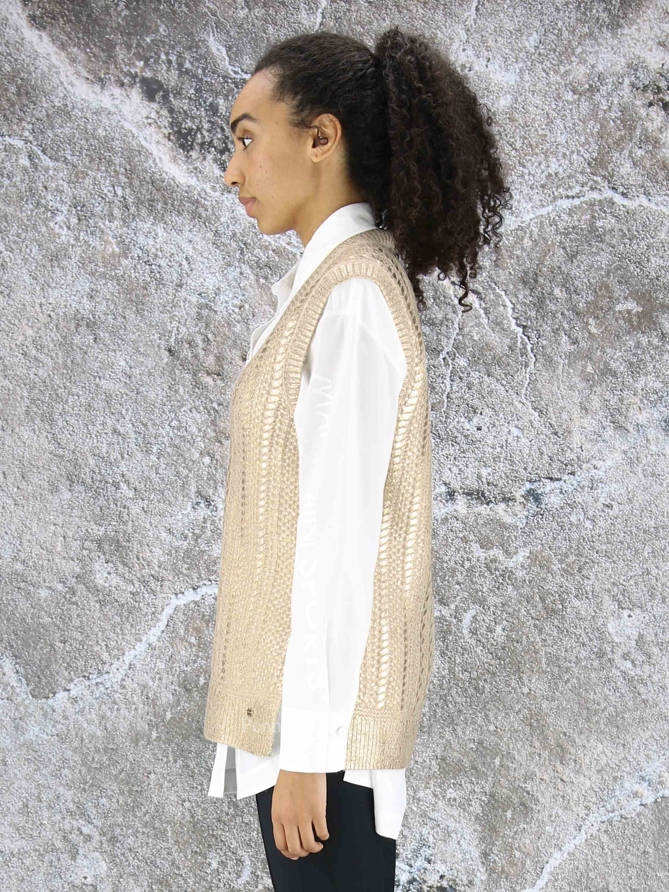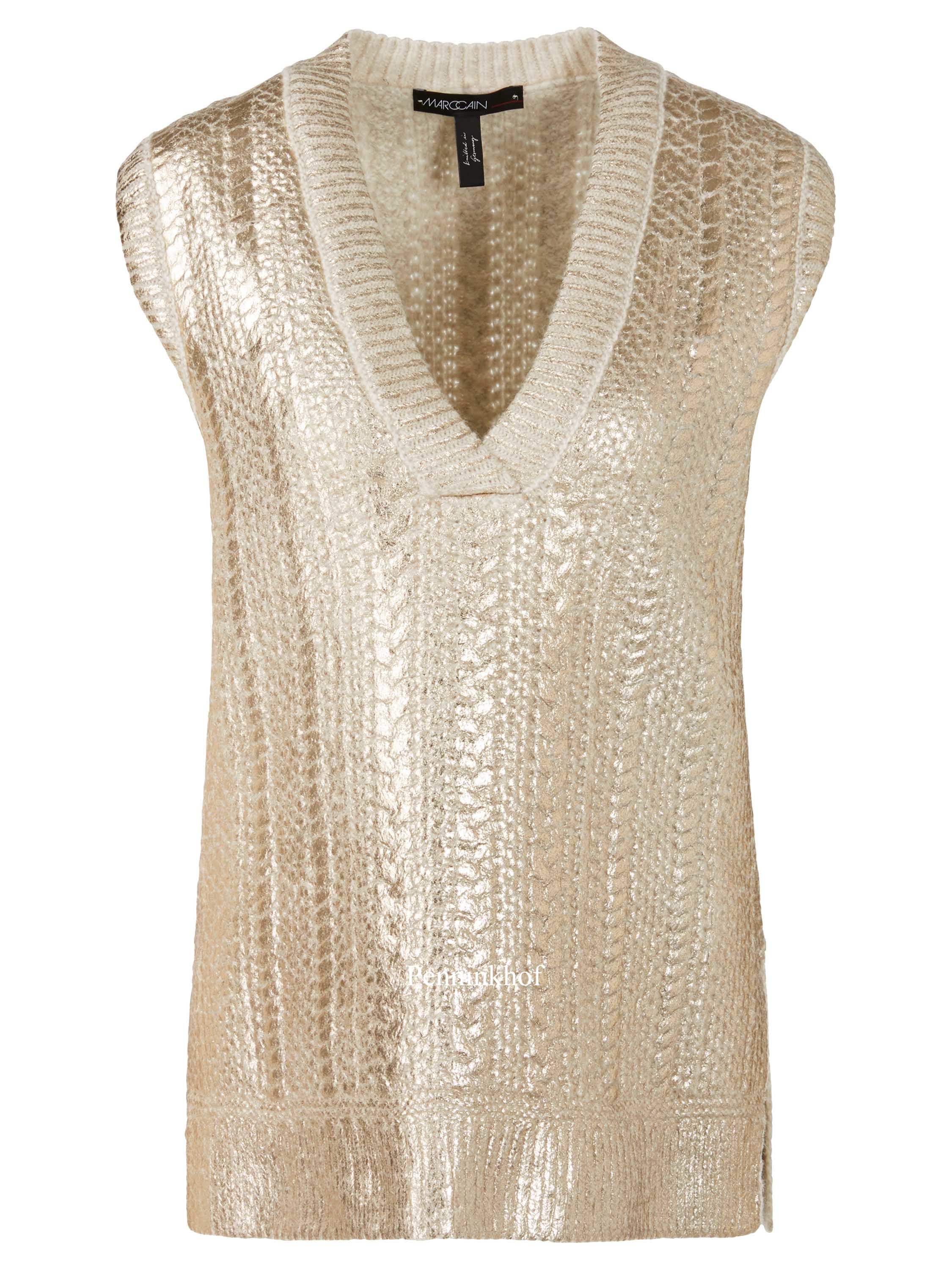 Débardeur à la coupe droite de la marque Marc Cain, de couleur beige à finition dorée. Le débardeur est tricoté dans un motif torsadé. Il présente un col en V croisé à profonde échancrure et des petites fentes d'aisance latérales. Lavage à la main.