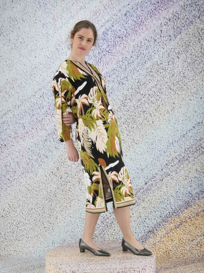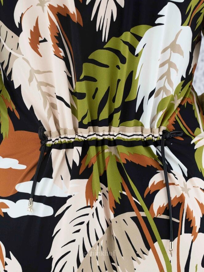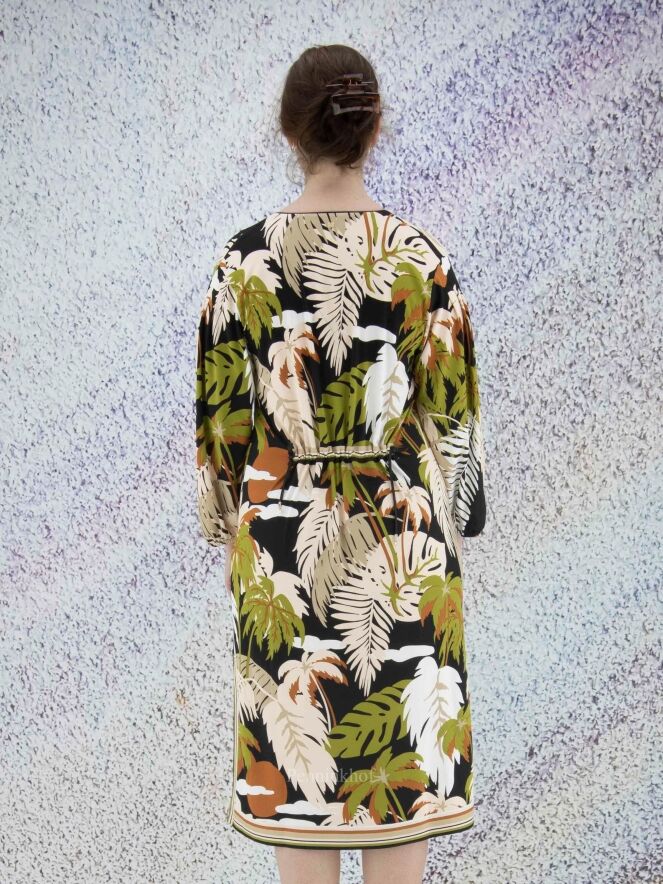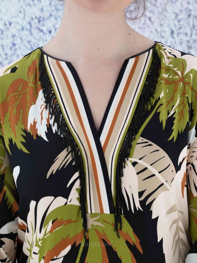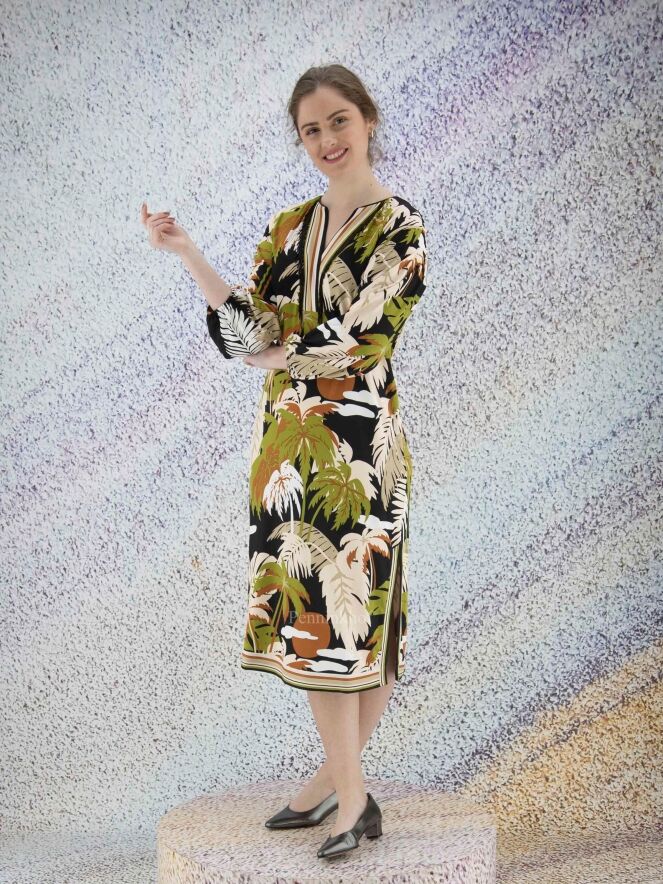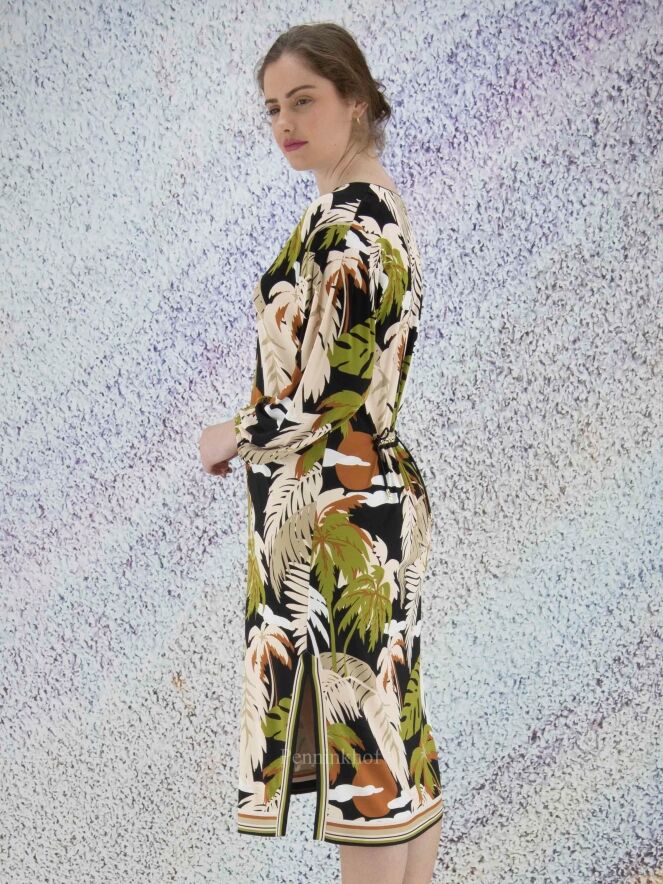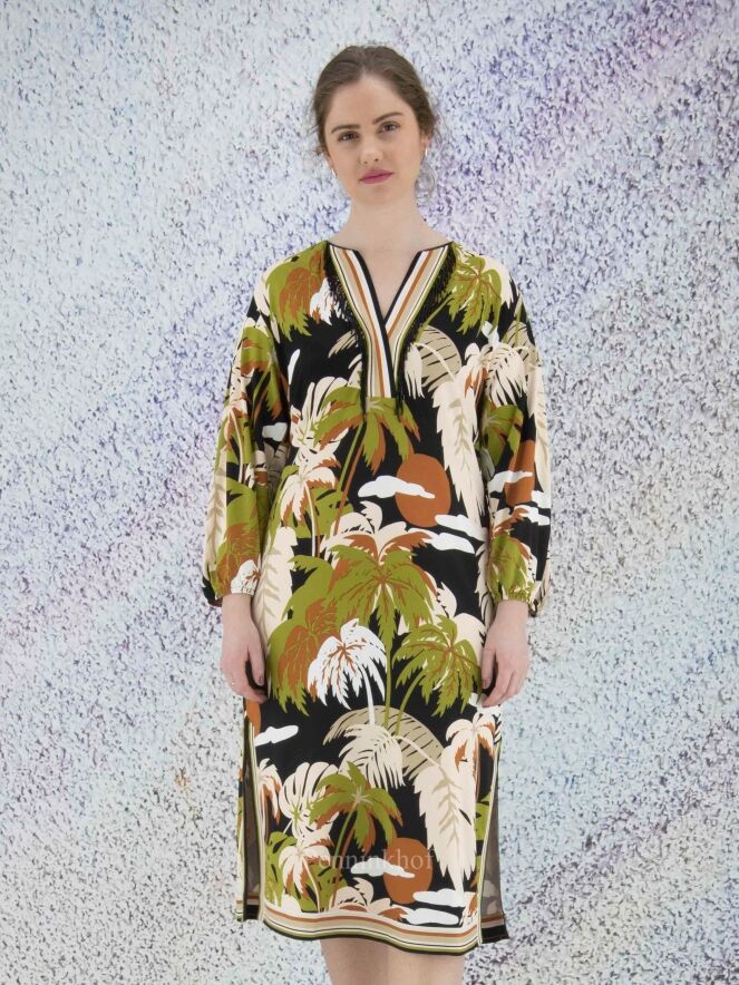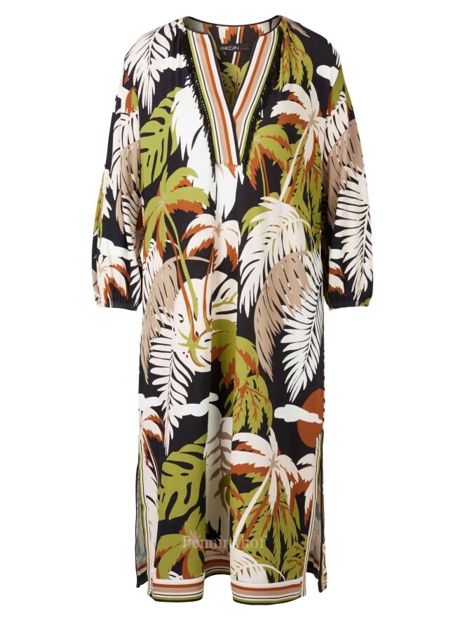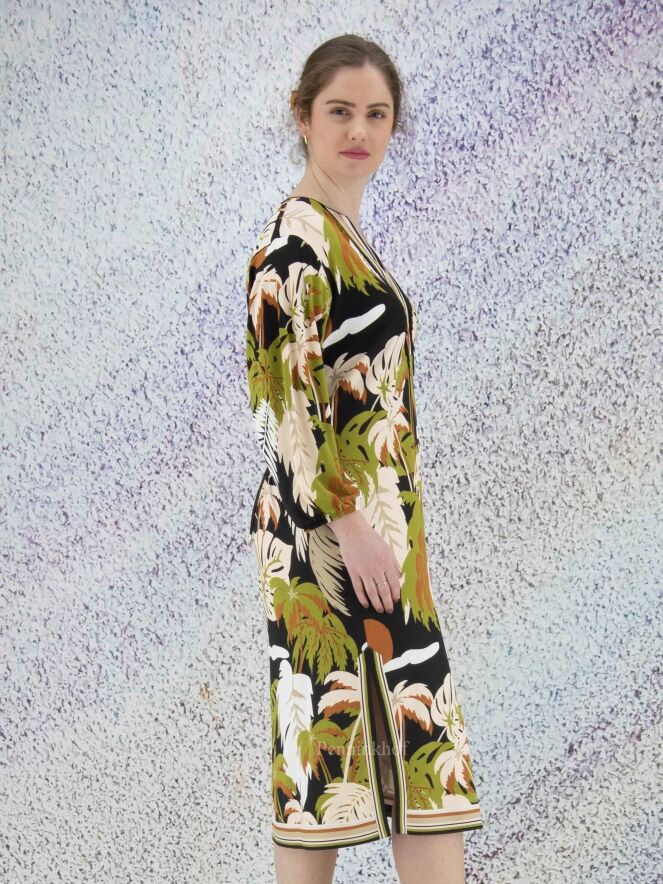 Robe sans col de la marque Marc Cain, à imprimé de feuilles vert pistache, cognac, blanc crème et noir. L'encolure en V est bordée d'un liseré à rayures à petites perles noires. De profondes fentes latérales sont bordées d'un passepoil rayé. L'extrémité des manches longues est bordée d'un élastique qui provoque de fines fronces. Lavage à 30 degrés.