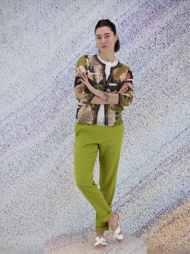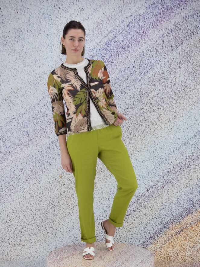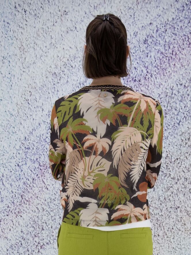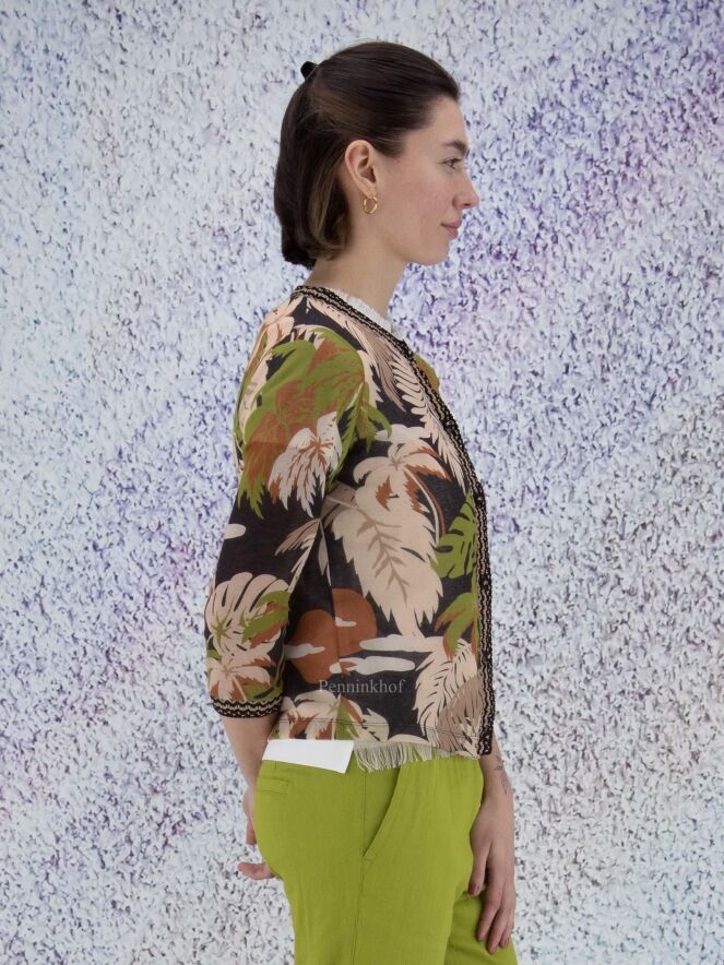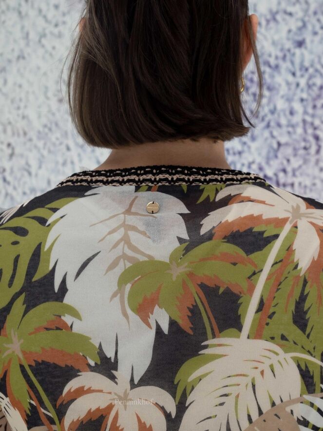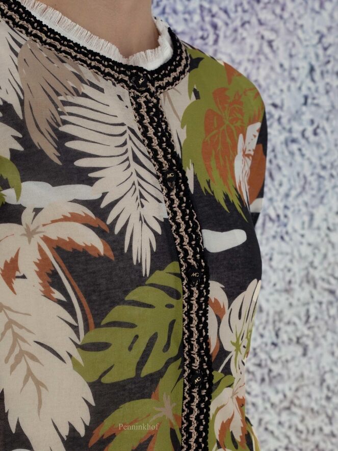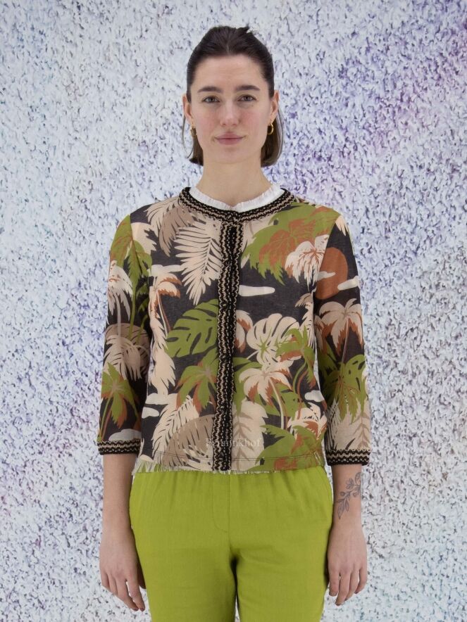 Cardigan de la marque Marc Cain, légèrement transparent, imprimé de feuilles et de palmiers aux couleurs blanc, pèche, noir, cognac, vert pistache et taupe. Une bordure tressée, aux couleurs noir et sable, orne le col, la patte de boutonnage et les bas des manches. Lavage à 30 degrés.