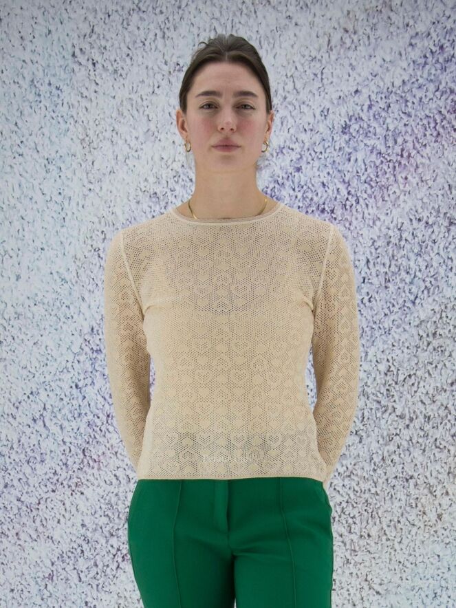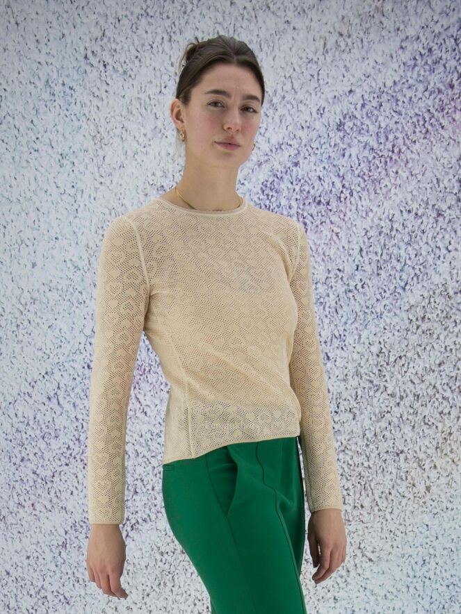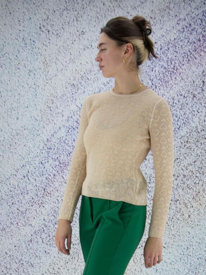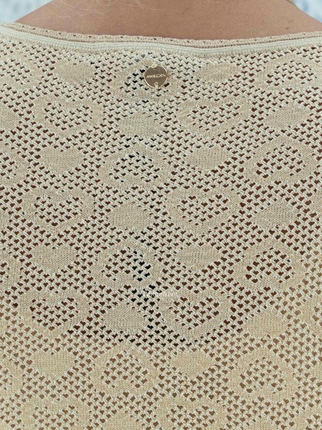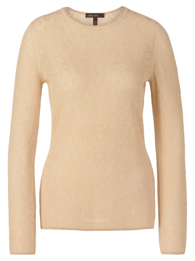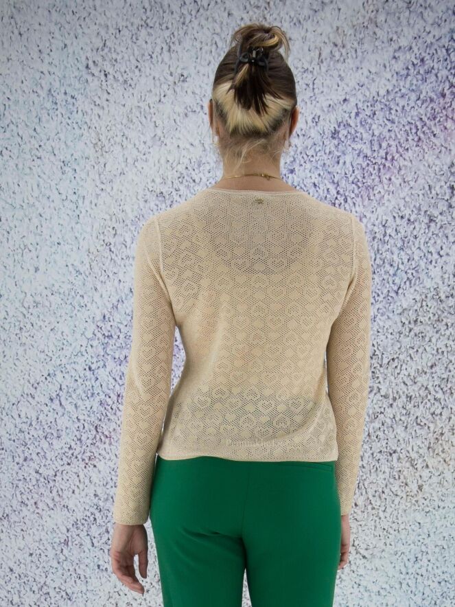 Tee-shirt perforé de la marque Marc Cain, de couleur nude avec un fil doré à travers le tissu. Deux modèles de cœurs sont tissés dans le tissu. Le col est bordé d'un liseré ajouré. Lavage à 30 degrés.