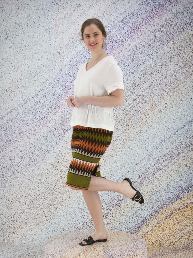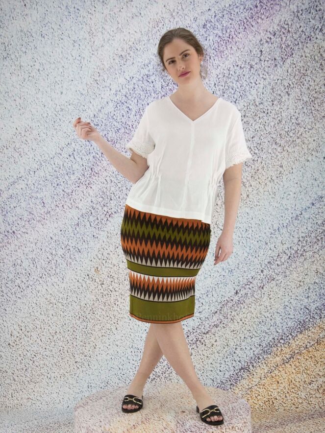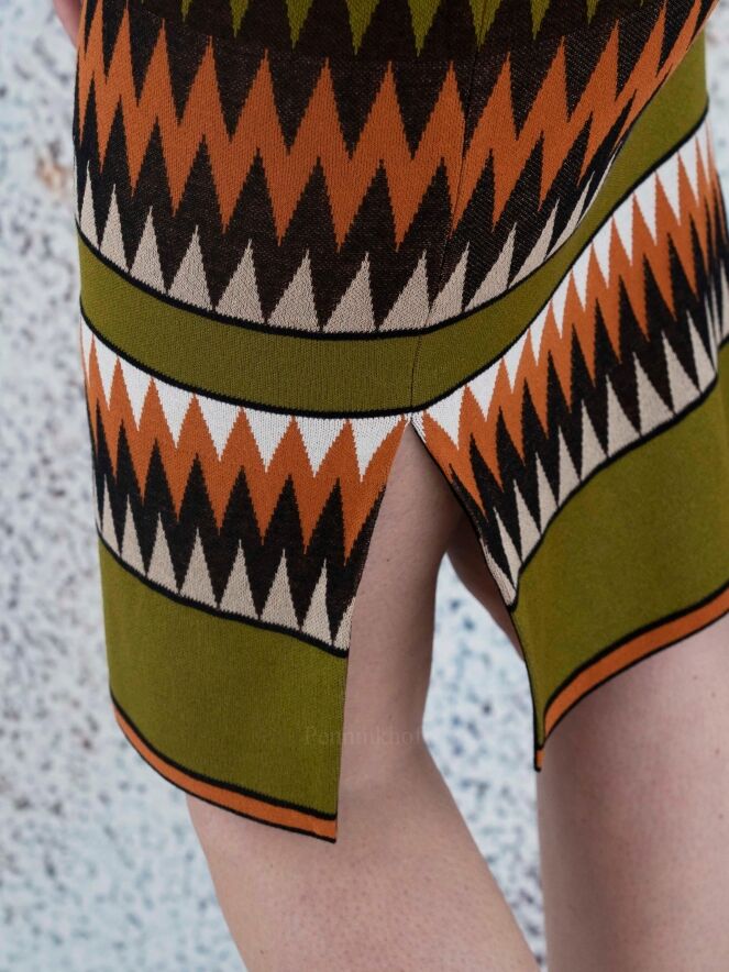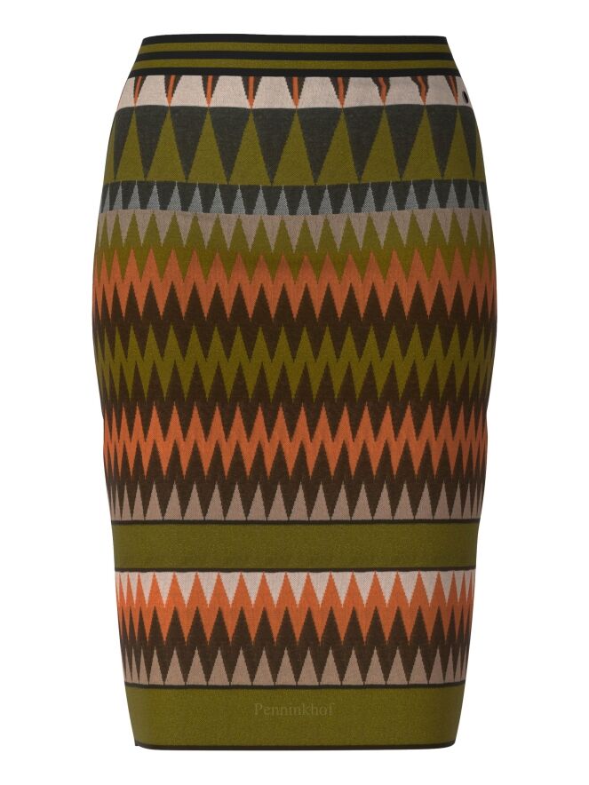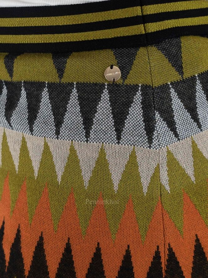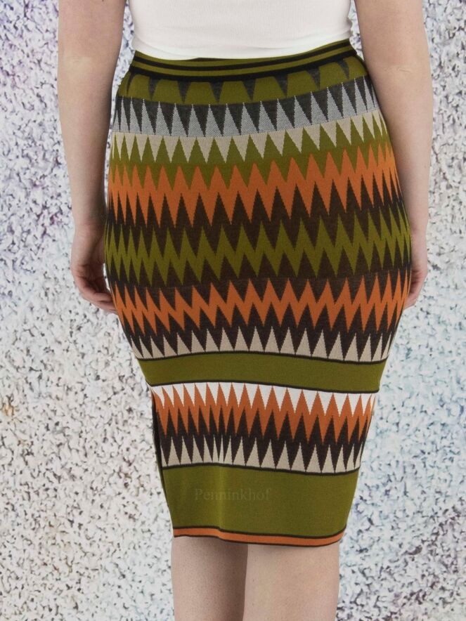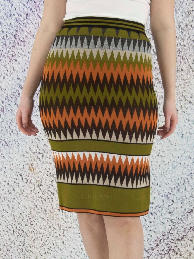 Jupe à la coupe ajustée de la marque Marc Cain, imprimée de lignes en zigzag graphique aux couleurs vert pistache, orange, blanc crème et noir. La taille est dotée d'une bande élastiquée à rayures. Une fente d'aisance est présente sur le côté gauche. Ce modèle est doublé. Lavage à 30 degrés.
