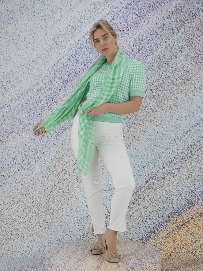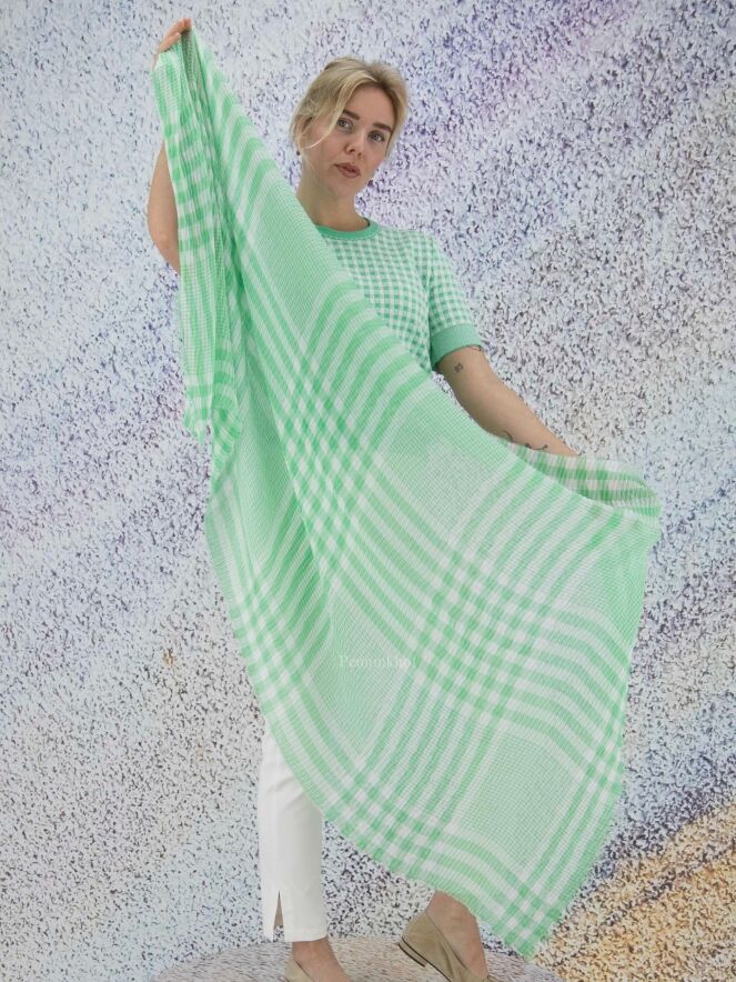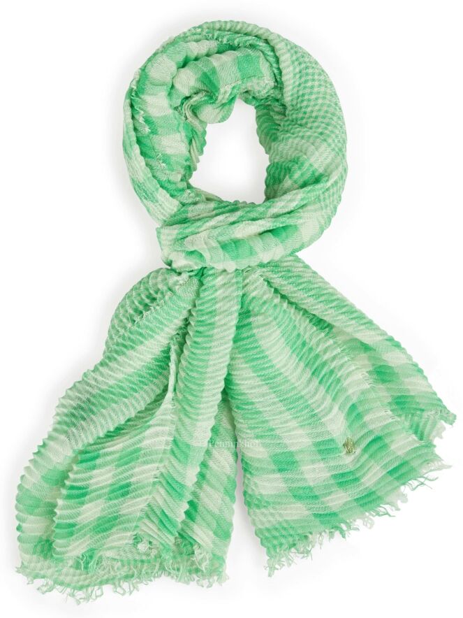 Echarpe légèrement transparente de la marque Marc Cain, à imprimé vichy très doux de couleur verte et blanche. Le tissu est plissé et les extrémités finement frangées. Lavage à la main.