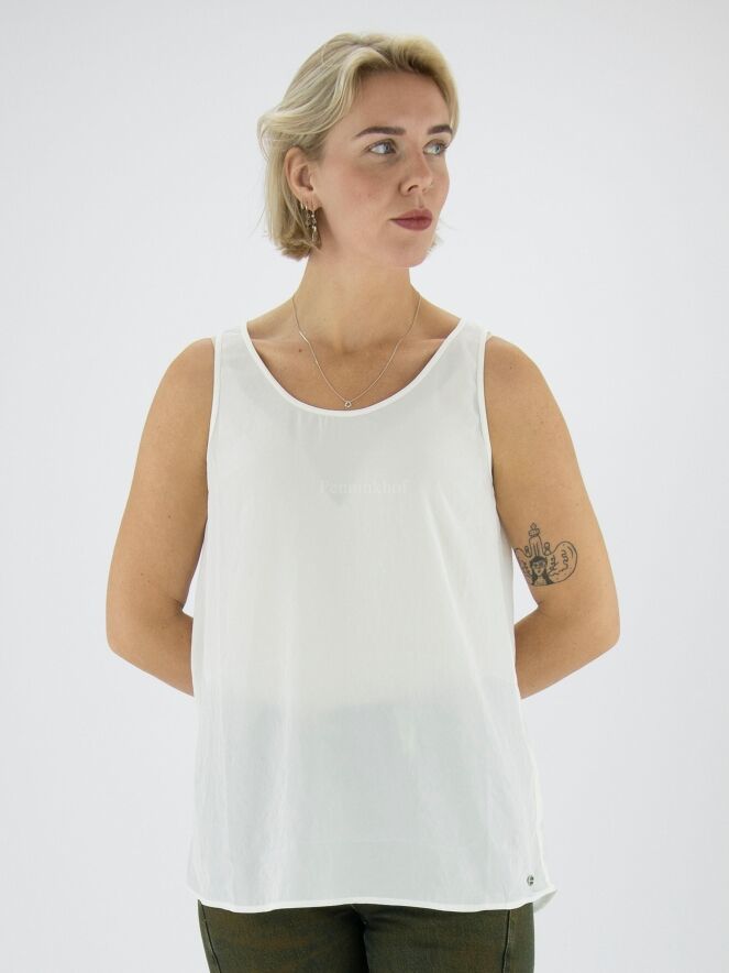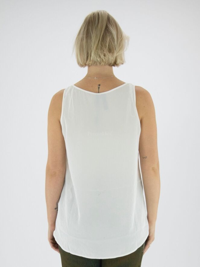 Top Marc Cain en tissu lisse et mat de couleur blanc crème. Le top a une encolure ronde et peut être lavé à 30 degrés.