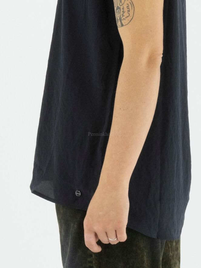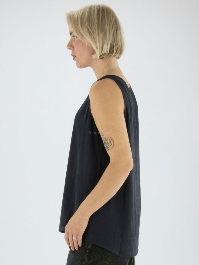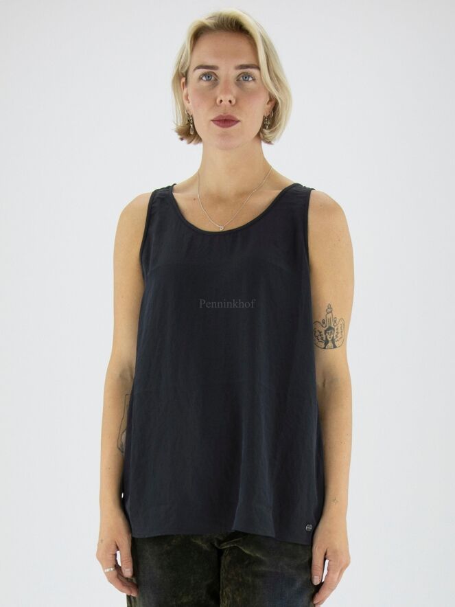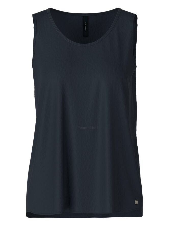 Top Marc Cain en tissu lisse et mat de couleur bleu marine. Le top a une encolure ronde et peut être lavé à 30 degrés.