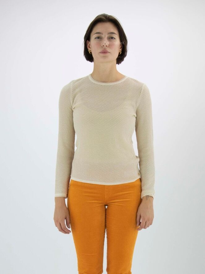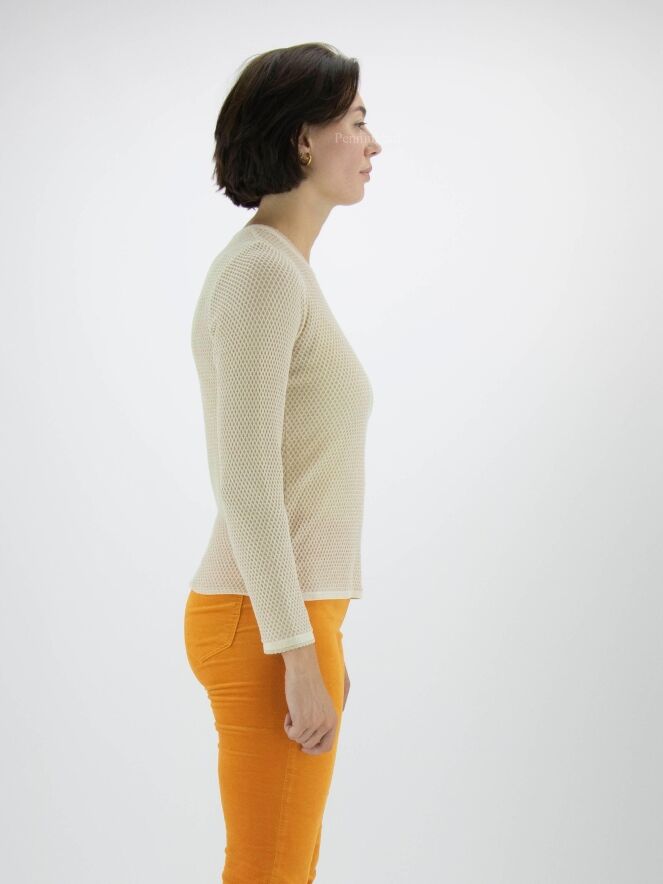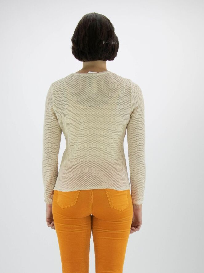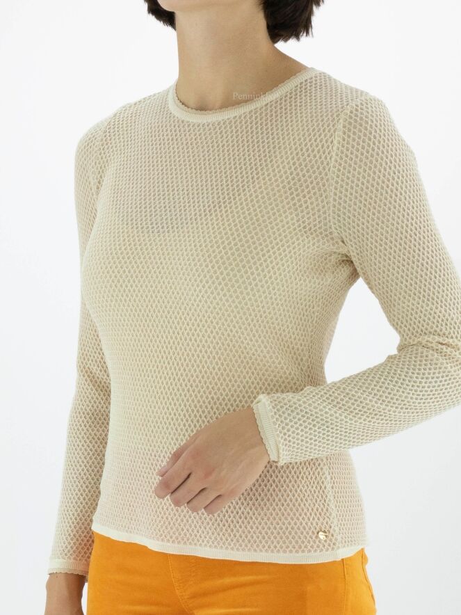 Pull de Marc Cain avec un motif de rat dans la couleur sable. Un fil doré est tissé à travers le tissu. Une bordure écaillée borde l'encolure ronde et l'extrémité des manches longues. Ce pull peut être lavé à 30 degrés.