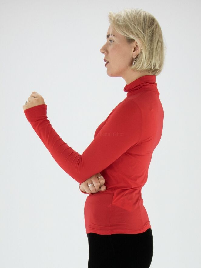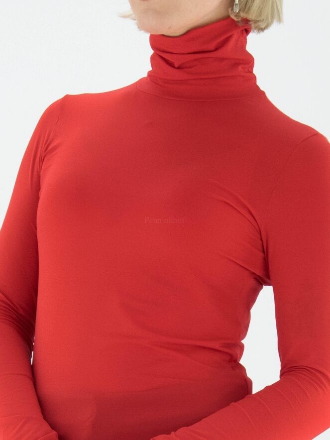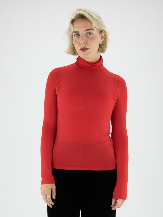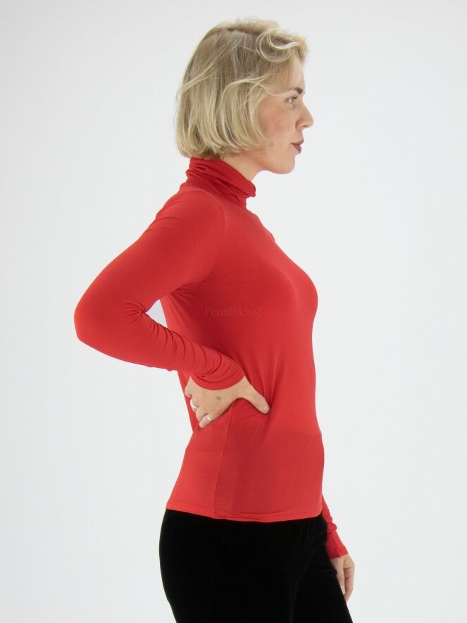 Une chemise à collants de Marc Cain de couleur rouge. La T - shirt a un col roulé et des manches longues et peut être lavée à 30 degrés.
