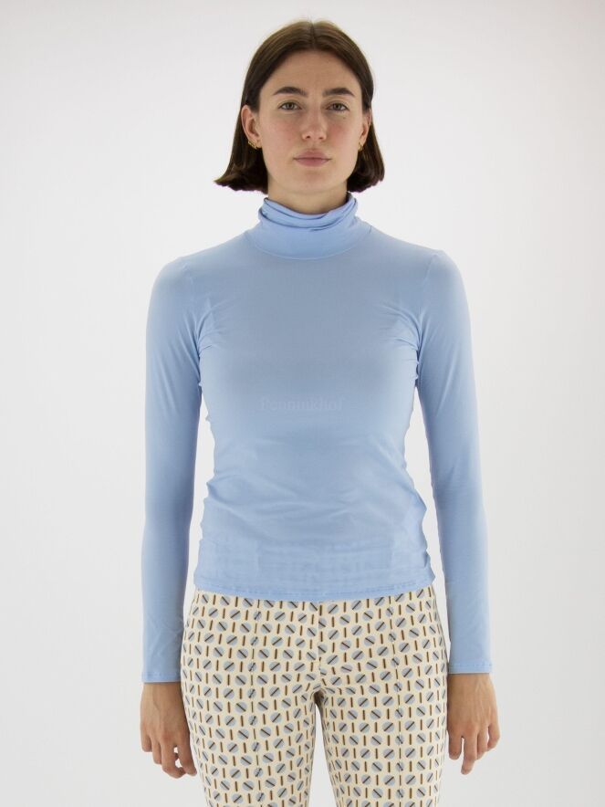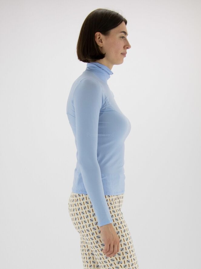Tee-shirt légèrement transparent de la marque Marc Cain, de couleur bleu glacier. Le tee-shirt présente un col roulé et des manches longues. Lavage à 30 degrés.