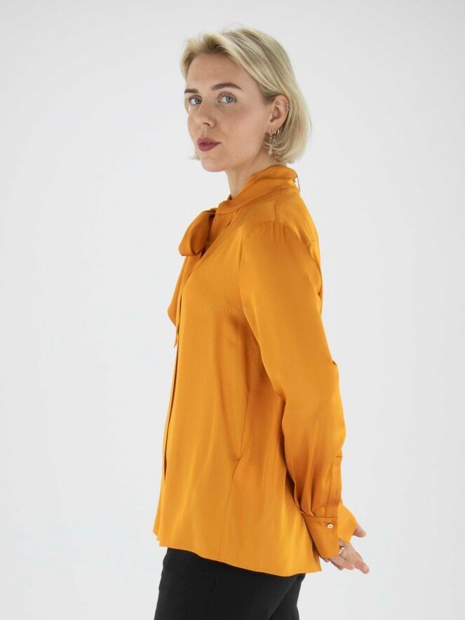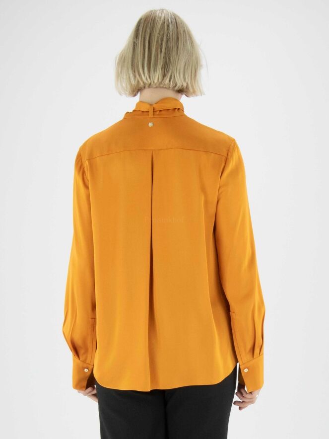 Blouse en satin mat de Marc Cain de couleur orange. Au centre de l'encolure se trouve une découpe en V au niveau du buste avec une couture vers le bas. Des deux côtés de la découpe et de la couture se trouve un passepoil en double tissu. Un ruban du même tissu que le chemisier part de l'encolure. Ce chemisier ne doit pas être lavé.