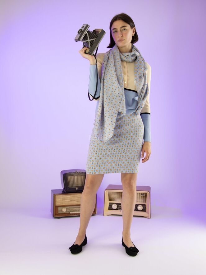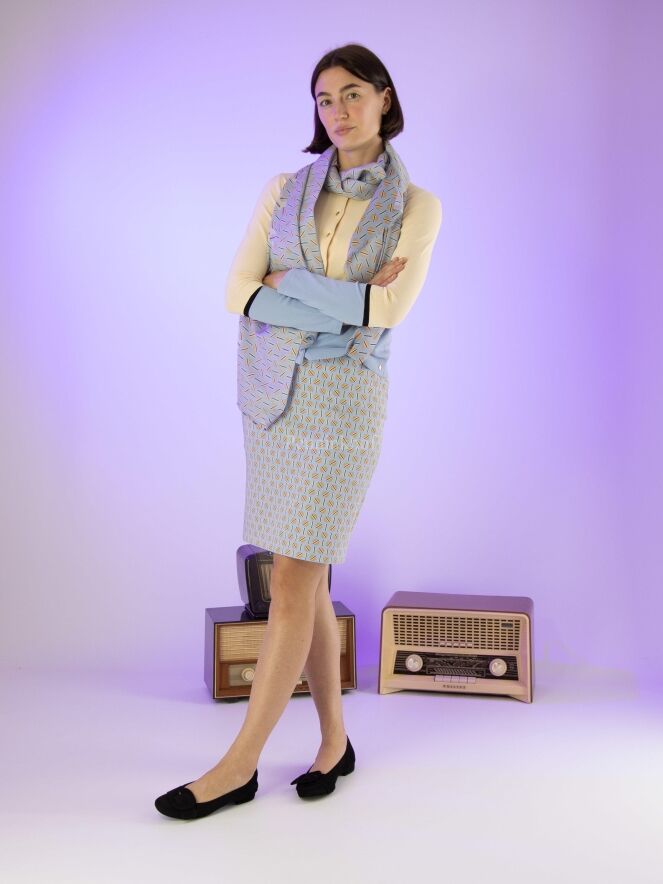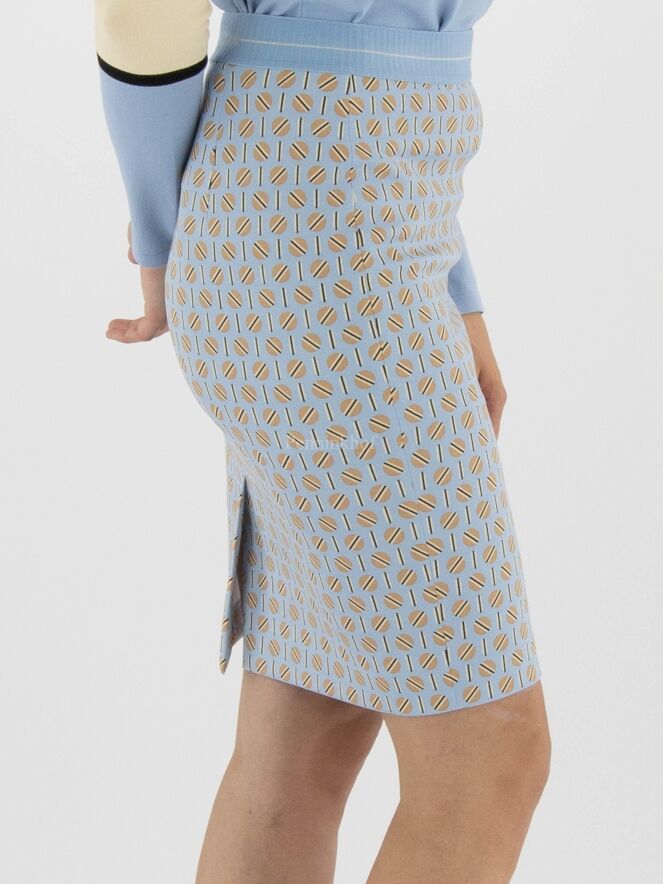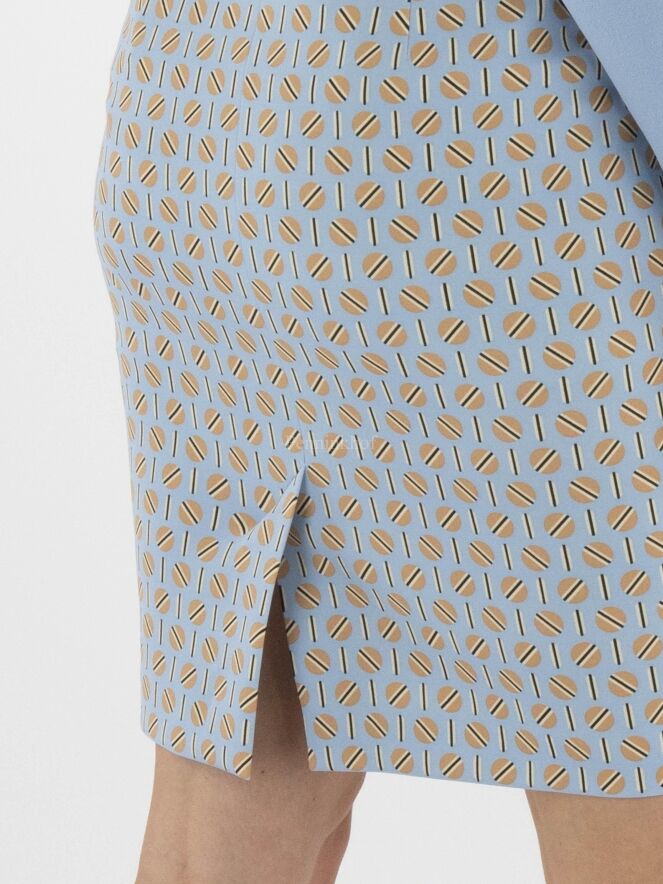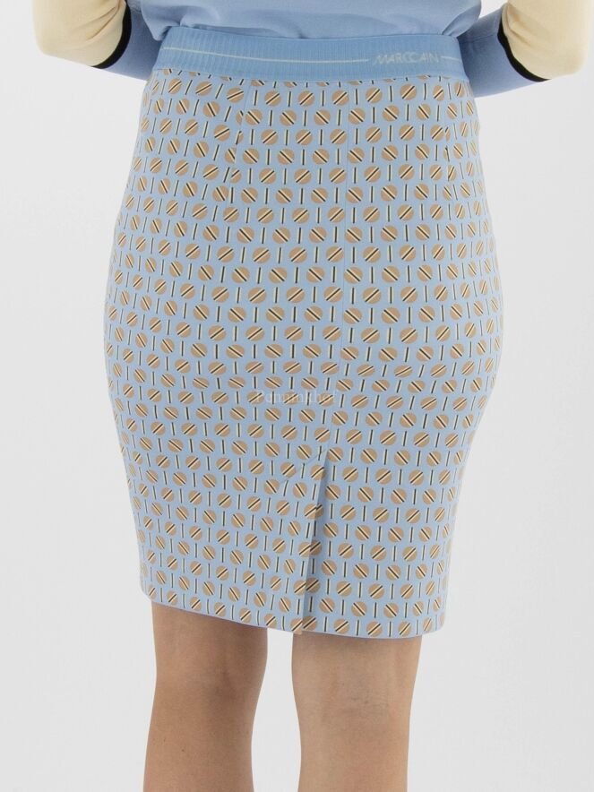 Jupe de la marque Marc Cain, à imprimé graphique aux couleurs sable, taupe et noir sur fond bleu glacier. La taille est équipée d'une ceinture élastique bleu glacier. La jupe est doublée et est dotée d'une fente d'aisance à l'arrière. Lavage à 30 degrés.