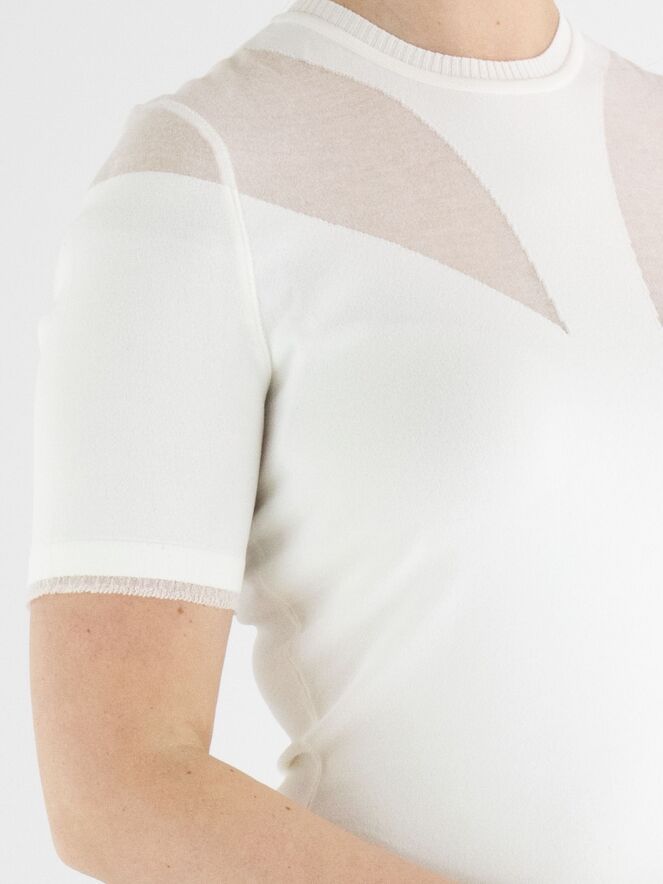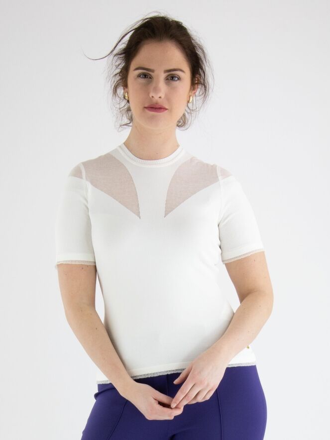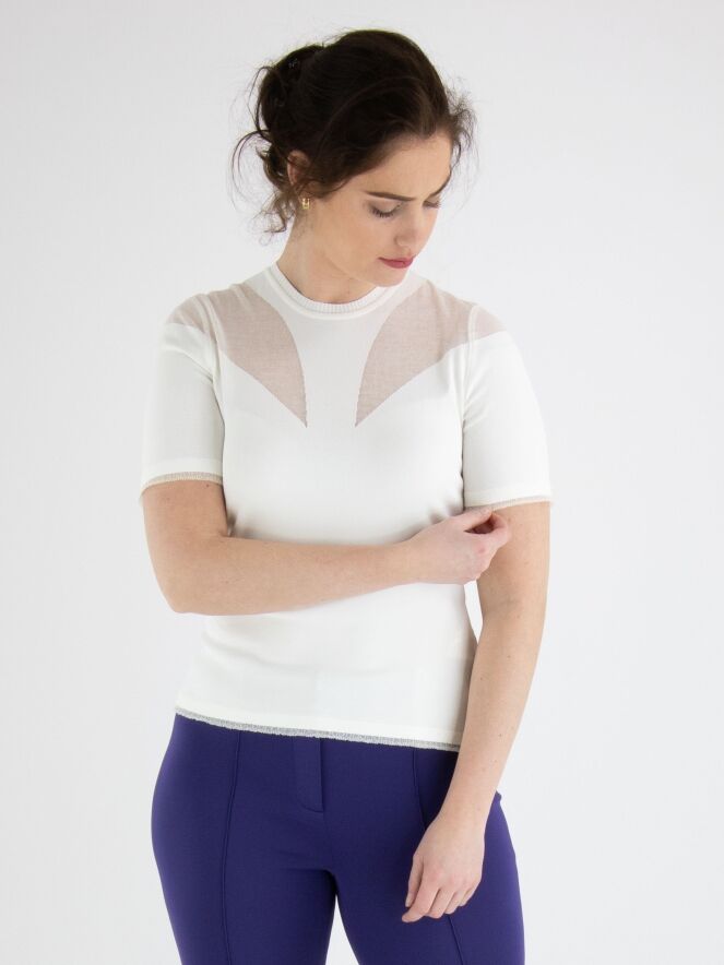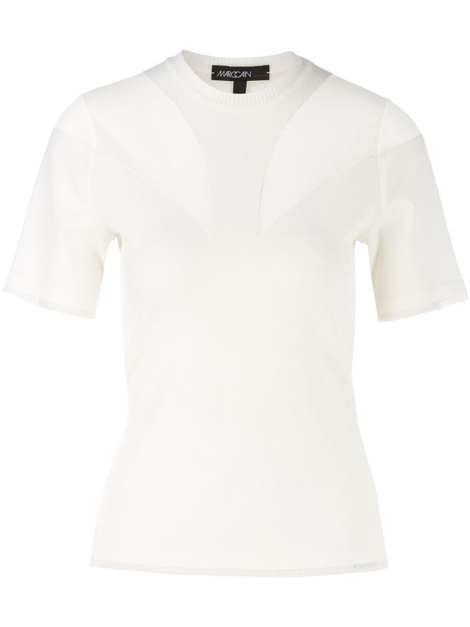 Un T-shirt de Marc Cain de couleur blanc crème. Le T-shirt a un col rond haut avec une finition en tricot finement côtelé. Le tissu est légèrement transparent en forme de goutte des épaules à la poitrine à l'avant, et à l'arrière, le tissu transparent s'étend jusqu'aux omoplates. Il y a une finition transparente finement plissée en bas. Ce T-shirt peut être lavé à 30 degrés.