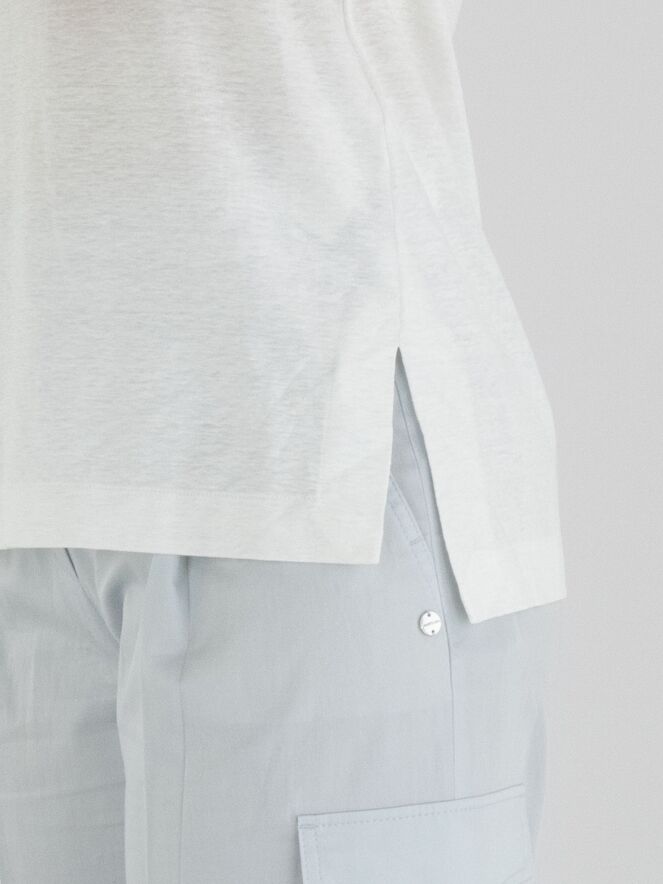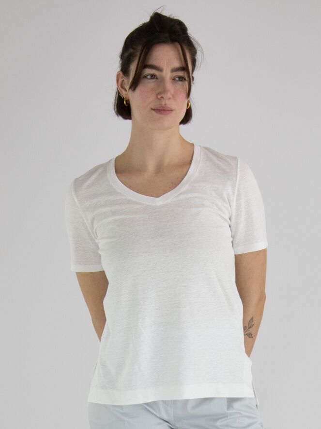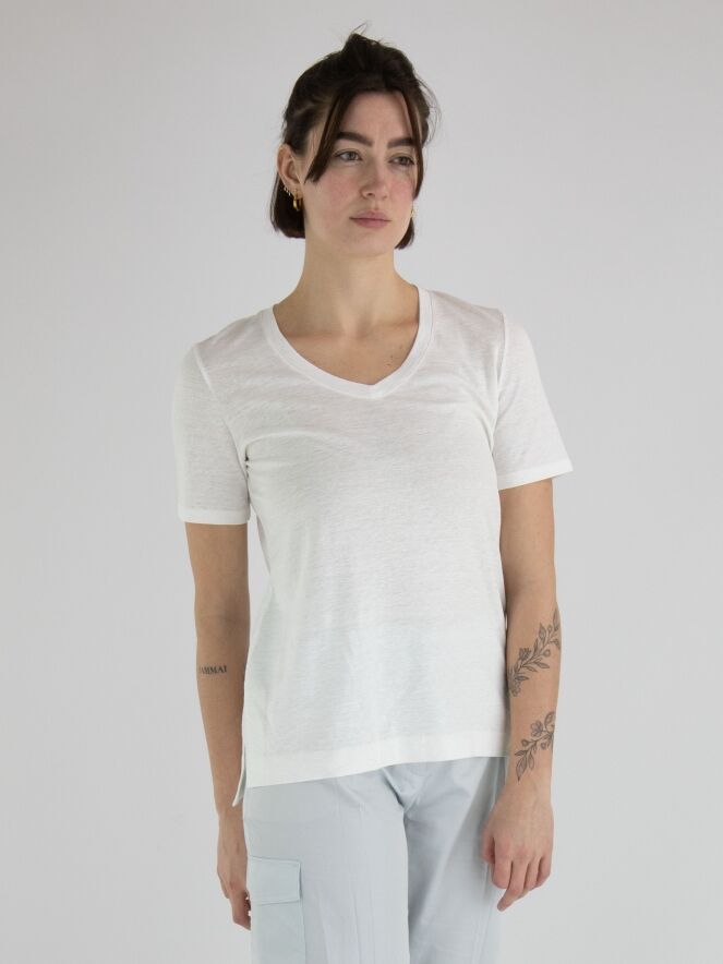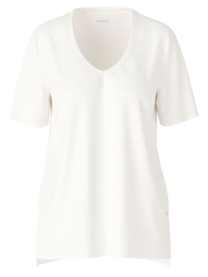 Un chemisier de Marc Cain de couleur blanche. Le chemisier présente un col en V coupé rond et des manches courtes. Il y a une courte fente de chaque côté en bas. Ce chemisier peut être lavé à 30 degrés.