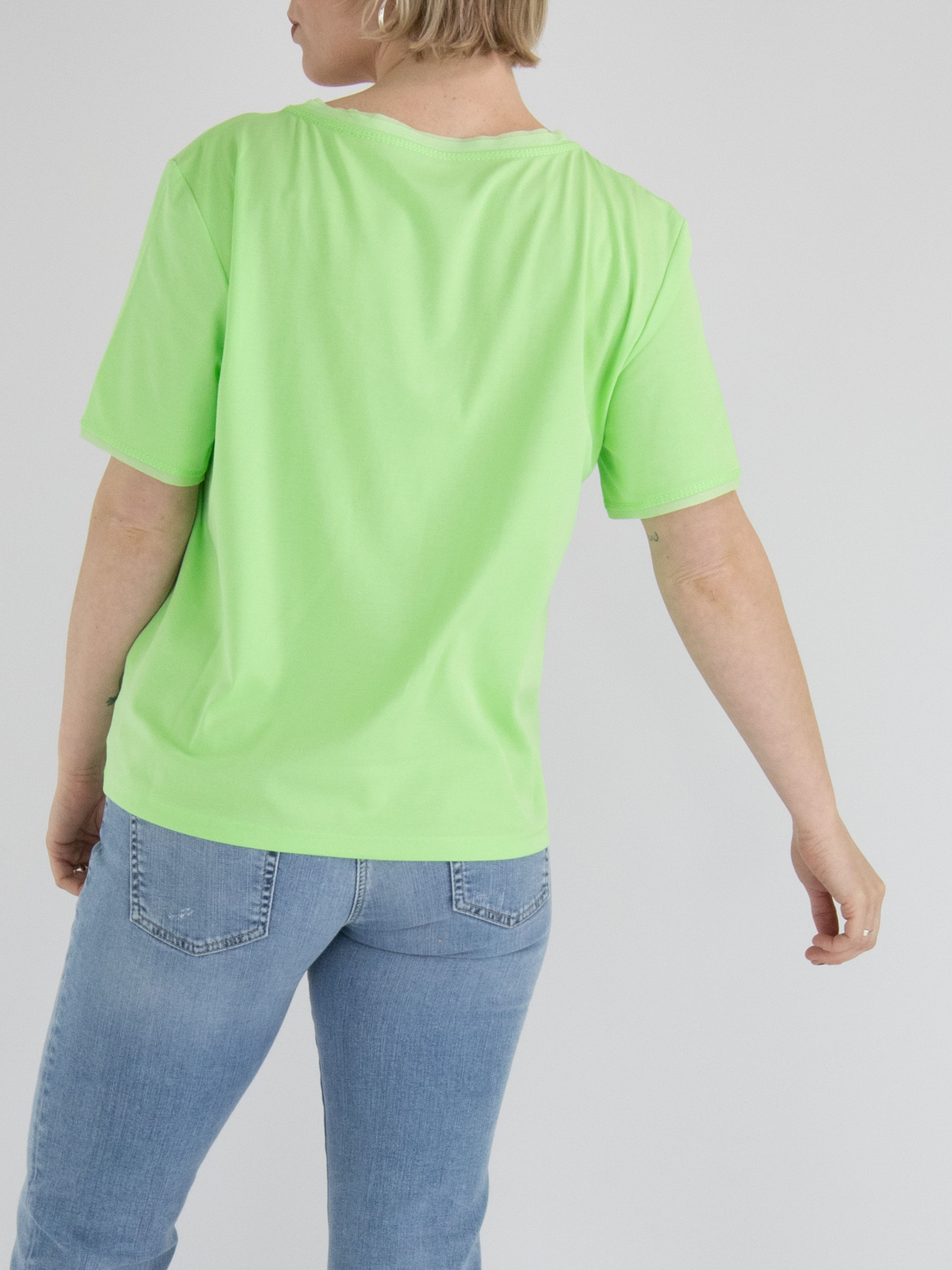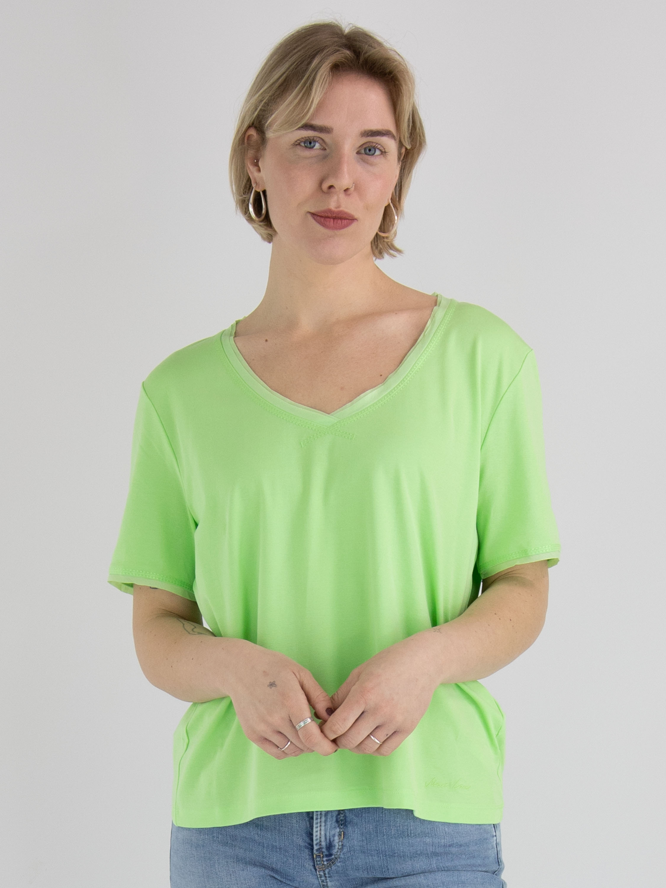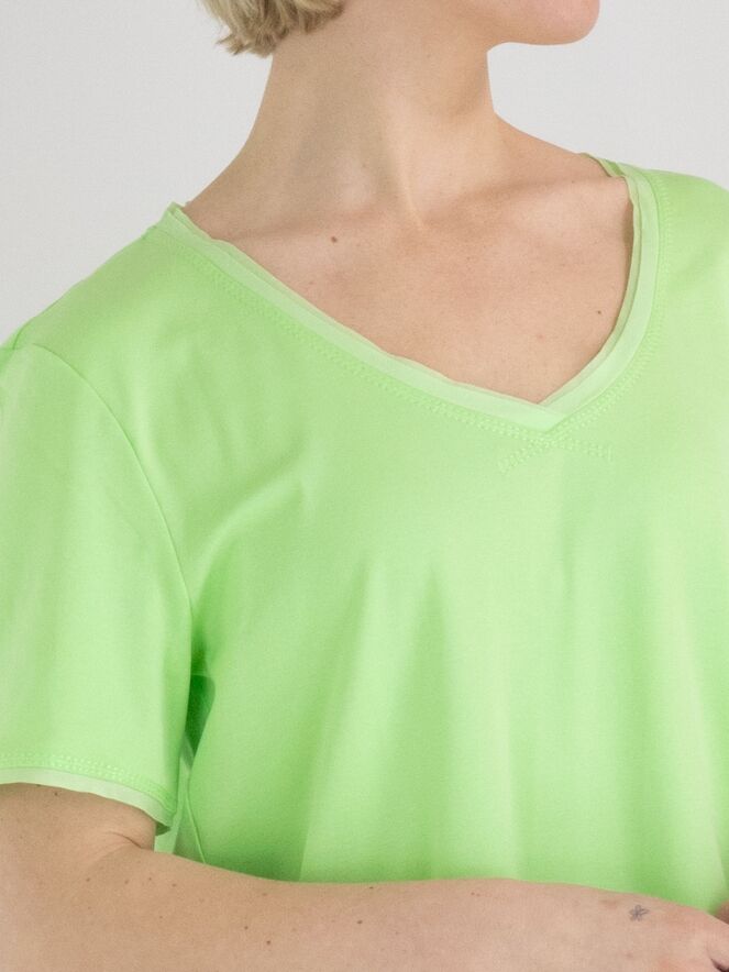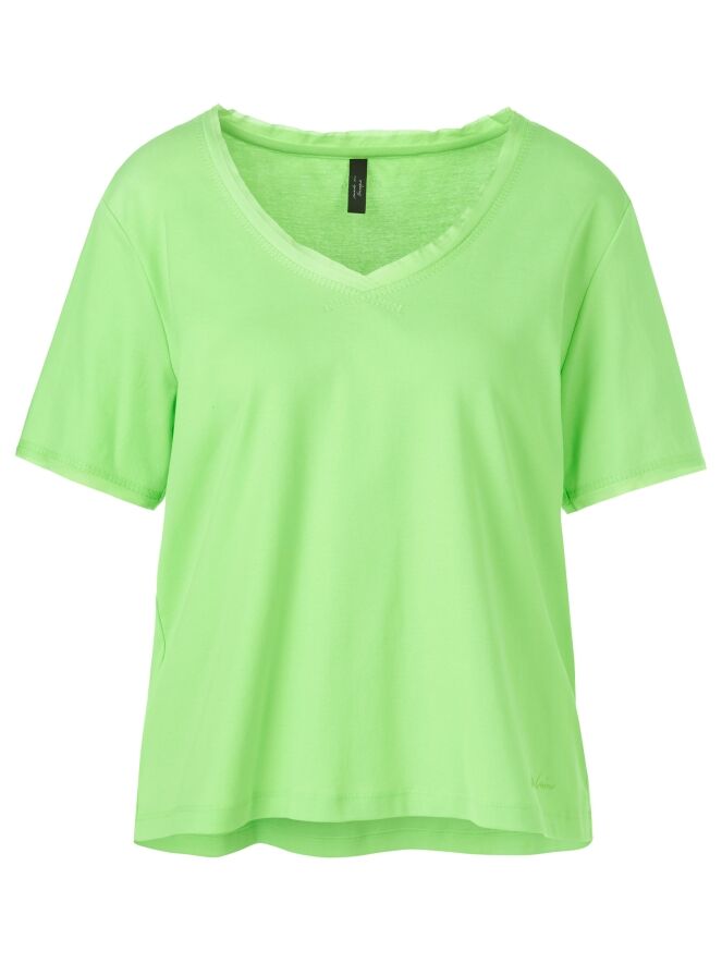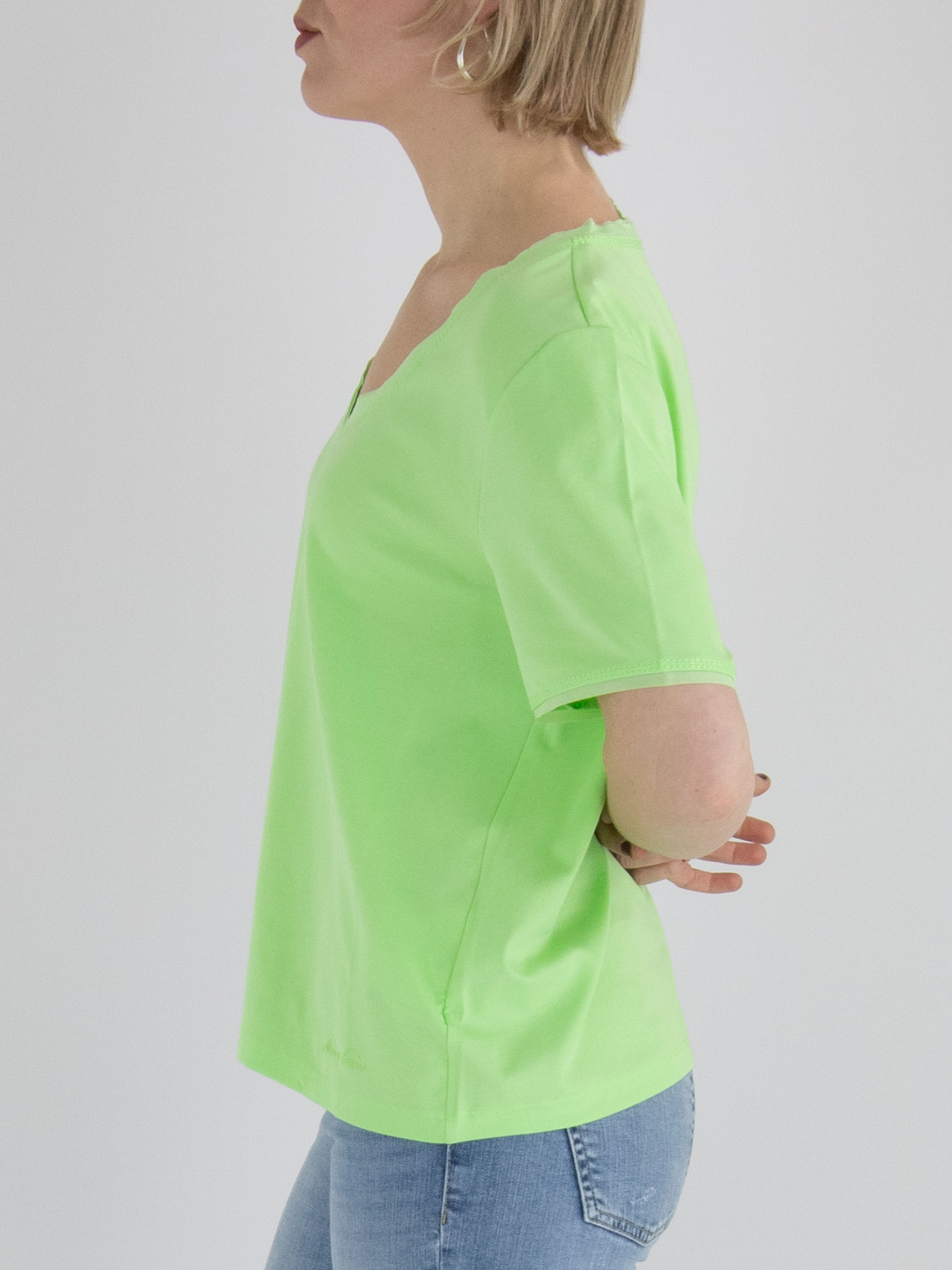 Un chemisier de Marc Cain de couleur vert pistache. Le long du bord de l'encolure en V coupée rond et des manches courtes se trouve une double garniture avec un tissu mousseline et une ligne ajourée cousue. Ce chemisier peut être lavé à 30 degrés.