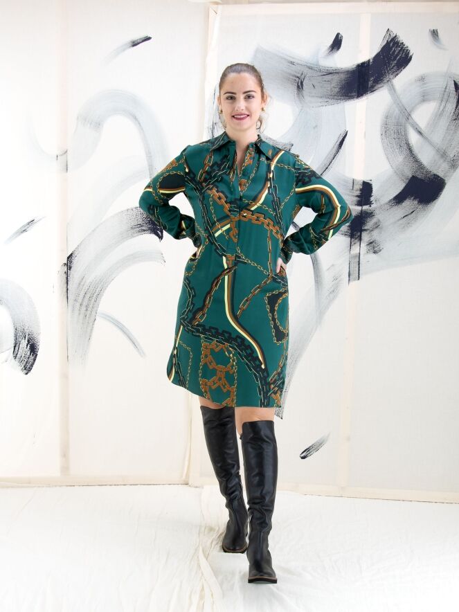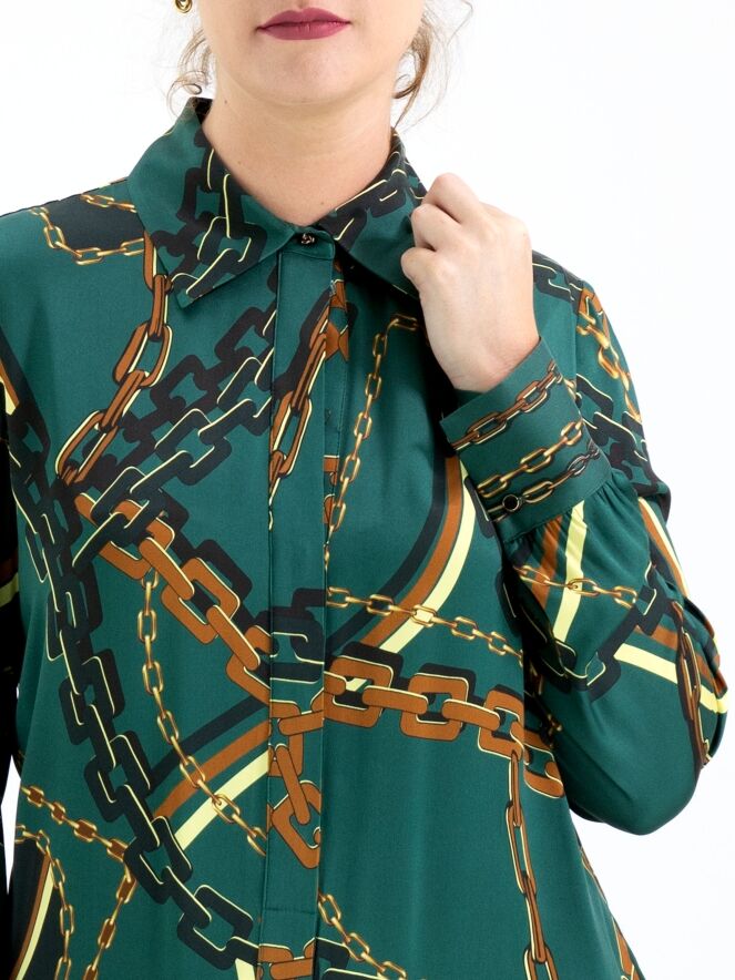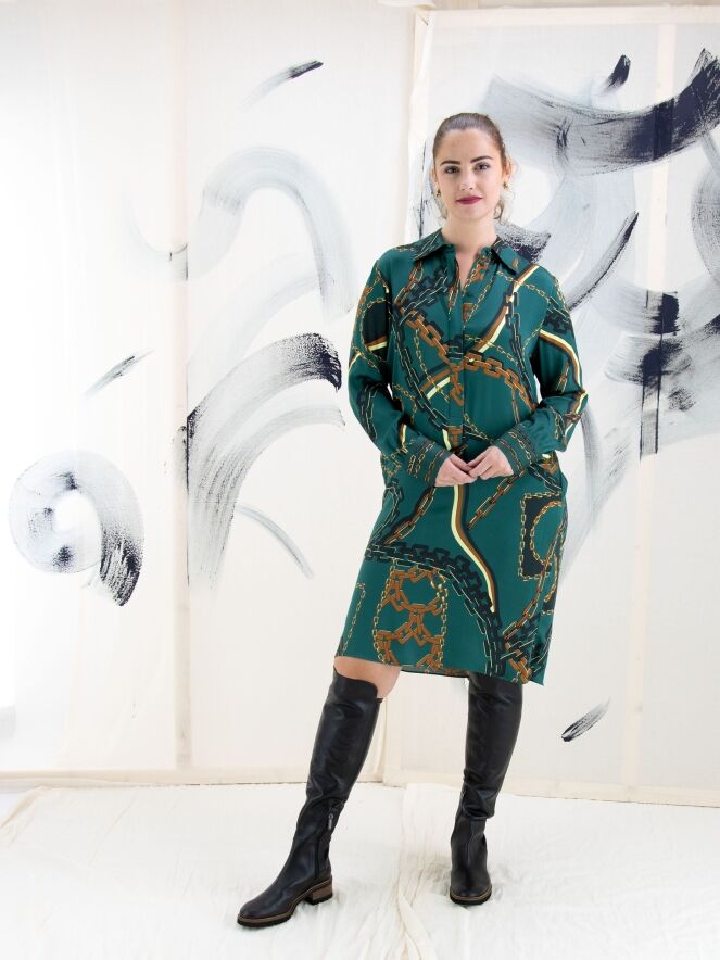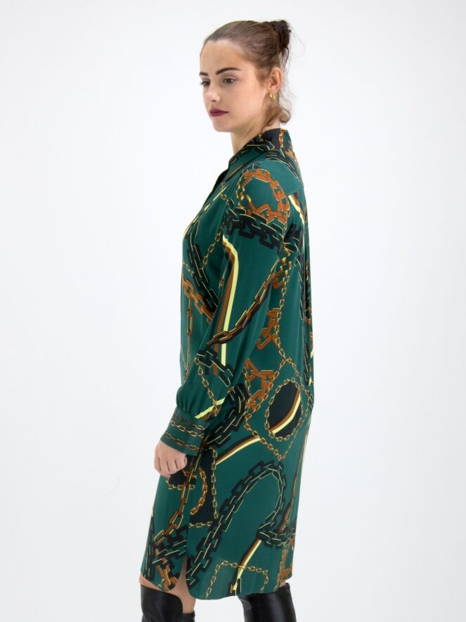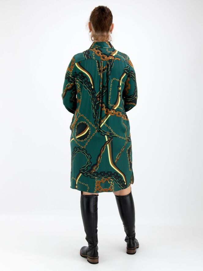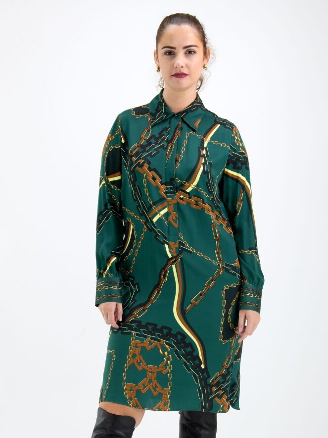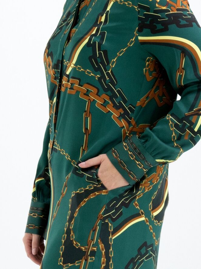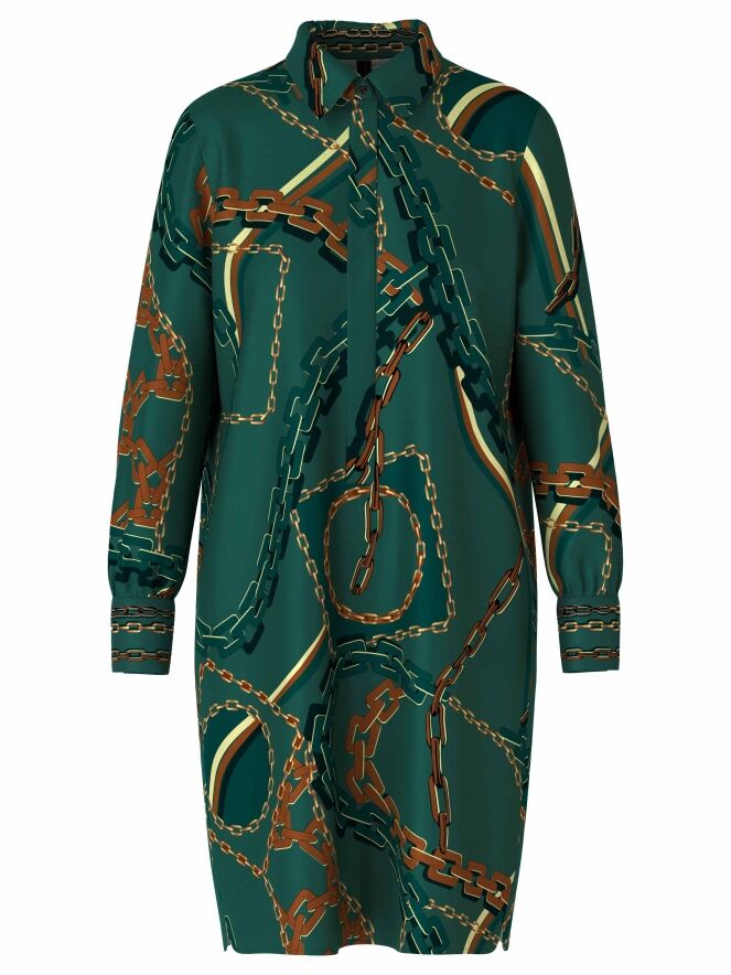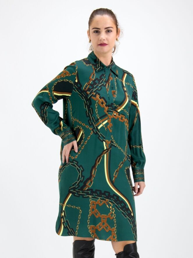 Une robe boutonnée de Marc Cain dans un imprimé Hermes avec le vert foncé comme couleur de base. La robe a une fermeture cachée jusqu'en dessous de la taille et doit être lavée à la main.