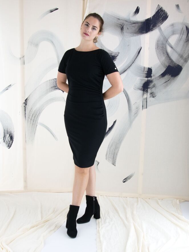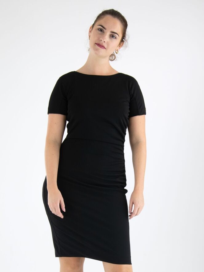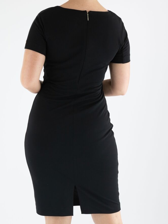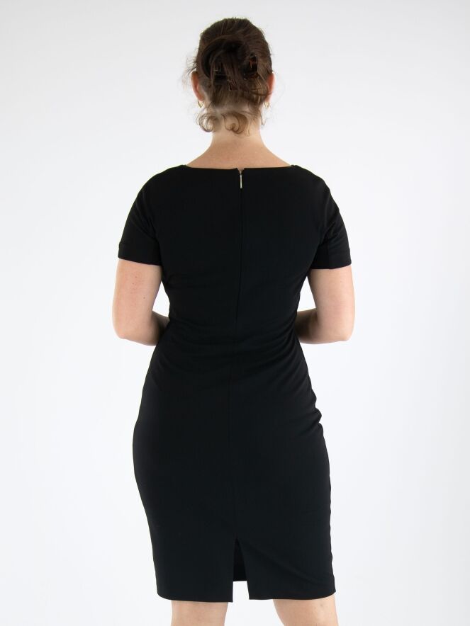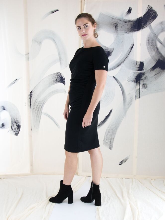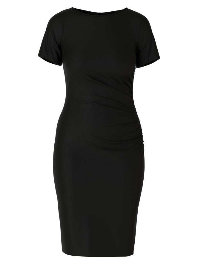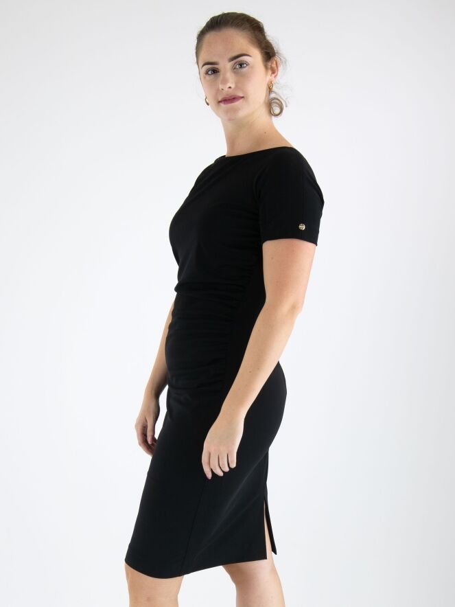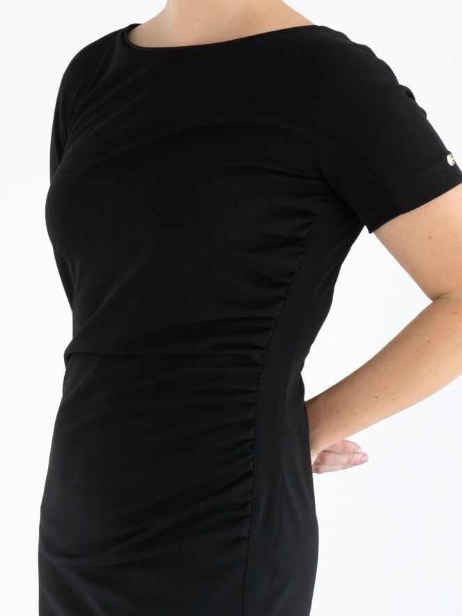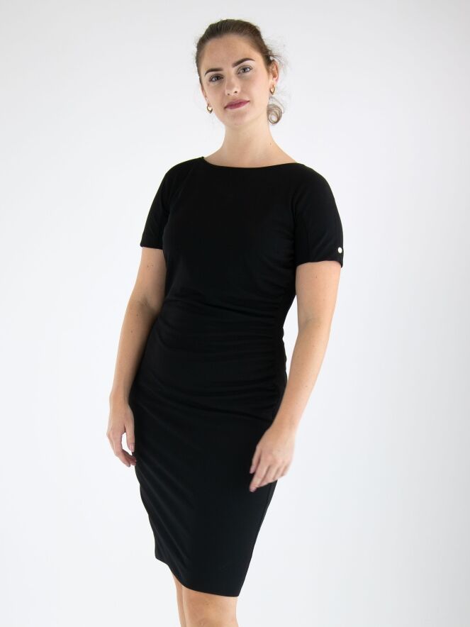 Une robe de Marc Cain en noir. Sur le côté gauche, le tissu est finement plissé le long de la couture, créant un effet de drapé à l'avant. La robe a des manches courtes, un col rond et peut être lavée à 30 degrés.