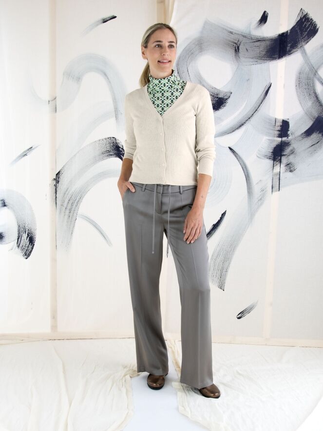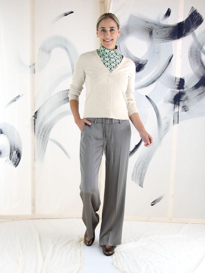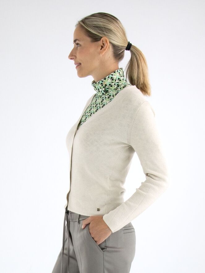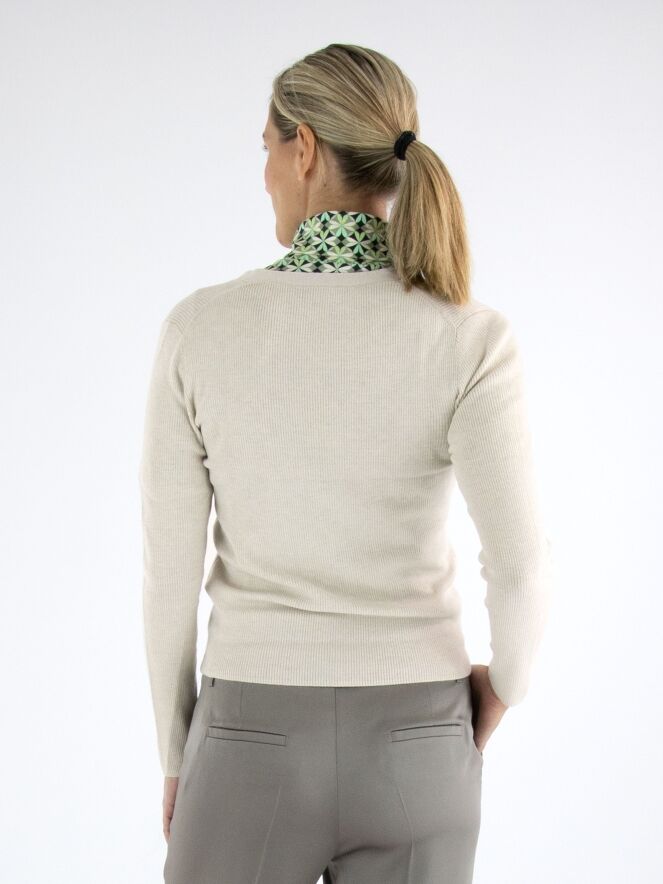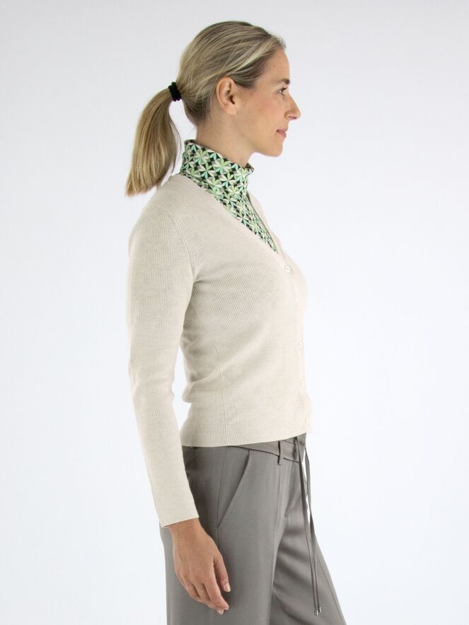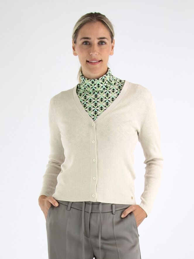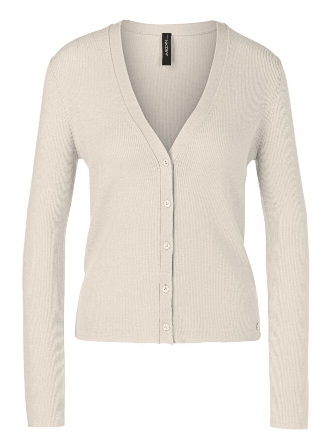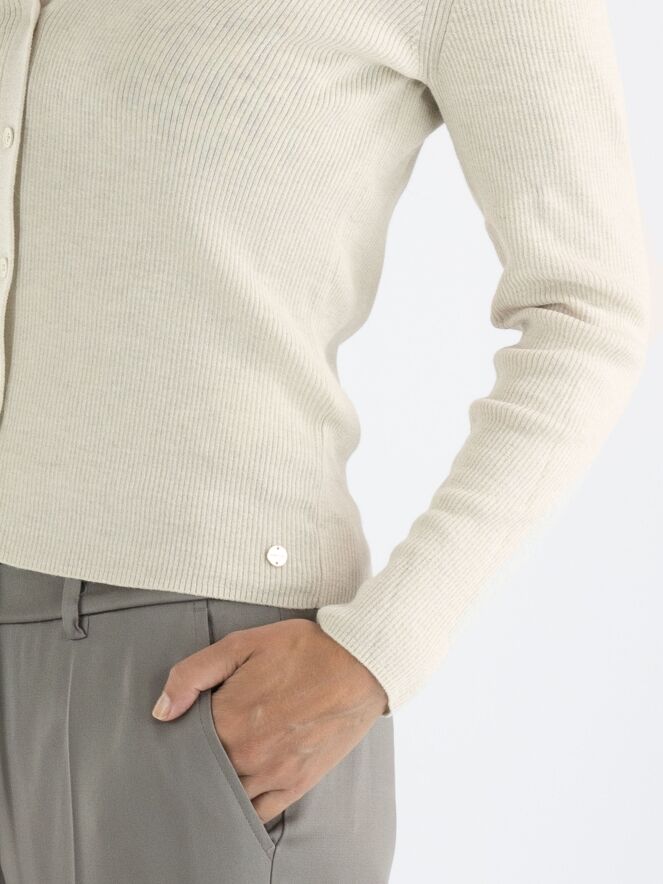 Un gilet de Marc Cain en couleur beige. Le tissu est finement côtelé avec un fil doré tissé à travers. Le gilet a une fermeture à boutons et doit être lavé à la main.