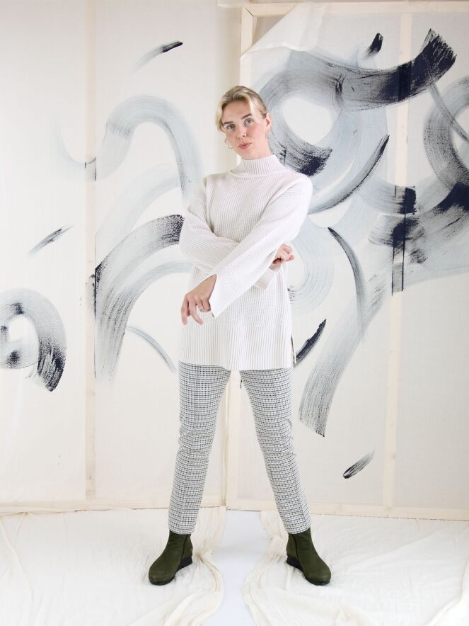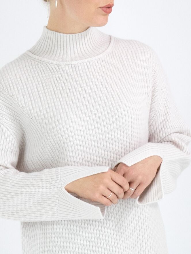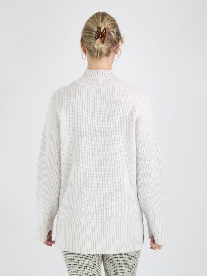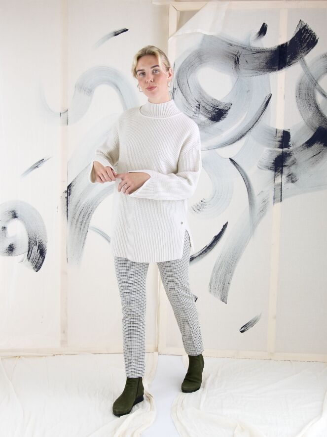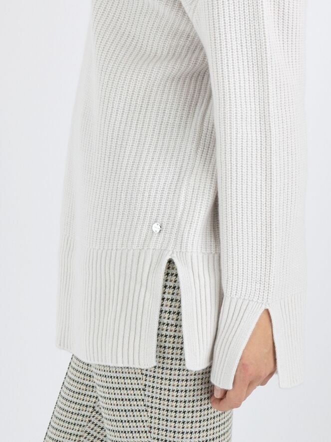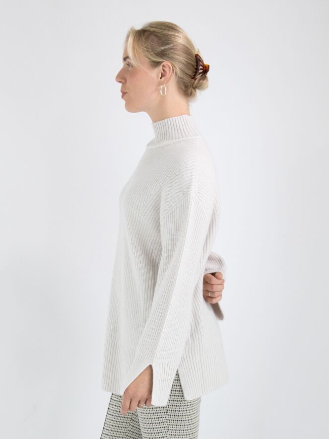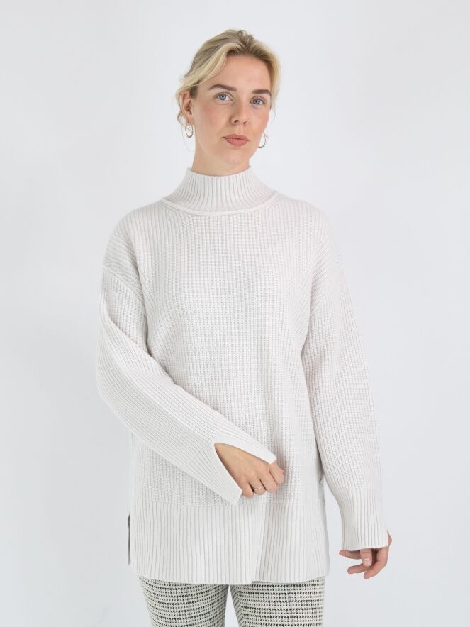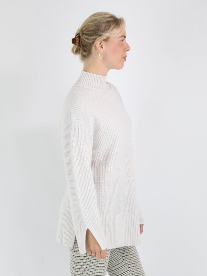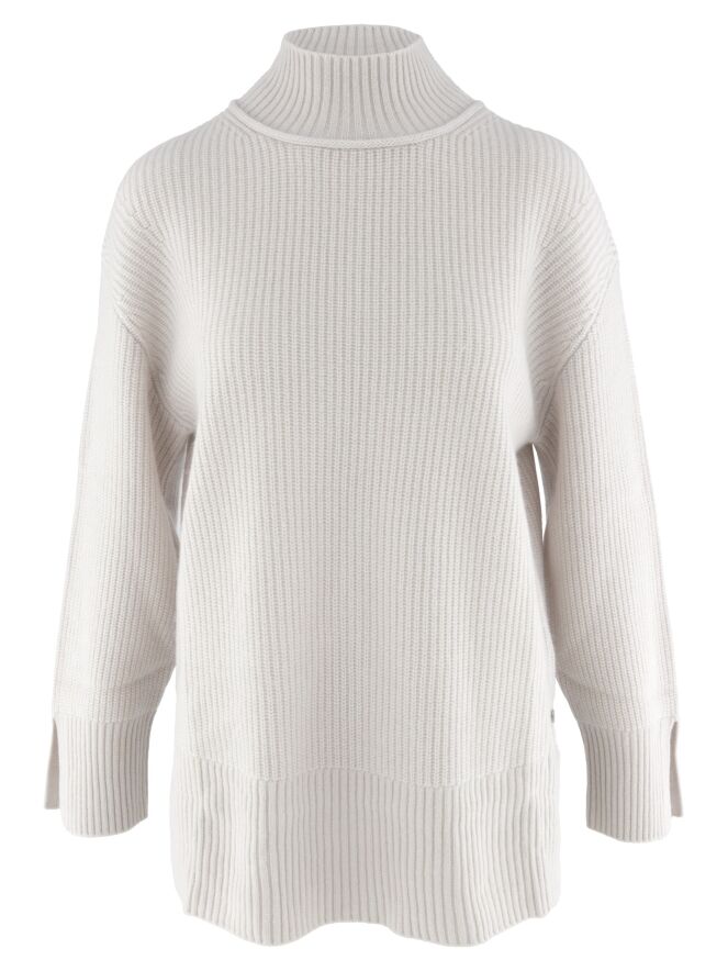 Un pull ample de Marc Cain, tricoté en point de godron, de couleur blanc crème. Le pull a un col roulé et des fentes des deux côtés en bas. Le pull a des manches longues et peut être lavé à la main.