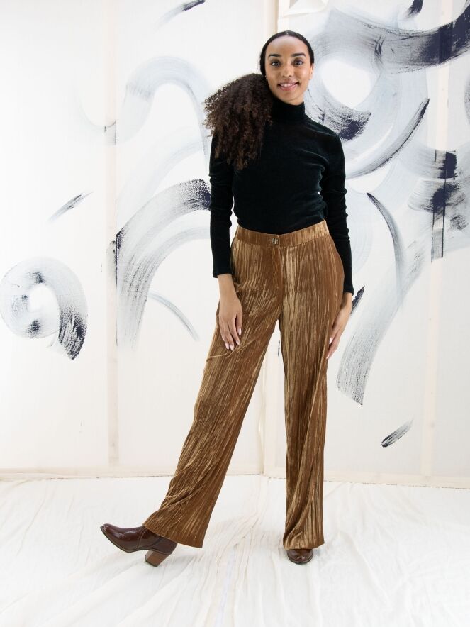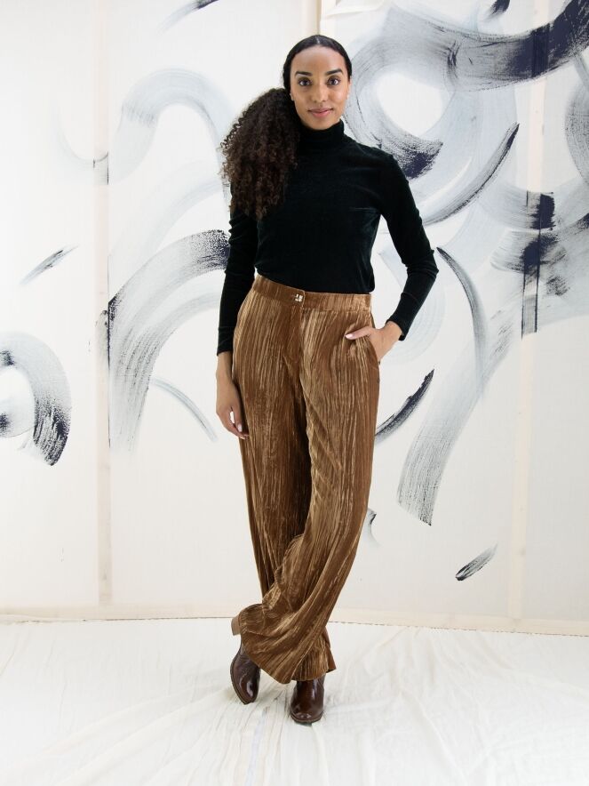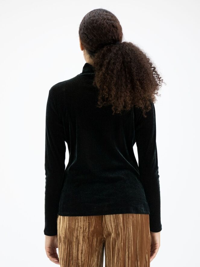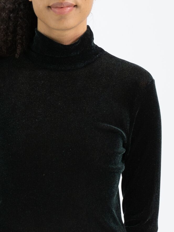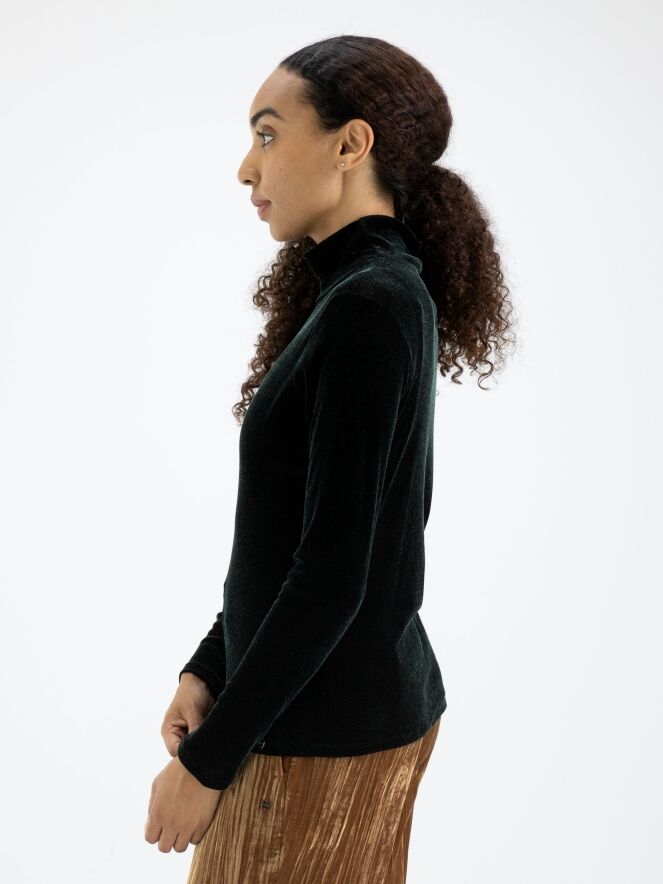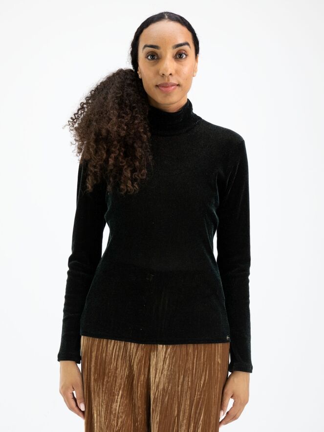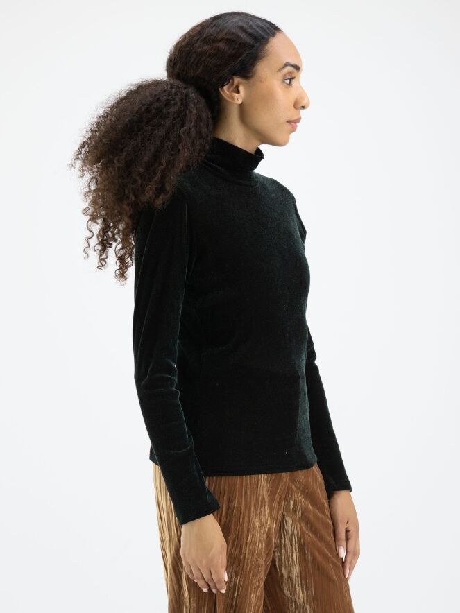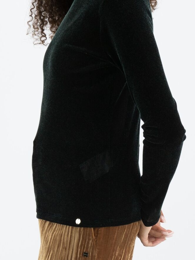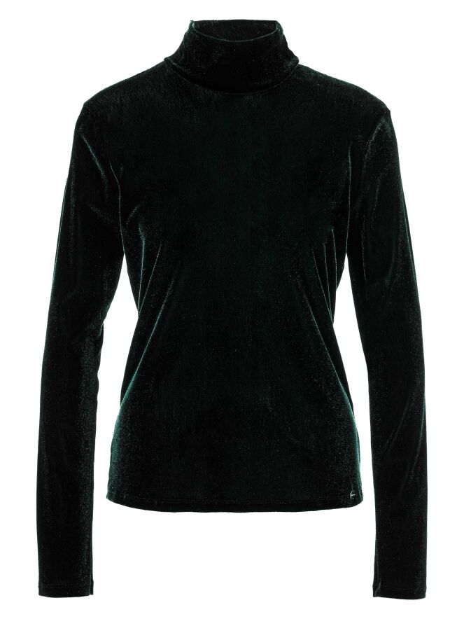 Un chemisier de Marc Cain en tissu de velours léger et transparent de couleur vert foncé. Le velours extensible a un éclat métallisé. Le chemisier a un col roulé et des manches longues et peut être lavé à 30 degrés.