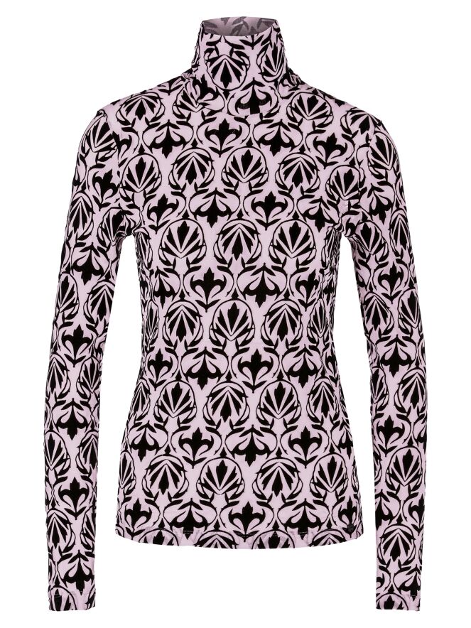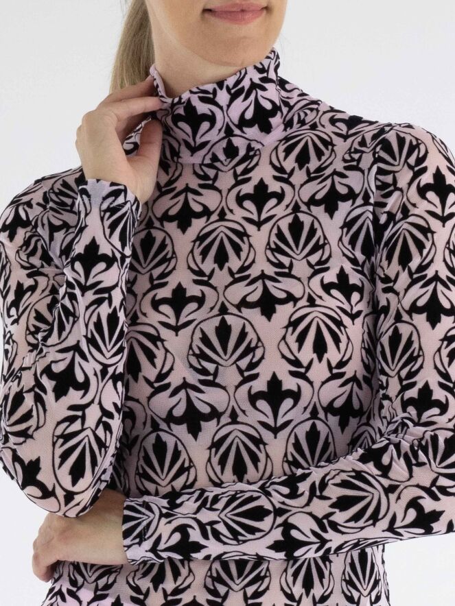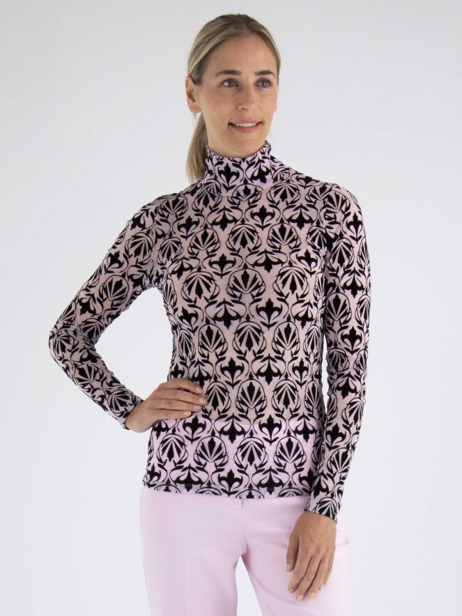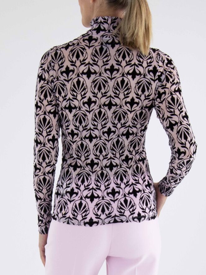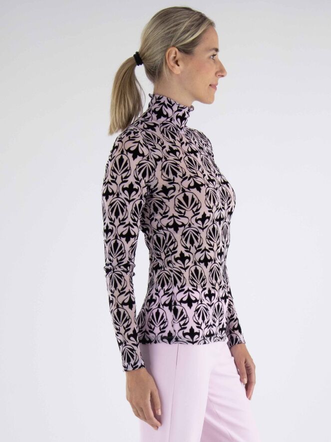 Un t-shirt transparent à effet devoré de Marc Cain avec un grand imprimé baroque en noir et rose. Les parties noires sont en velours doux. Le t-shirt a des manches longues et un col roulé. Ce t-shirt peut être lavé à 30 degrés.