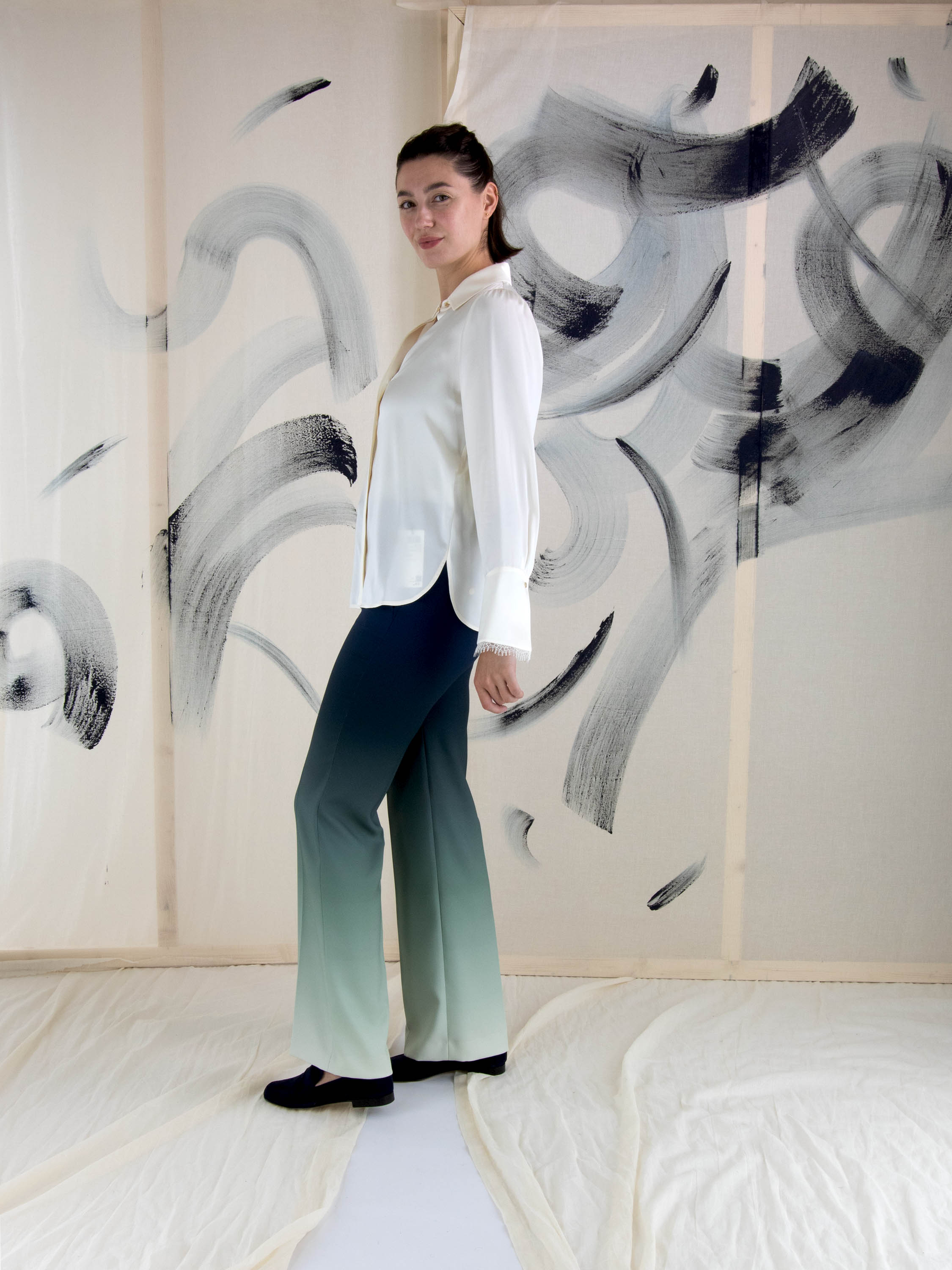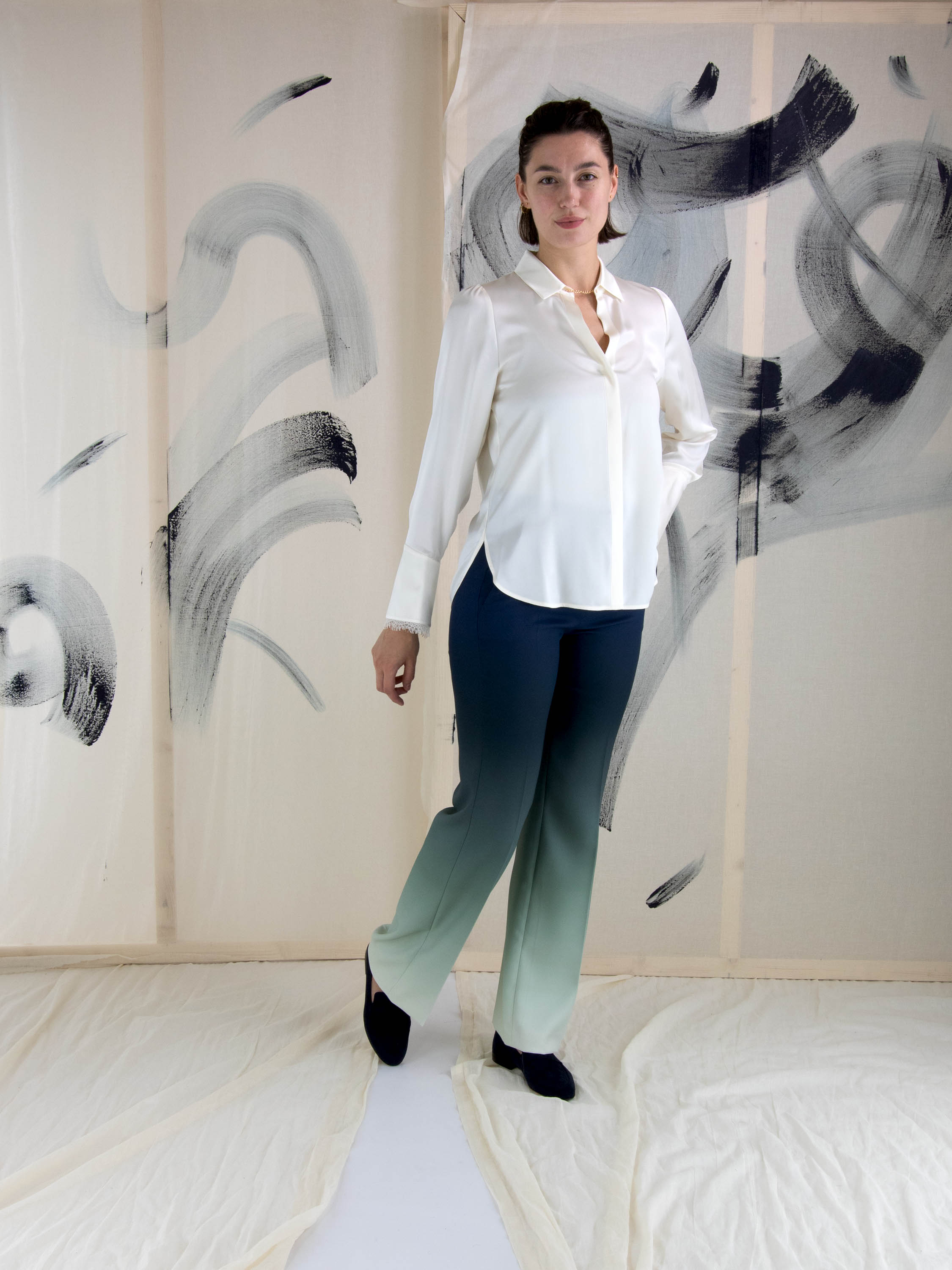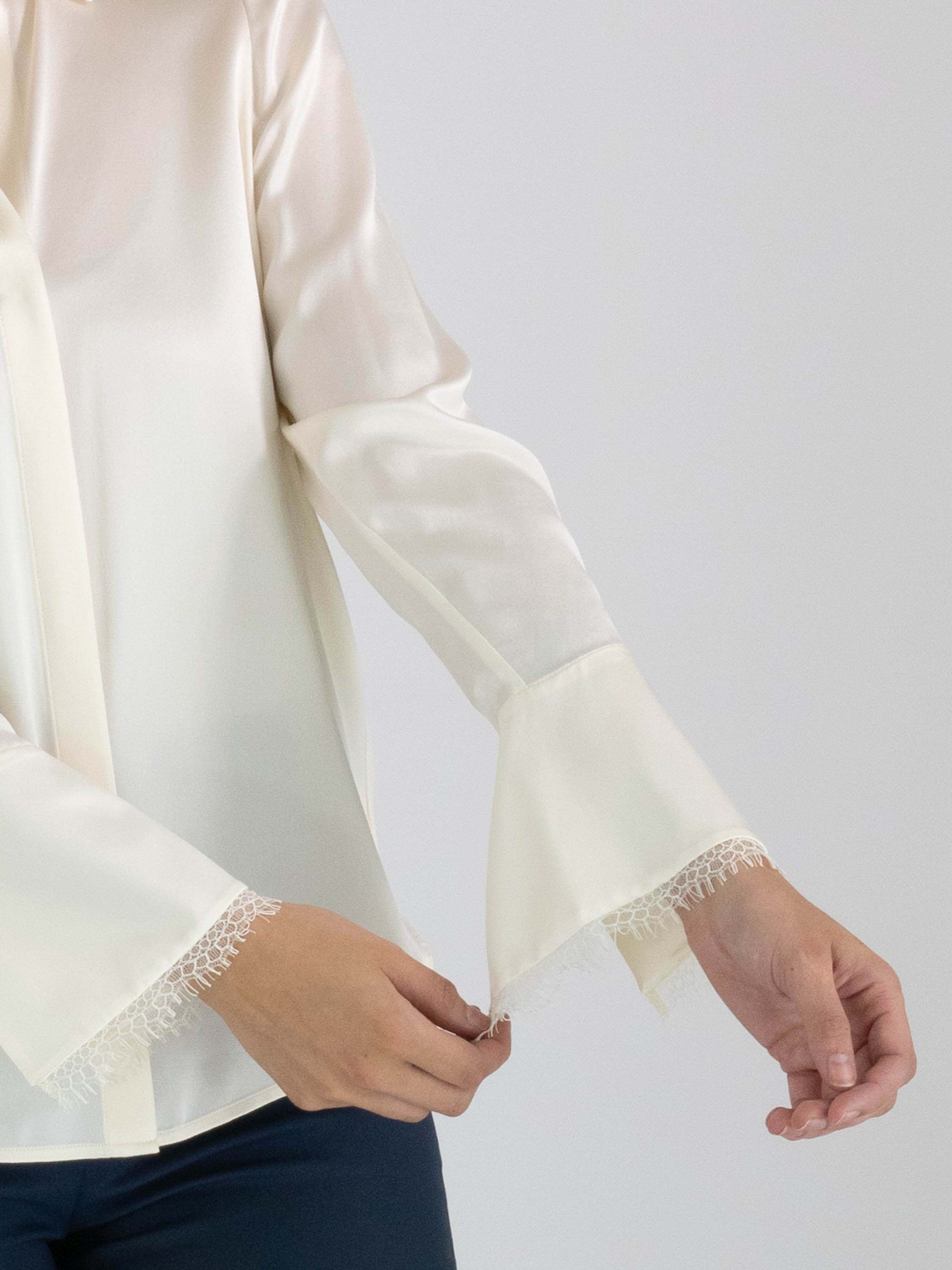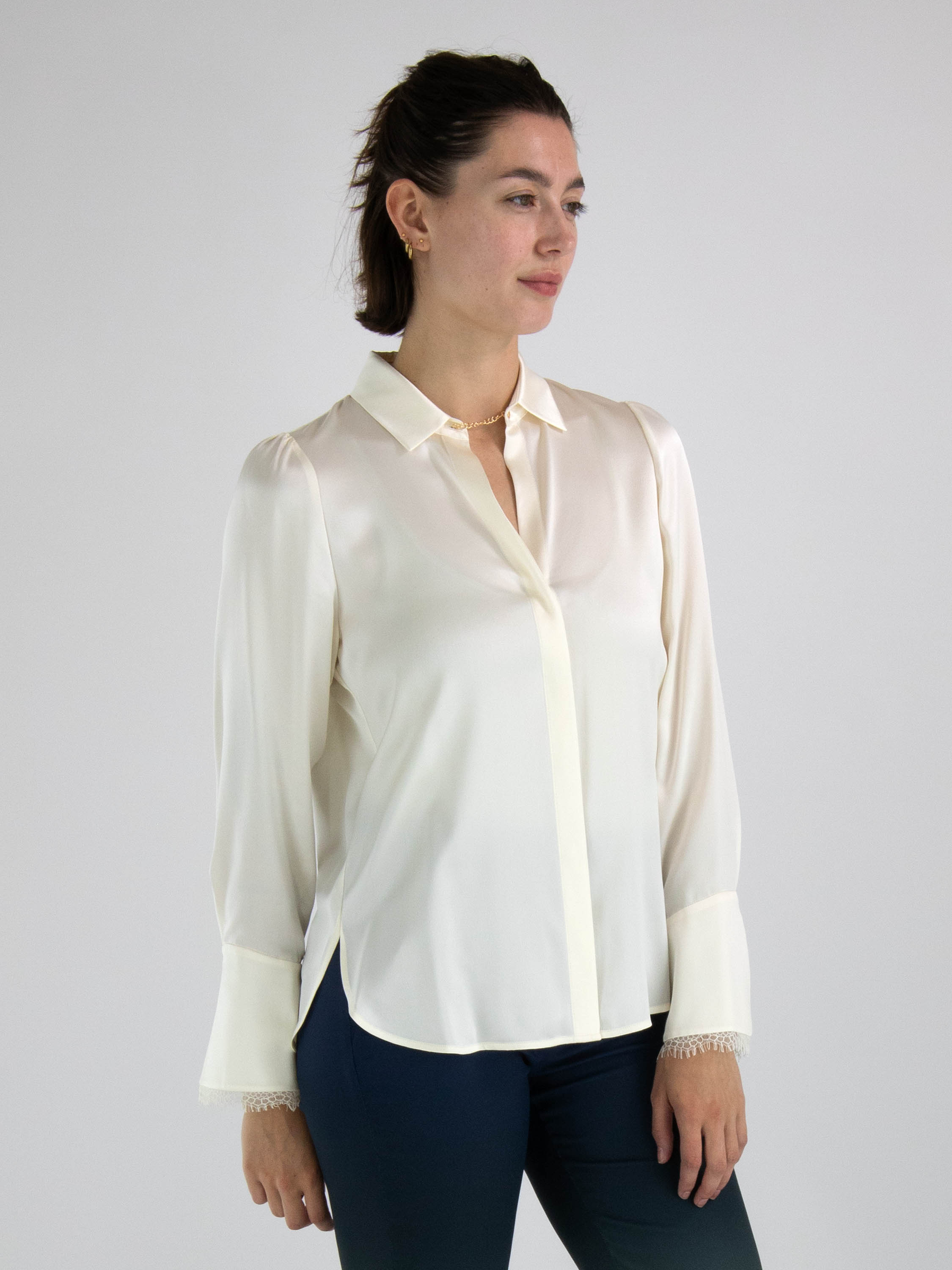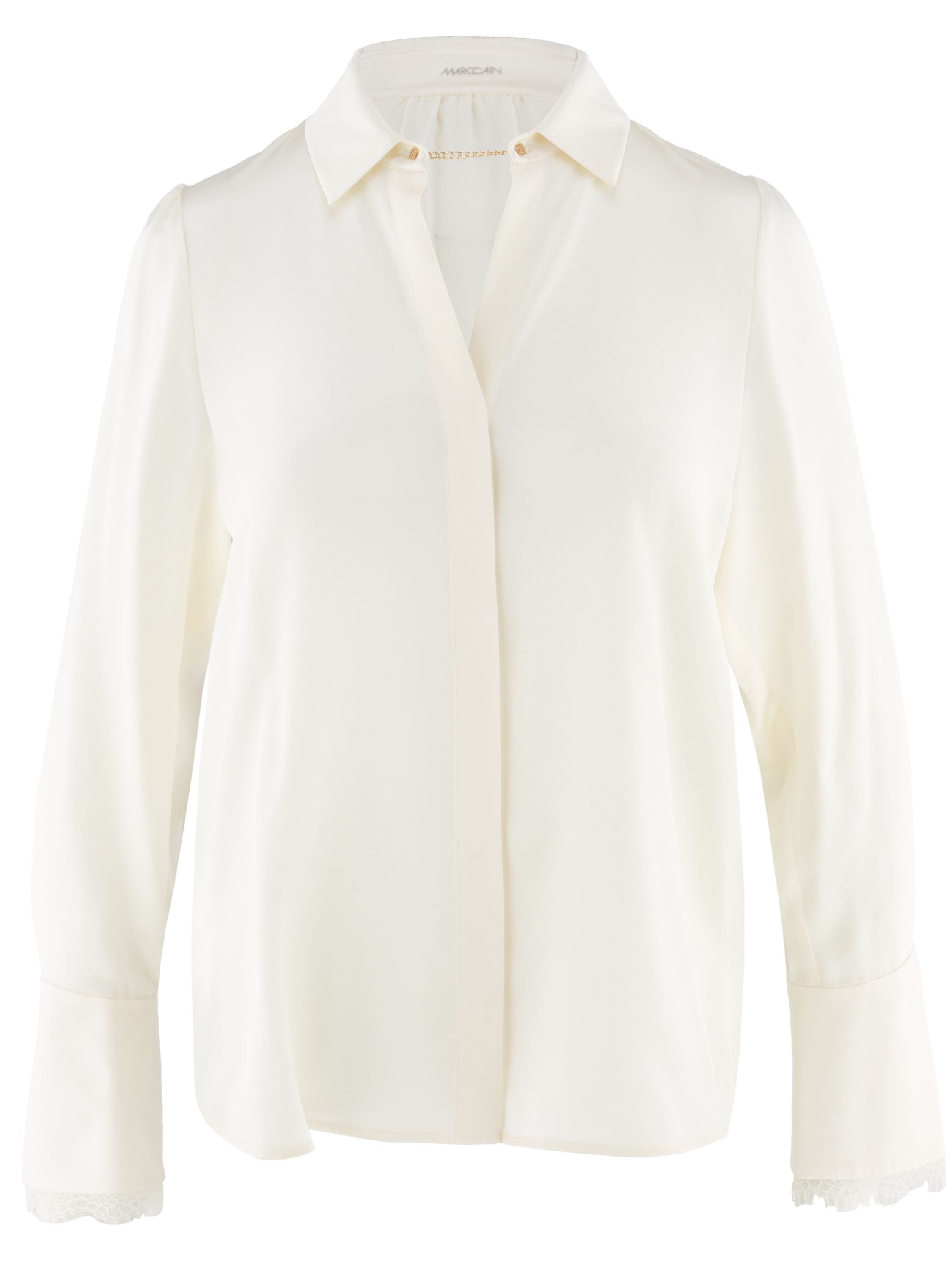 Blouse en satin mat de Marc Cain, de couleur blanc crème. A partir du centre de l'encolure en V, la blouse se ferme à l'ourlet par un bouton en strass avec chaînette. La blouse se ferme à l'aide d'un bouton dissimulé. L'extrémité des manches longues est bordée de dentelle. Ce chemisier peut être lavé à 30 degrés.