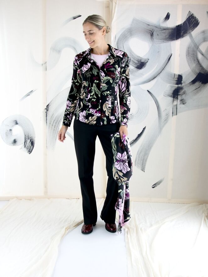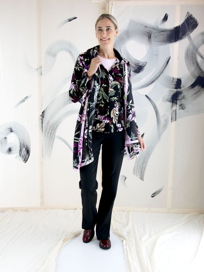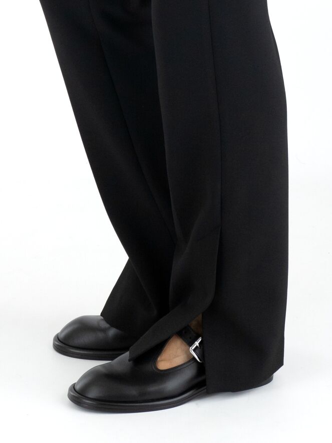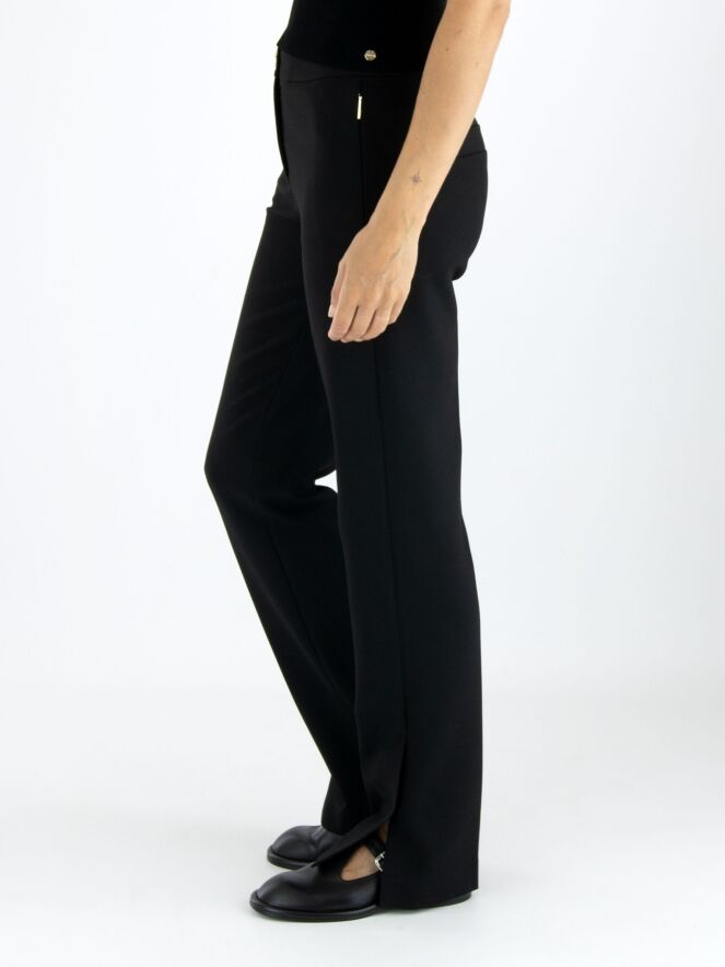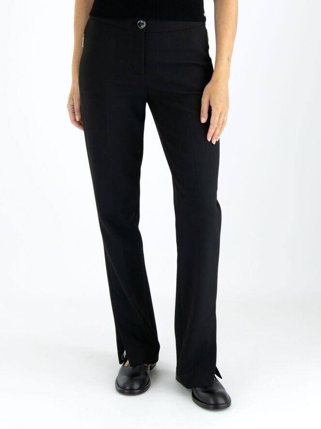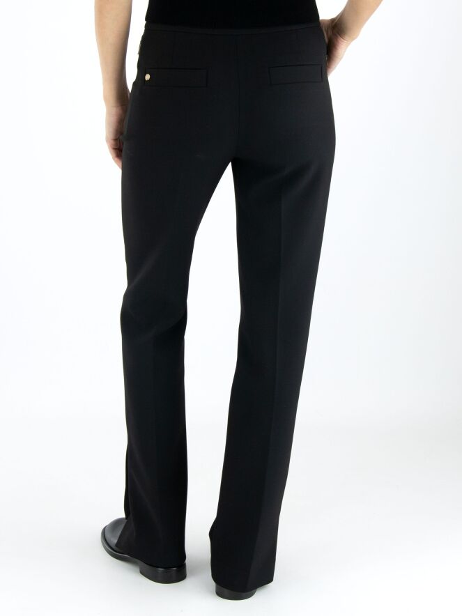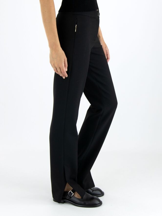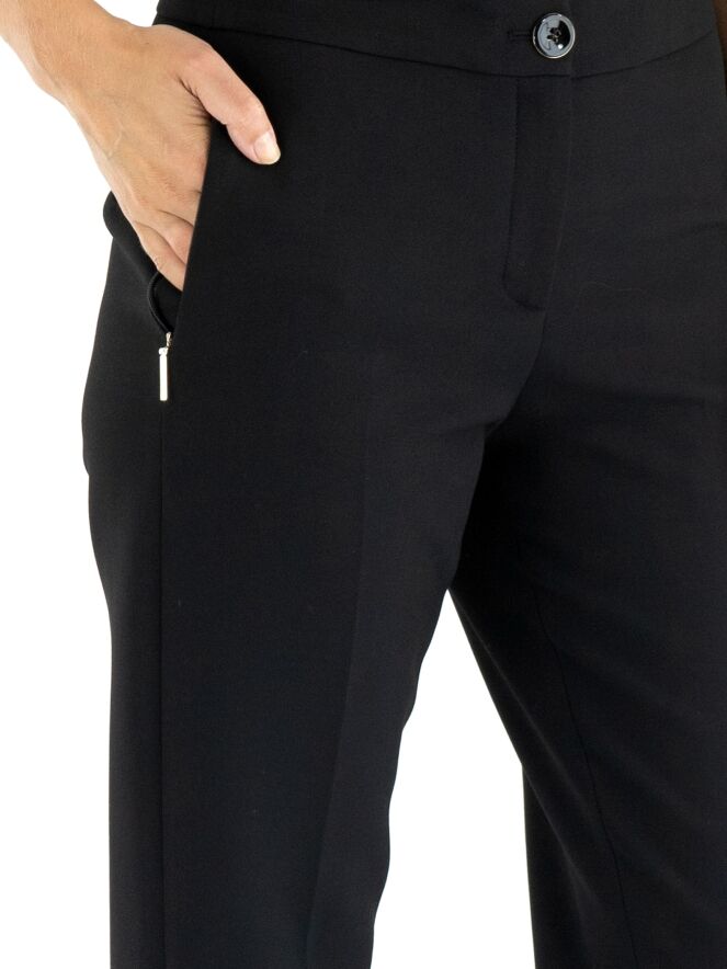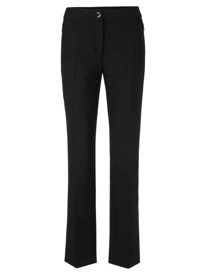 Un pantalon de Marc Cain en noir. Les poches passepoilées sont équipées d'une fermeture éclair avec un onglet doré. Un pli marqué est présent au centre des jambes. Au bas des jambes, il y a de longues fentes sur les côtés avec un bouton au centre. Ce pantalon peut être lavé à 30 degrés.