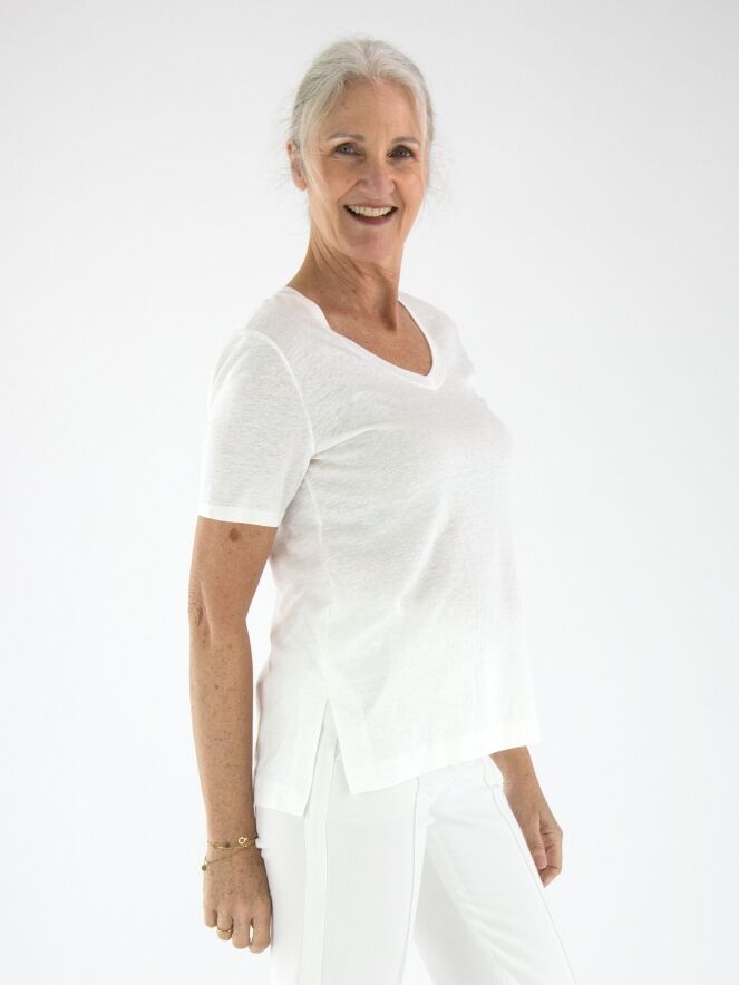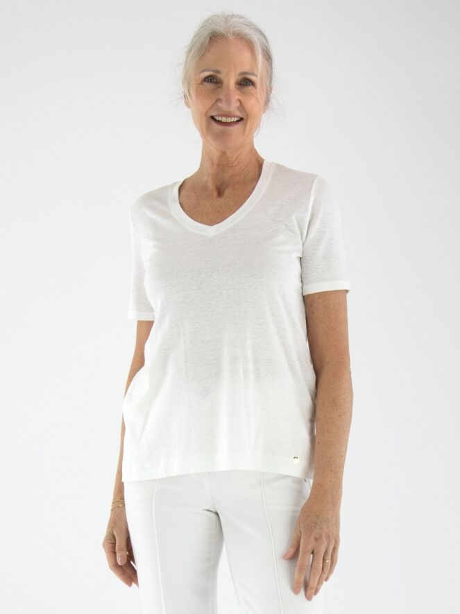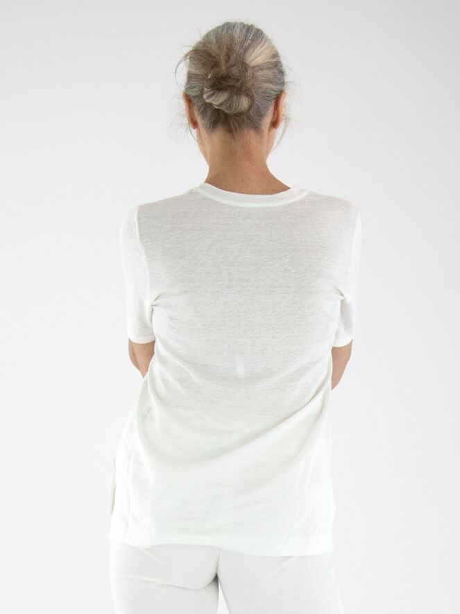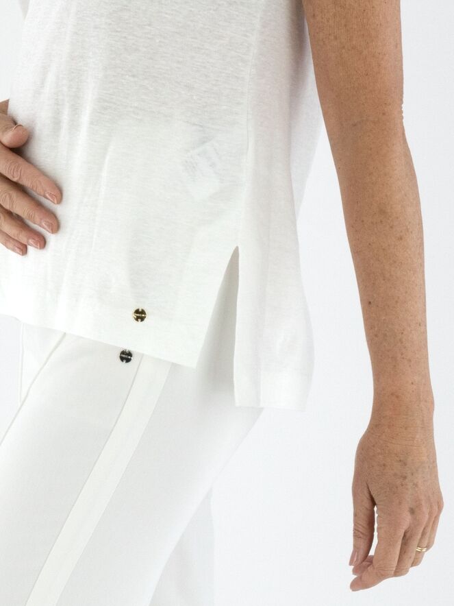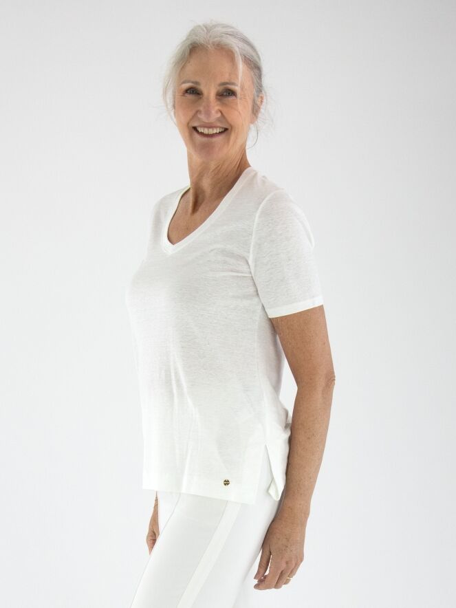 Un shirt de Marc Cain en blanc crème. Ce shirt présente un col en V et de petites fentes sur les deux côtés en bas. Ce shirt peut être lavé à 30 degrés.