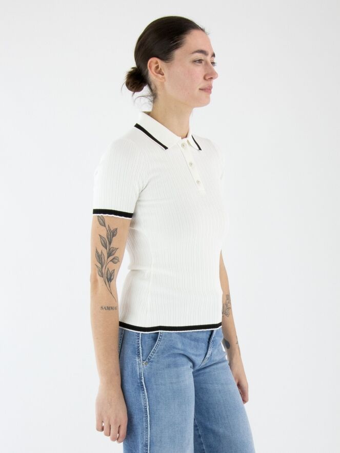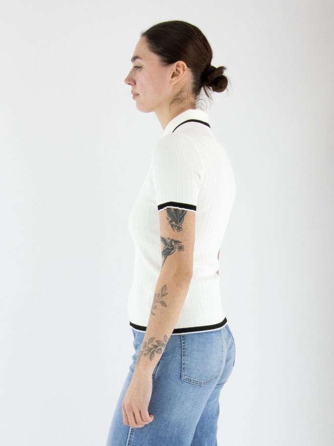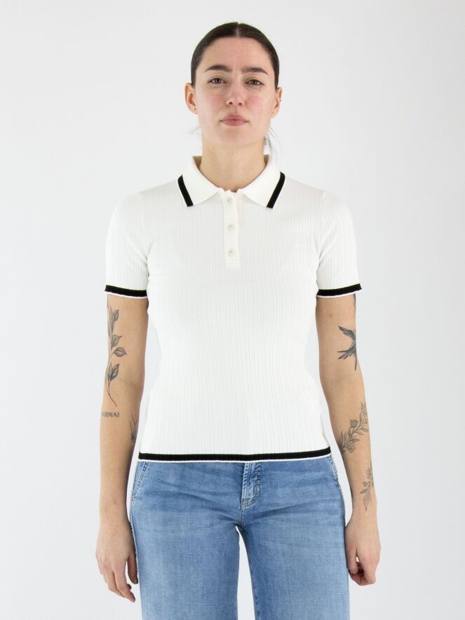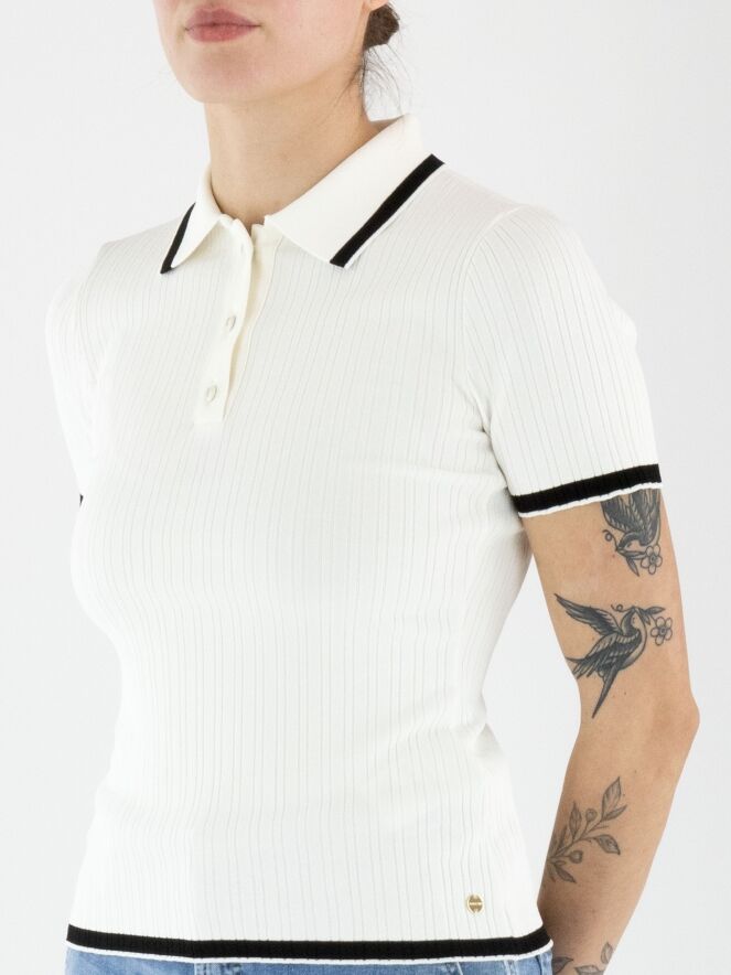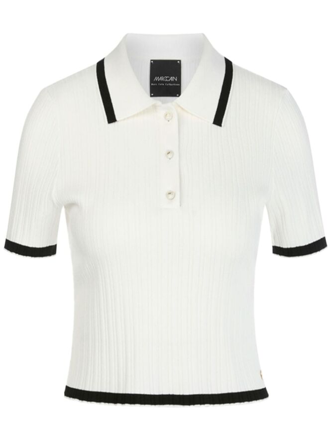 Un polo Marc Cain de couleur blanc crème. Le tissu est côtelé. Le polo présente un col en tricot finement côtelé avec une rayure noire sur le bord. Cette rayure se retrouve également aux extrémités des manches courtes et en bas du t-shirt. Ce t-shirt peut être lavé à 30 degrés.