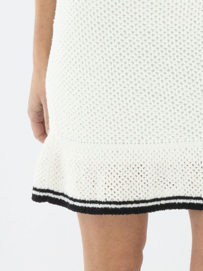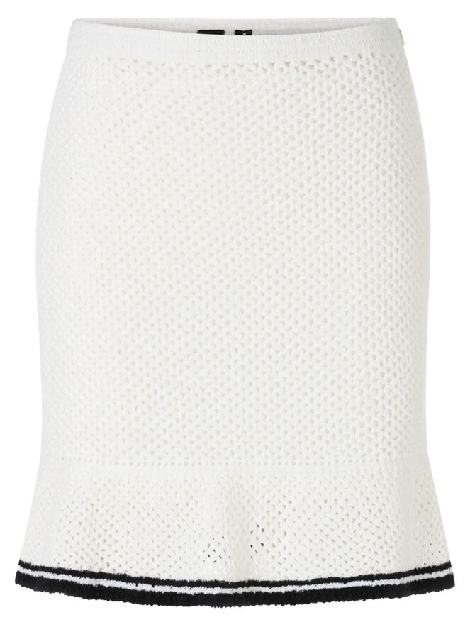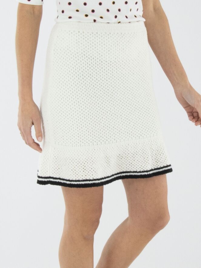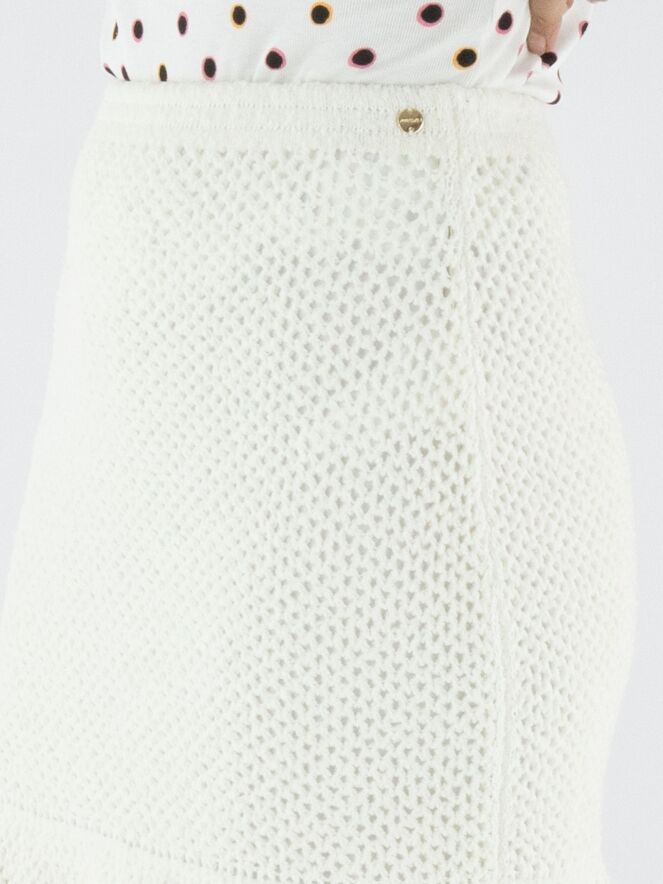 Une jupe en maille ajourée de Marc Cain de couleur blanc crème. La taille est dotée d'une bande élastique. La jupe a une coupe légèrement évasée et est doublée. À 10 cm du bas, une couture tricotée crée un effet plissé ondulé. Cette jupe peut être lavée à 30 degrés.