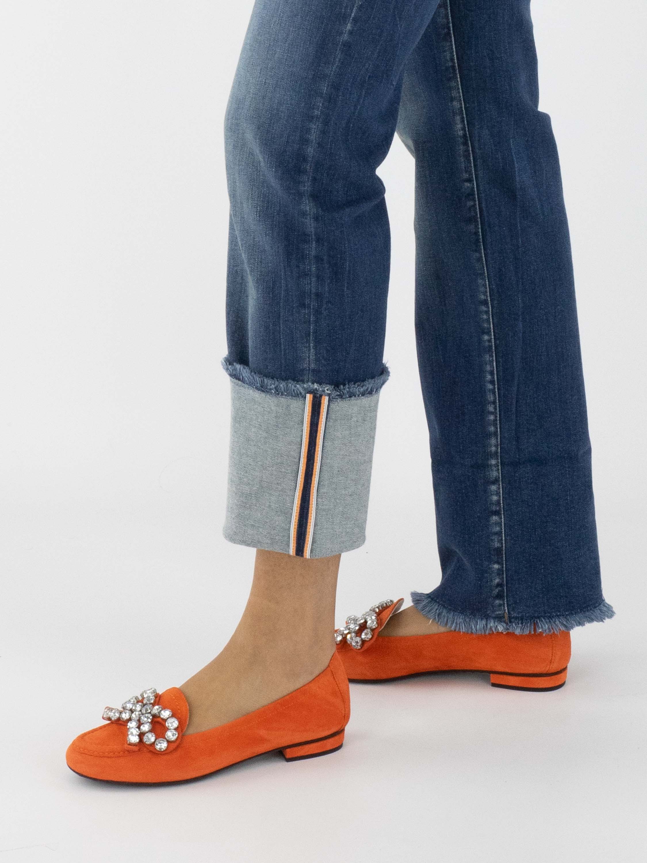 Un jean de Marc Cain de couleur denim classique et intense. Ce jean est conçu en 5 poches. En bas des jambes, un large revers de 15 cm avec une bordure finement effilochée est présent. Ce jean peut être lavé à 30 degrés.
