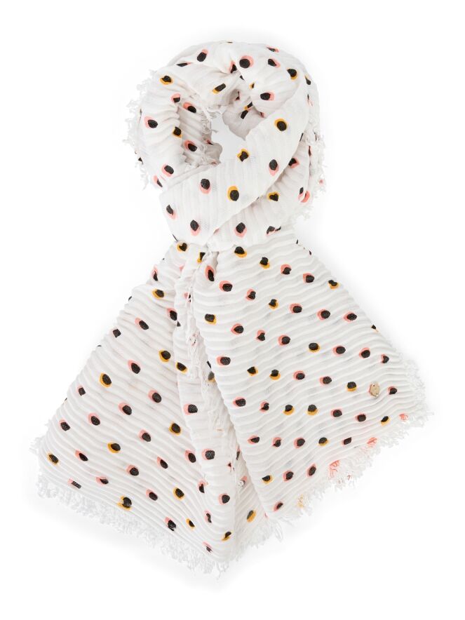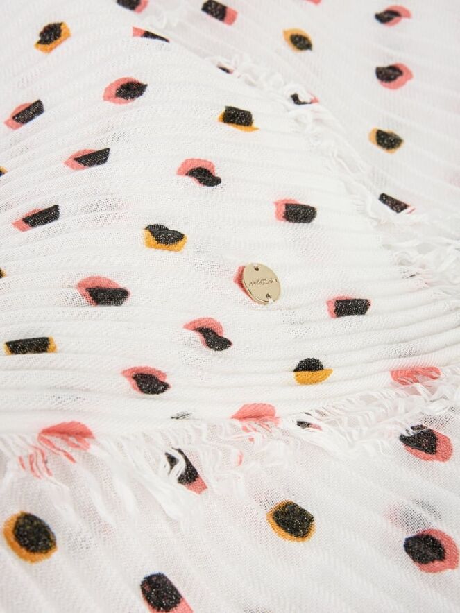 Une écharpe côtelée Marc Cain avec un imprimé à pois noirs et une bordure orange ou rose saumon. Le tissu est finement plissé. Les bords de l'écharpe sont ornés de petites franges. Cette écharpe doit être lavée à la main.
