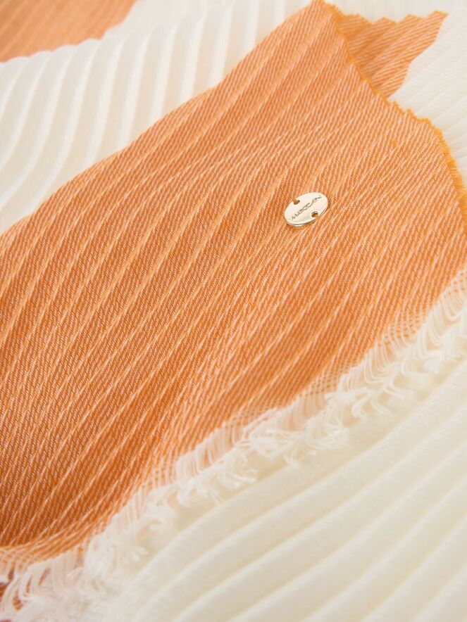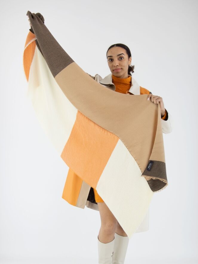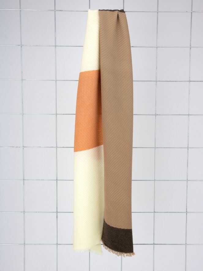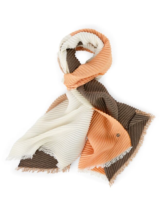 Une écharpe côtelée Marc Cain avec plusieurs blocs de couleurs dans différentes nuances de brun. Les extrémités de l'écharpe sont délicatement effilochées. Cette écharpe doit être lavée à la main.