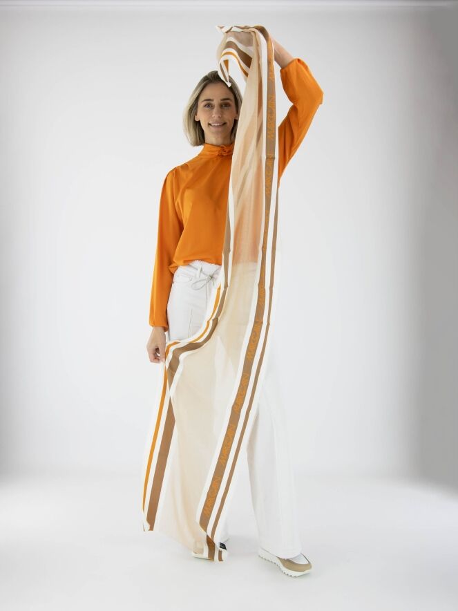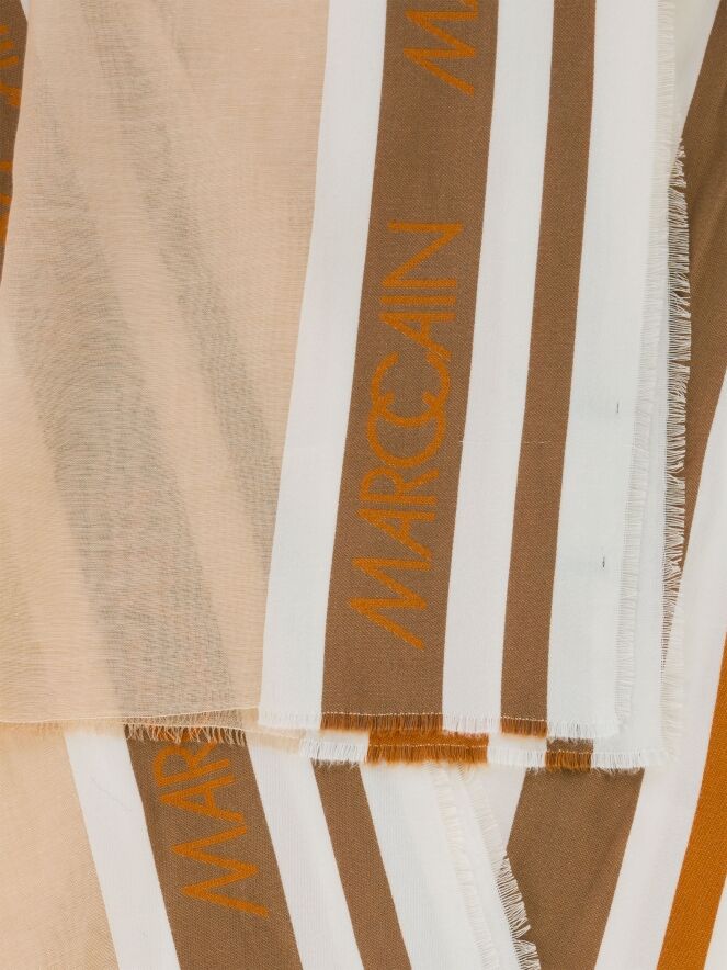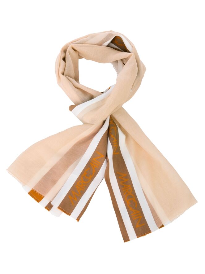 Une écharpe légèrement transparente Marc Cain avec un motif à rayures de largeurs variées dans les couleurs camel, brun, blanc crème et orange. Les bords de l'écharpe sont délicatement effilochés. Cette écharpe doit être lavée à la main.