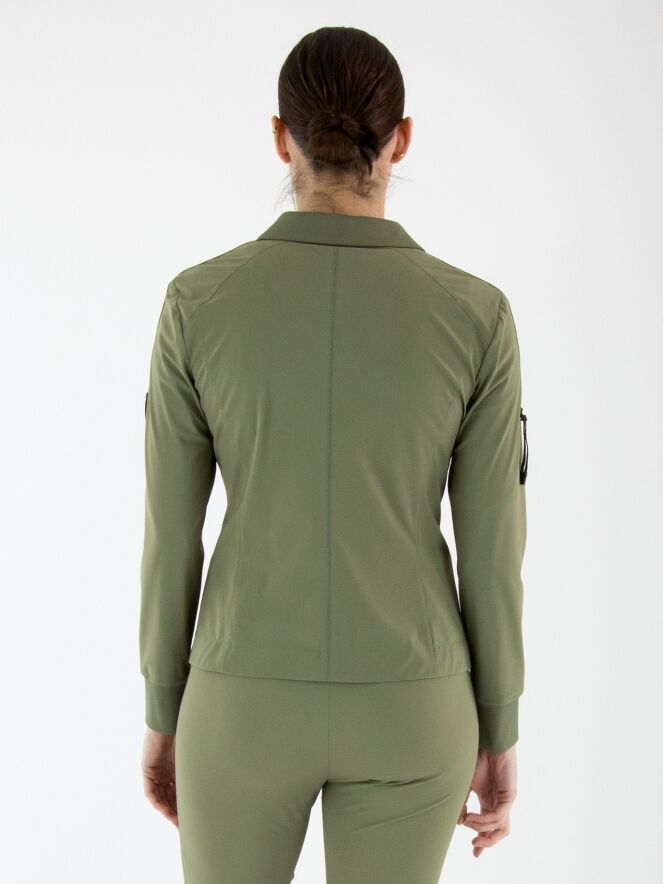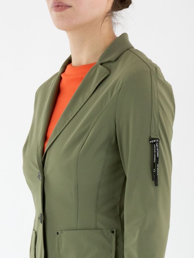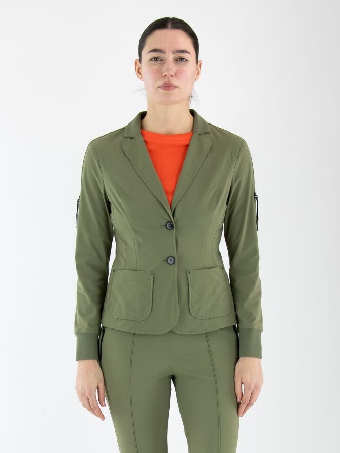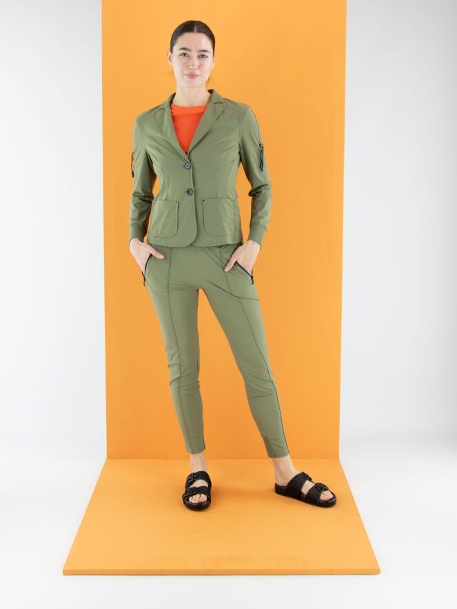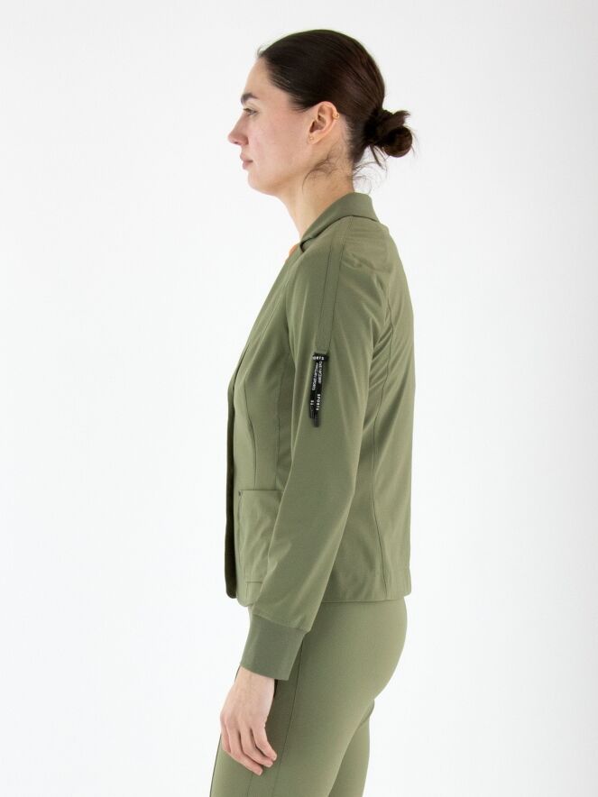 Un blazer non doublé de Marc Cain en vert olive. L’extrémité des manches longues est dotée d’une bordure en tricot finement côtelée. Ce blazer peut être lavé à 30 degrés.