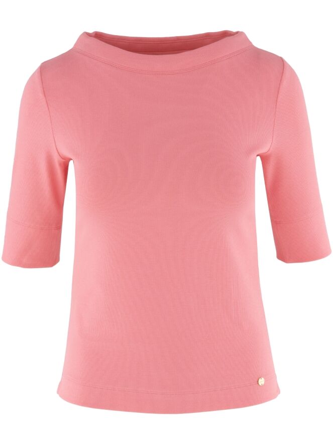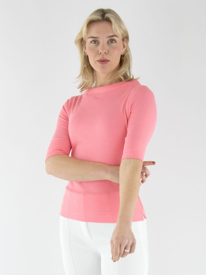 Un t-shirt Marc Cain de couleur rose saumon. Le t-shirt présente une texture finement côtelée, des manches courtes et une large encolure ronde. Ce t-shirt peut être lavé à 30 degrés.