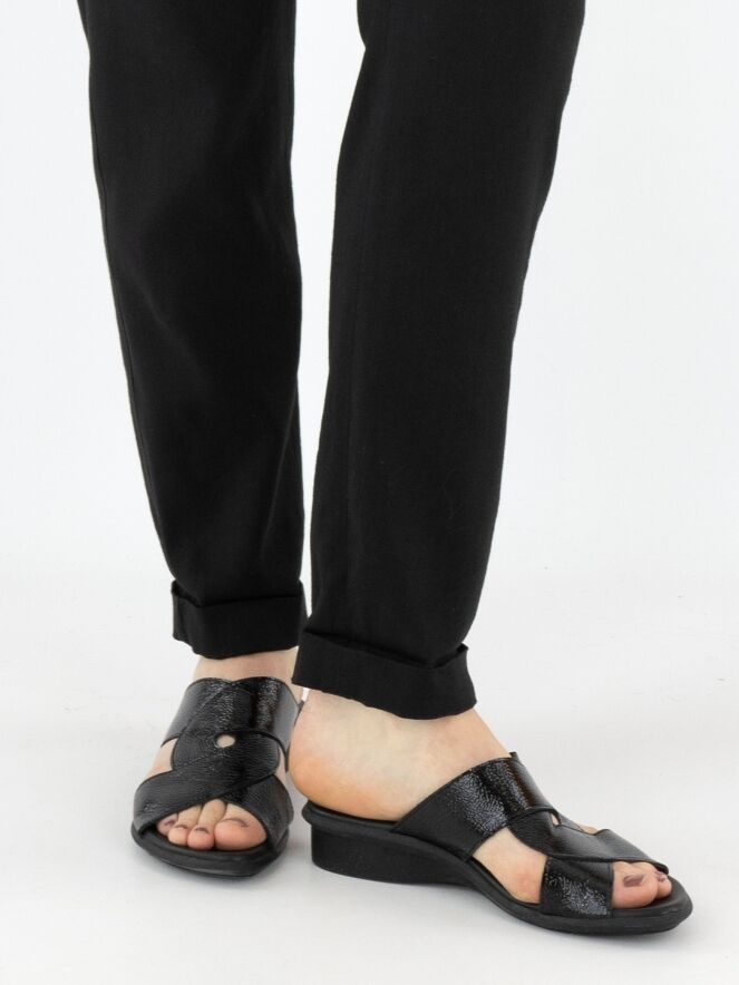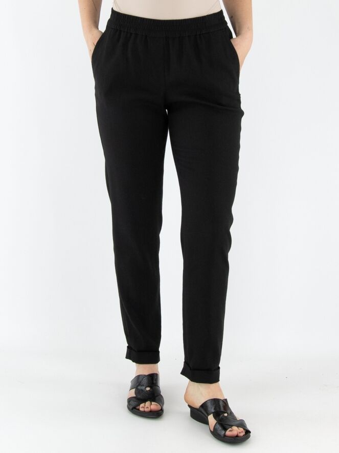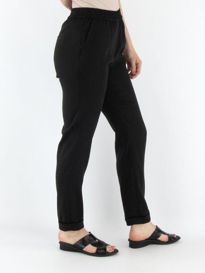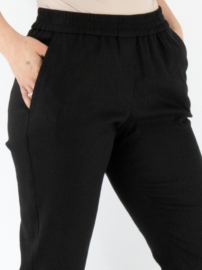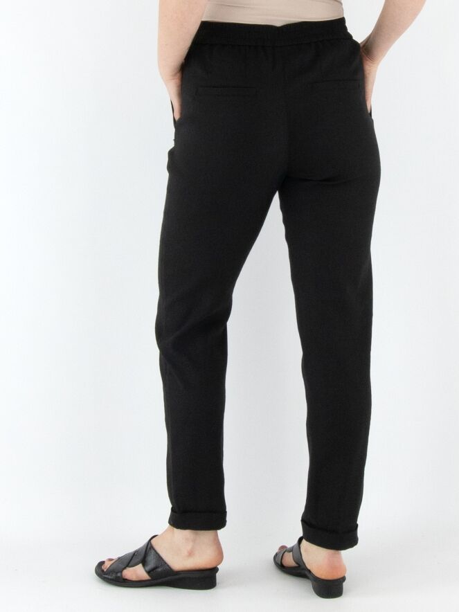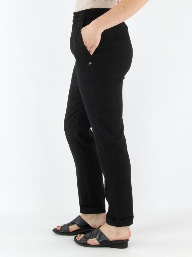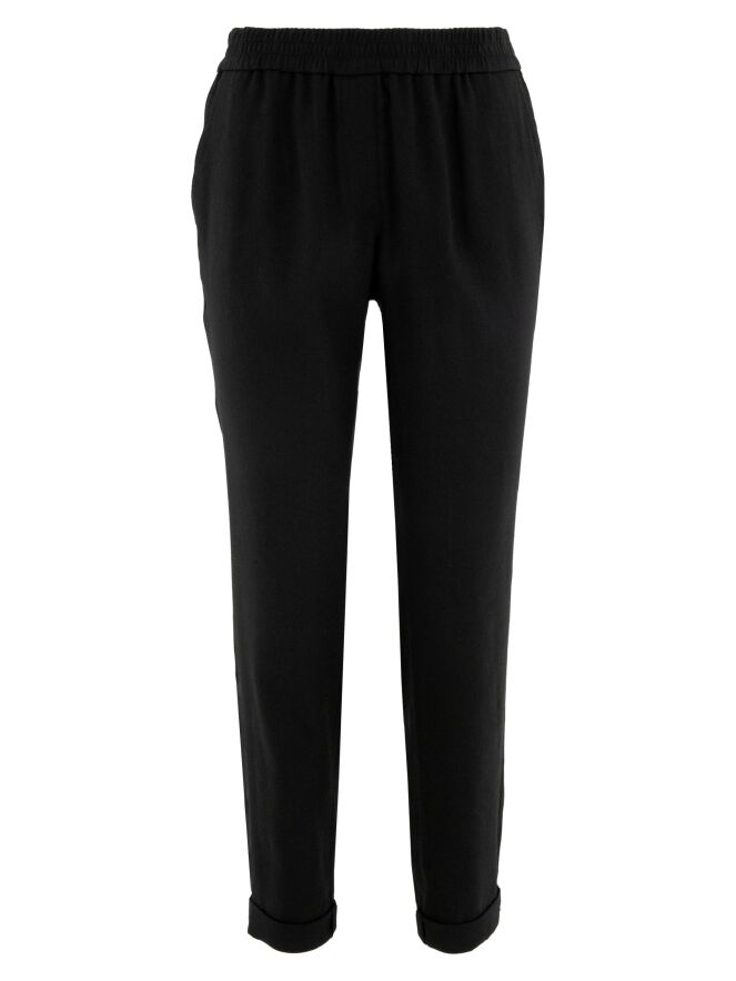 Un pantalon de Marc Cain en noir. La taille est dotée d'une bande élastique finement plissée. Ce pantalon possède des poches latérales et un petit revers en bas. Ce pantalon peut être lavé à 30 degrés.