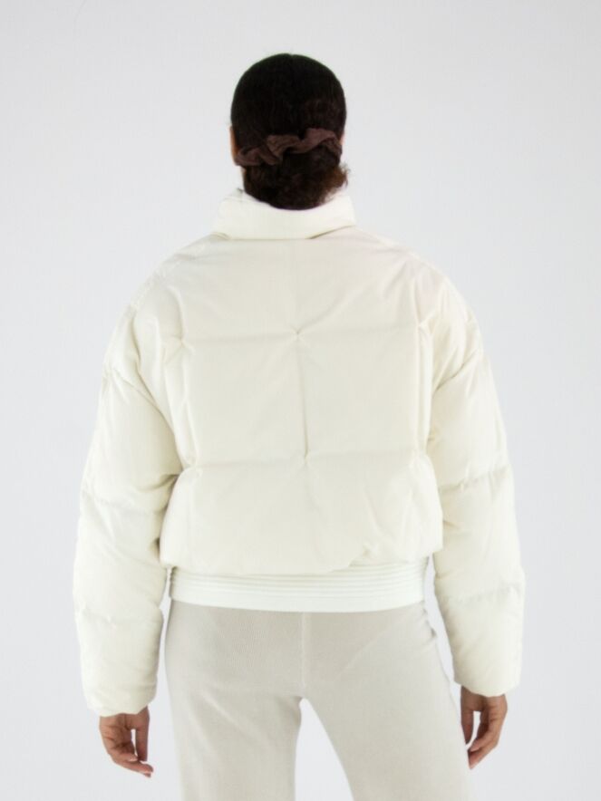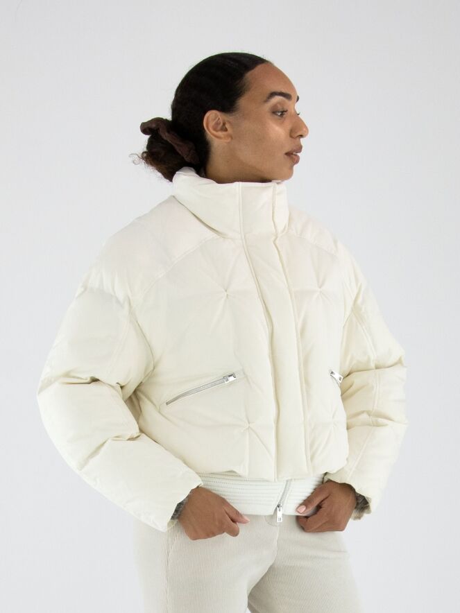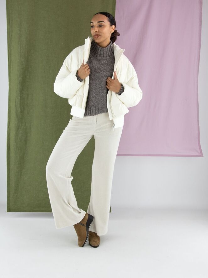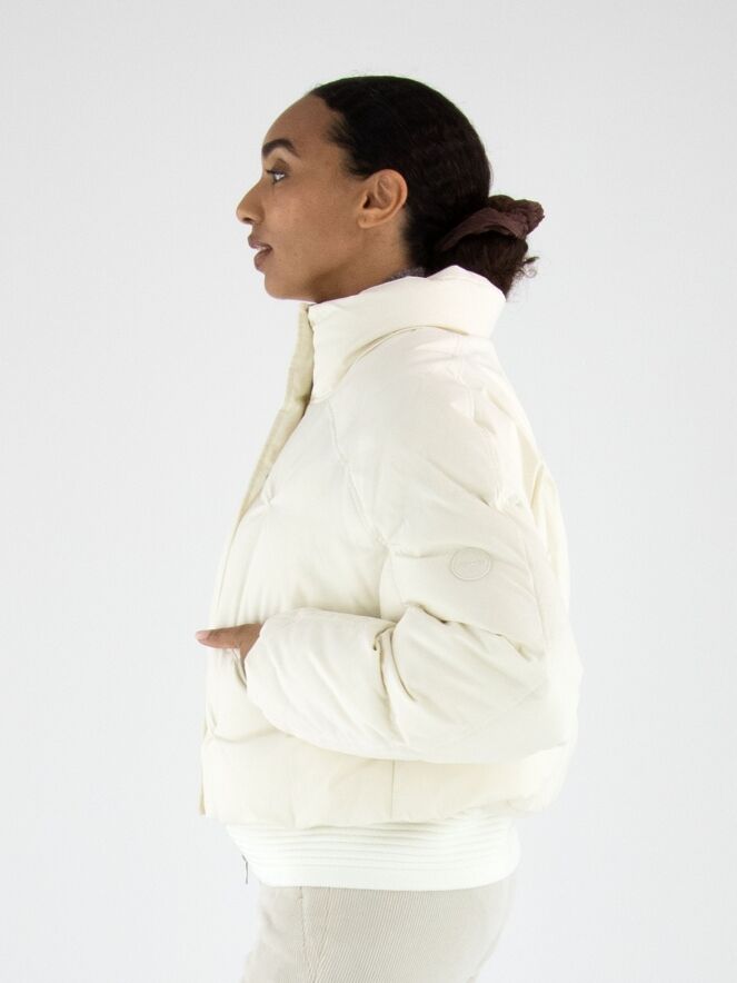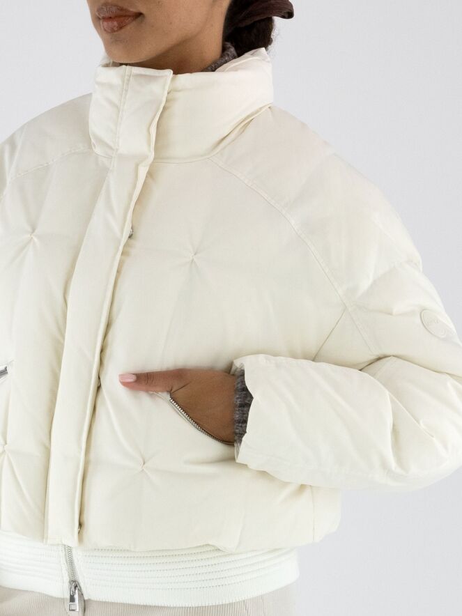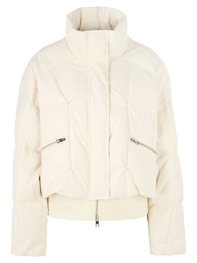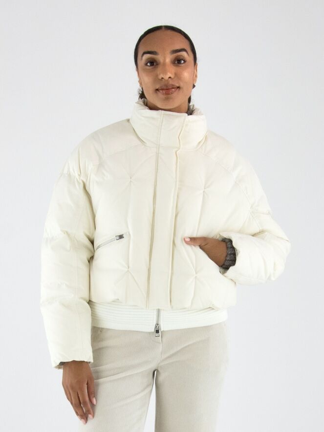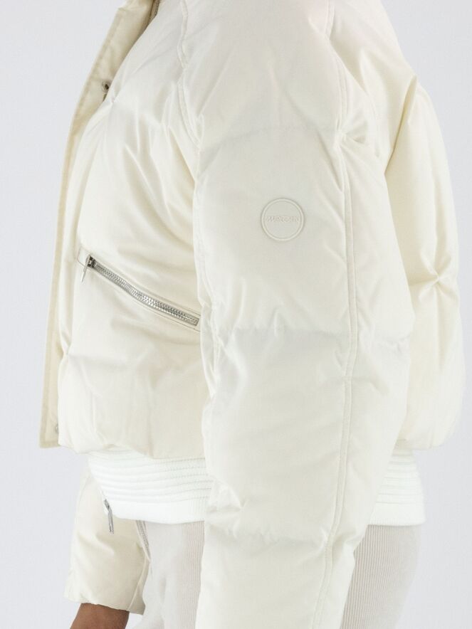 Un blouson bomber court de Marc Cain en blanc cassé. Par-dessus la fermeture éclair se trouve une seconde fermeture à boutons-pression. Les poches fendues sont équipées de fermetures éclair. Le bas du blouson est terminé par une large bordure en tricot côtelé. Ce blouson peut être lavé à 30 degrés.