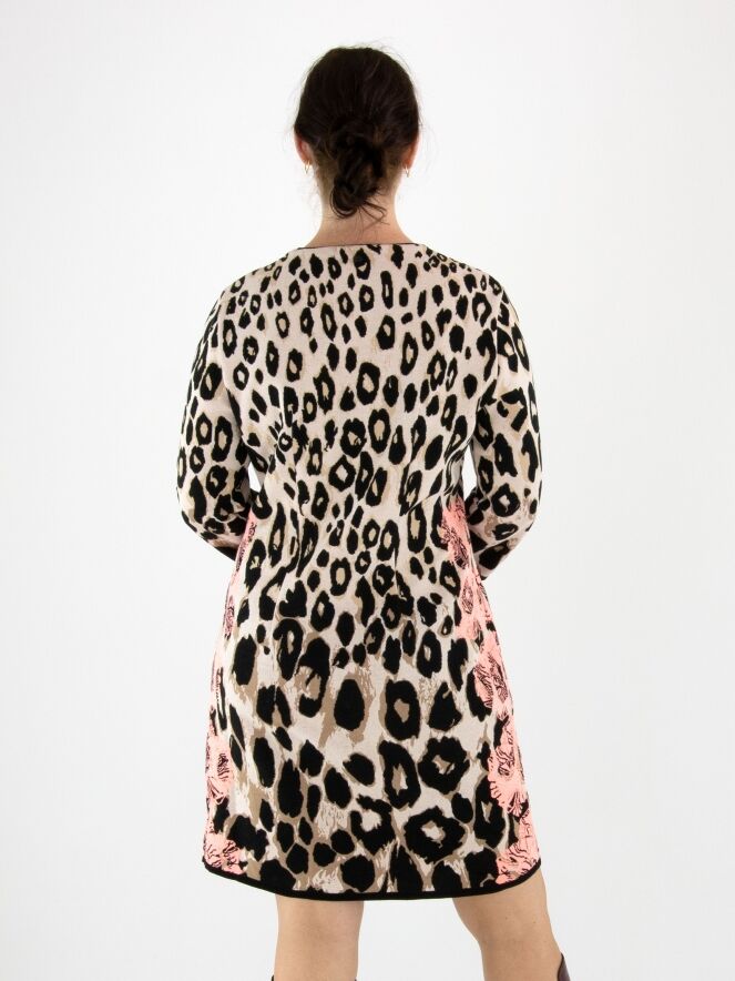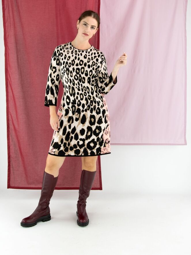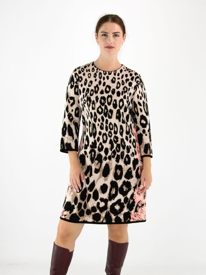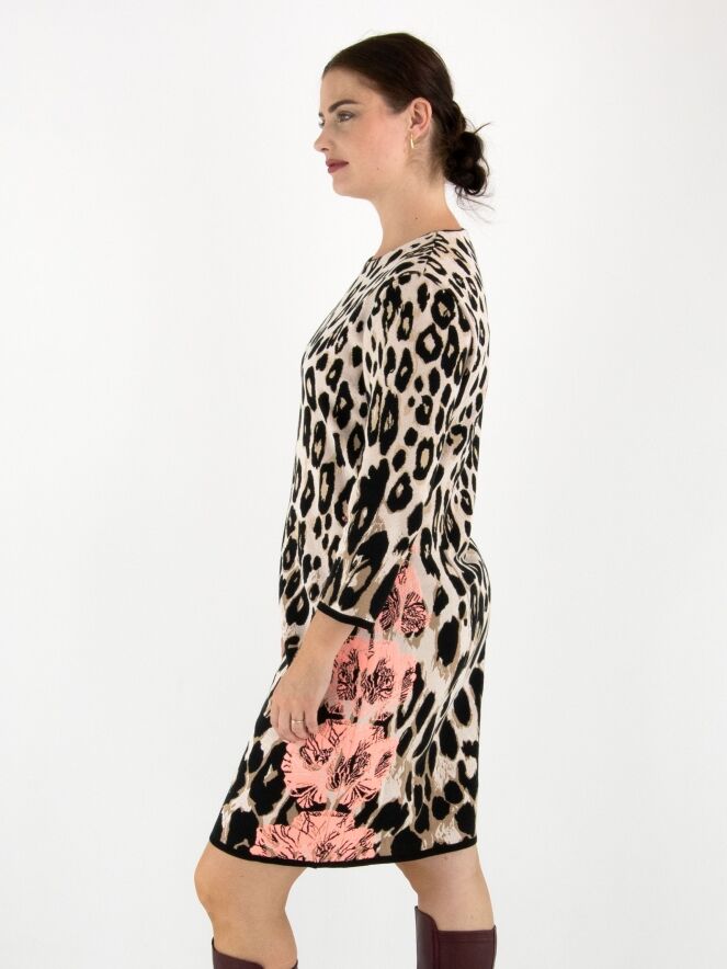 Une robe de Marc Cain avec un imprimé léopard dans plusieurs tons de brun et de noir sur un fond couleur sable. À partir de la taille, un motif floral en rose saumon est imprimé sur les côtés. Un liseré noir orne l’encolure ronde, les extrémités des manches mi-longues et le bas de la robe. Cette robe peut être lavée à 30 degrés.