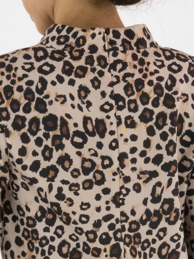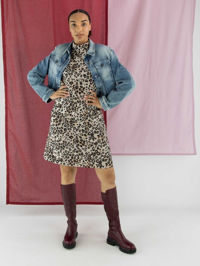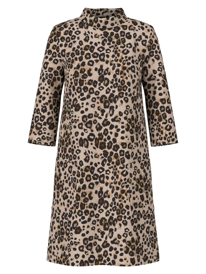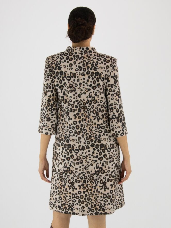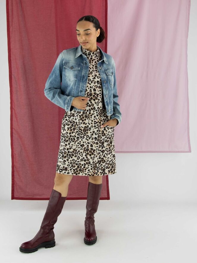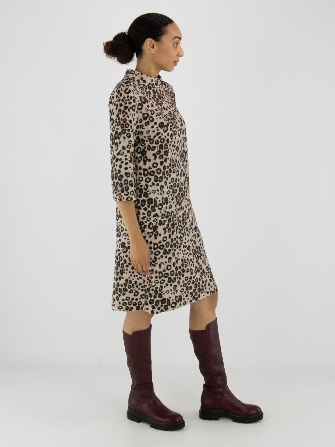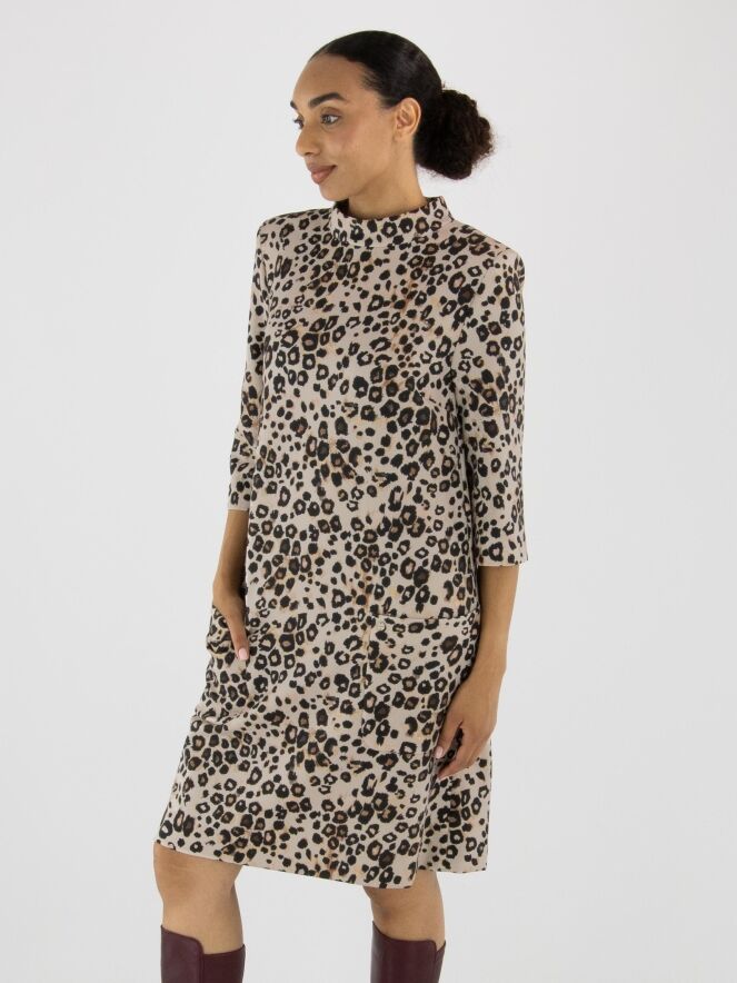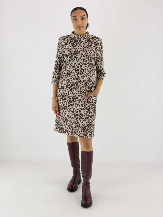 Une robe de Marc Cain à imprimé léopard dans plusieurs tons de brun et de noir sur un fond couleur sable. La robe présente un col rond montant et des manches mi-longues. À l’arrière, une fermeture zippée invisible monte jusqu’au-dessus de la taille. À l’avant, juste sous la taille, se trouvent deux poches. Cette robe peut être lavée à 30 degrés.
