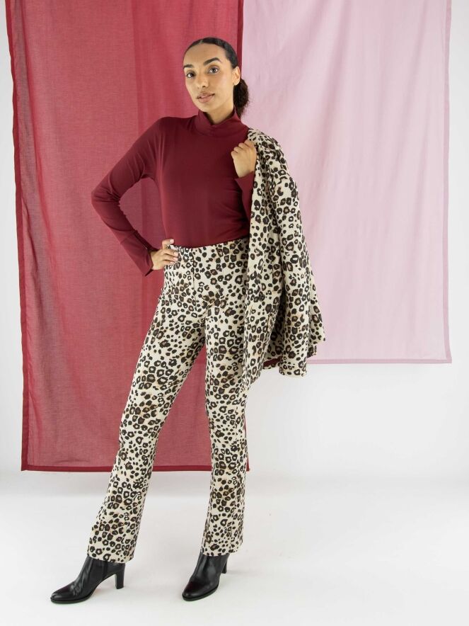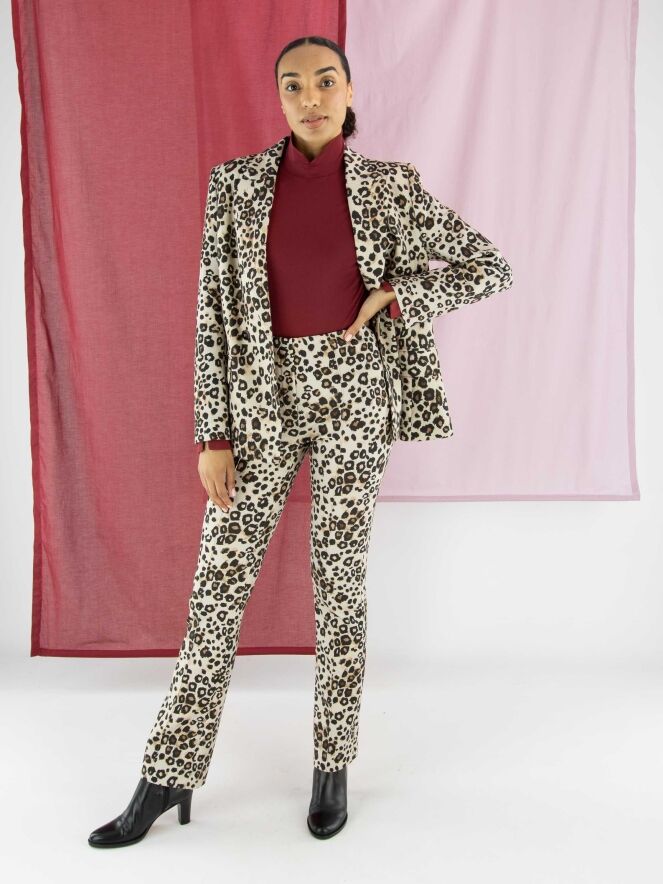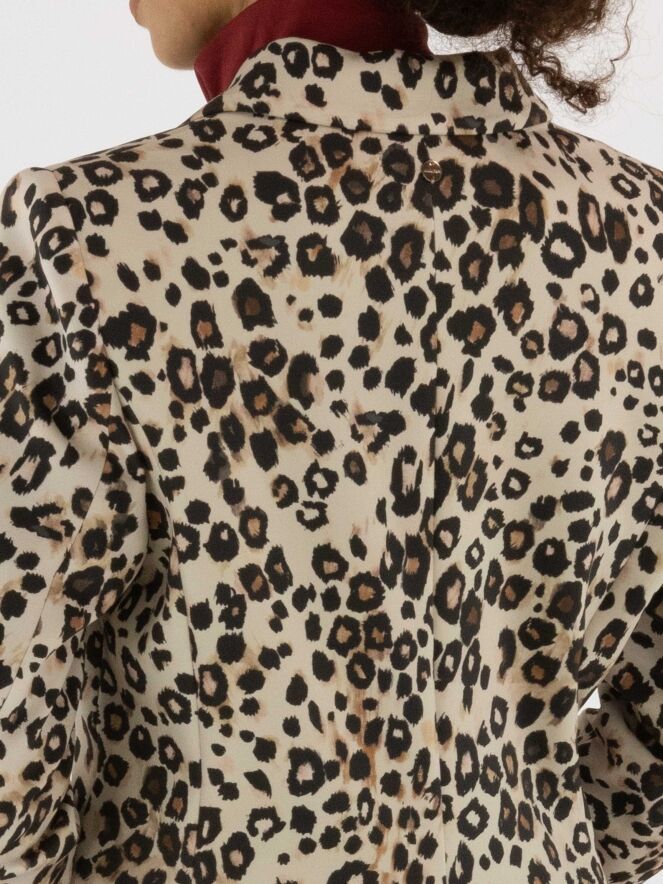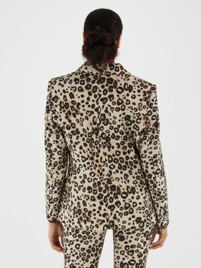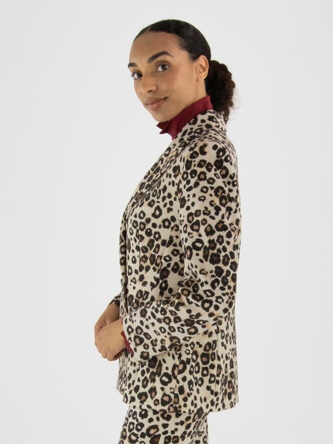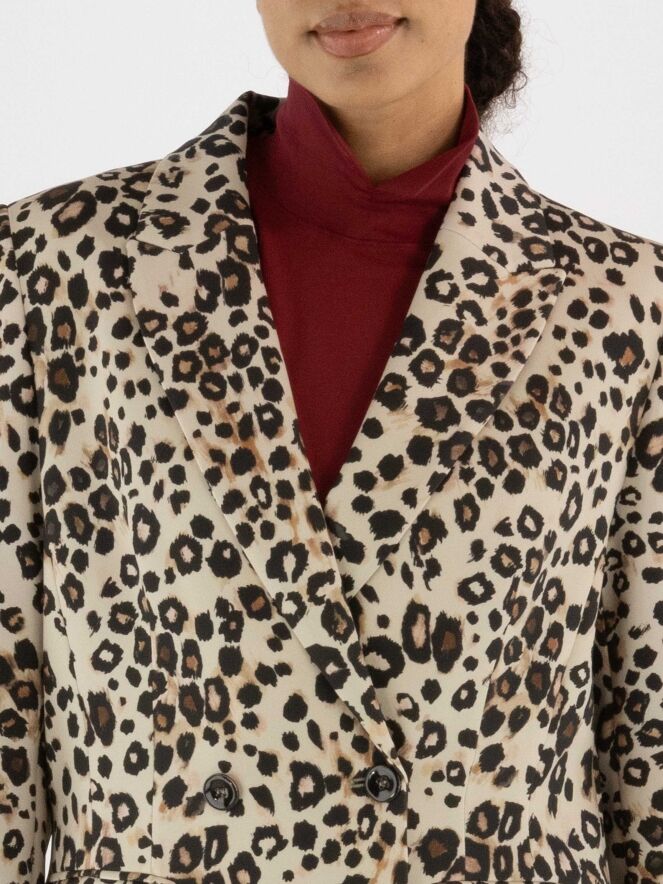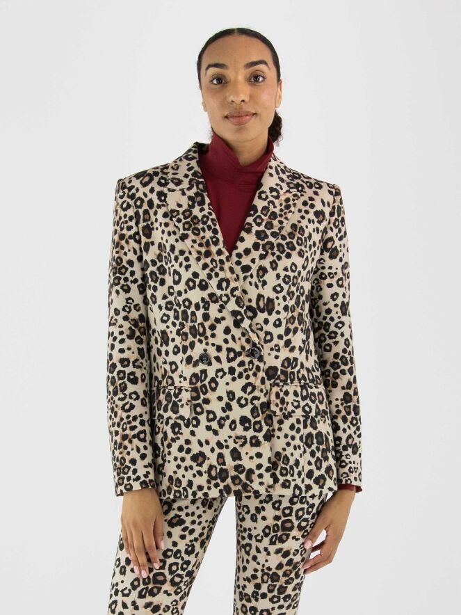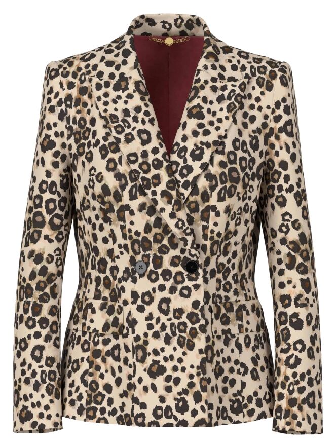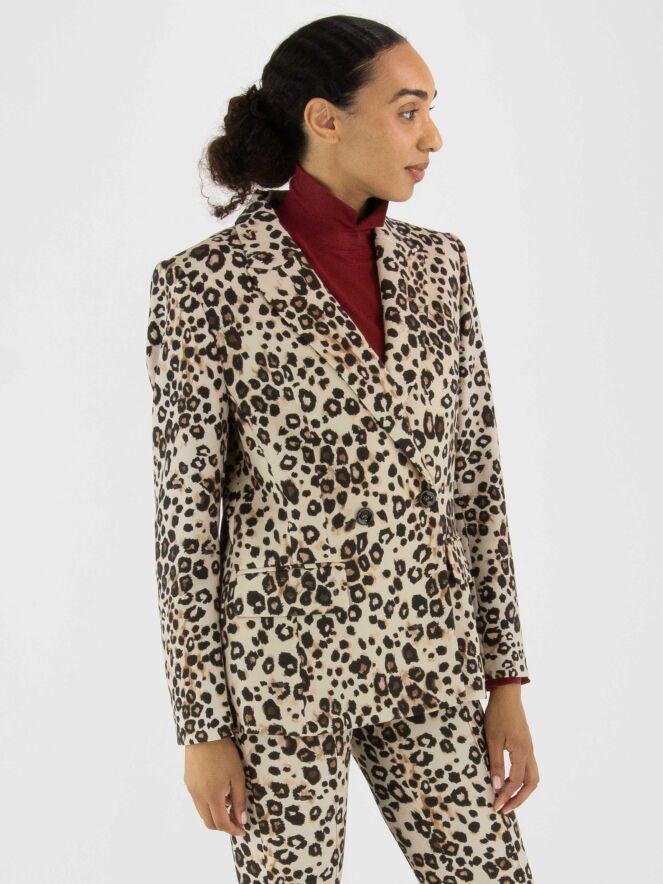 Blazer croisé en tissu scuba de Marc Cain, à imprimé léopard dans des nuances de brun et de noir sur un fond couleur sable. La veste est doublée et ne doit pas être lavée.
