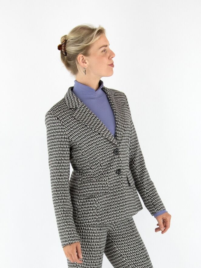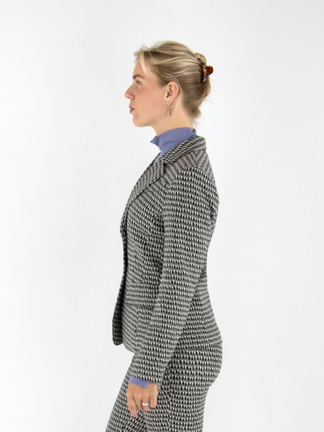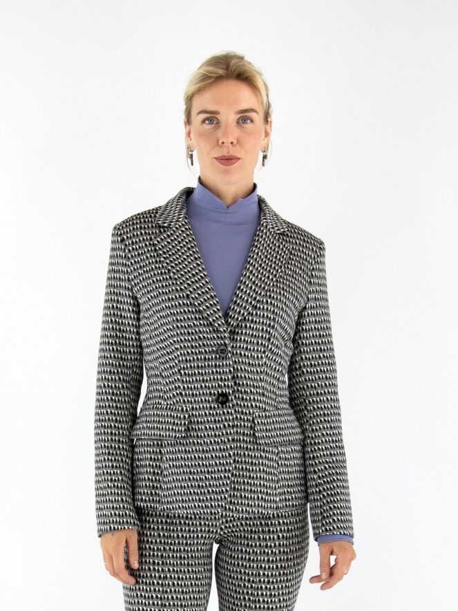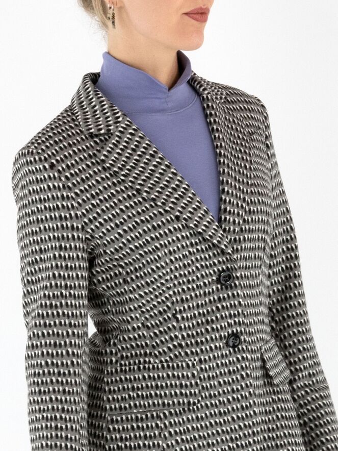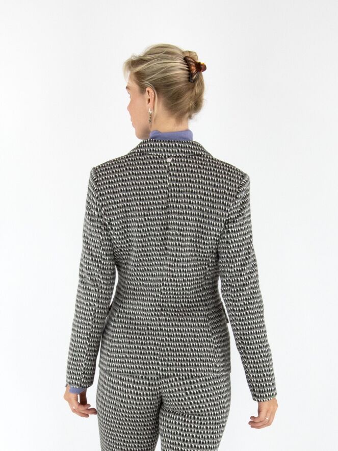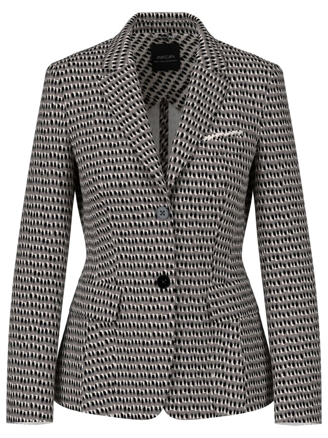 Blazer Marc Cain en matière scuba avec imprimé à pois noirs et blancs sur fond gris. Le blazer se ferme par deux boutons et est partiellement doublé. Ce vêtement peut être lavé à 30 degrés.