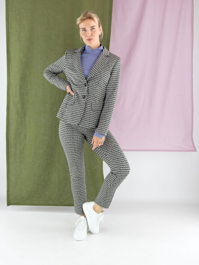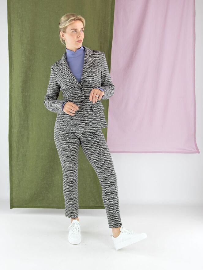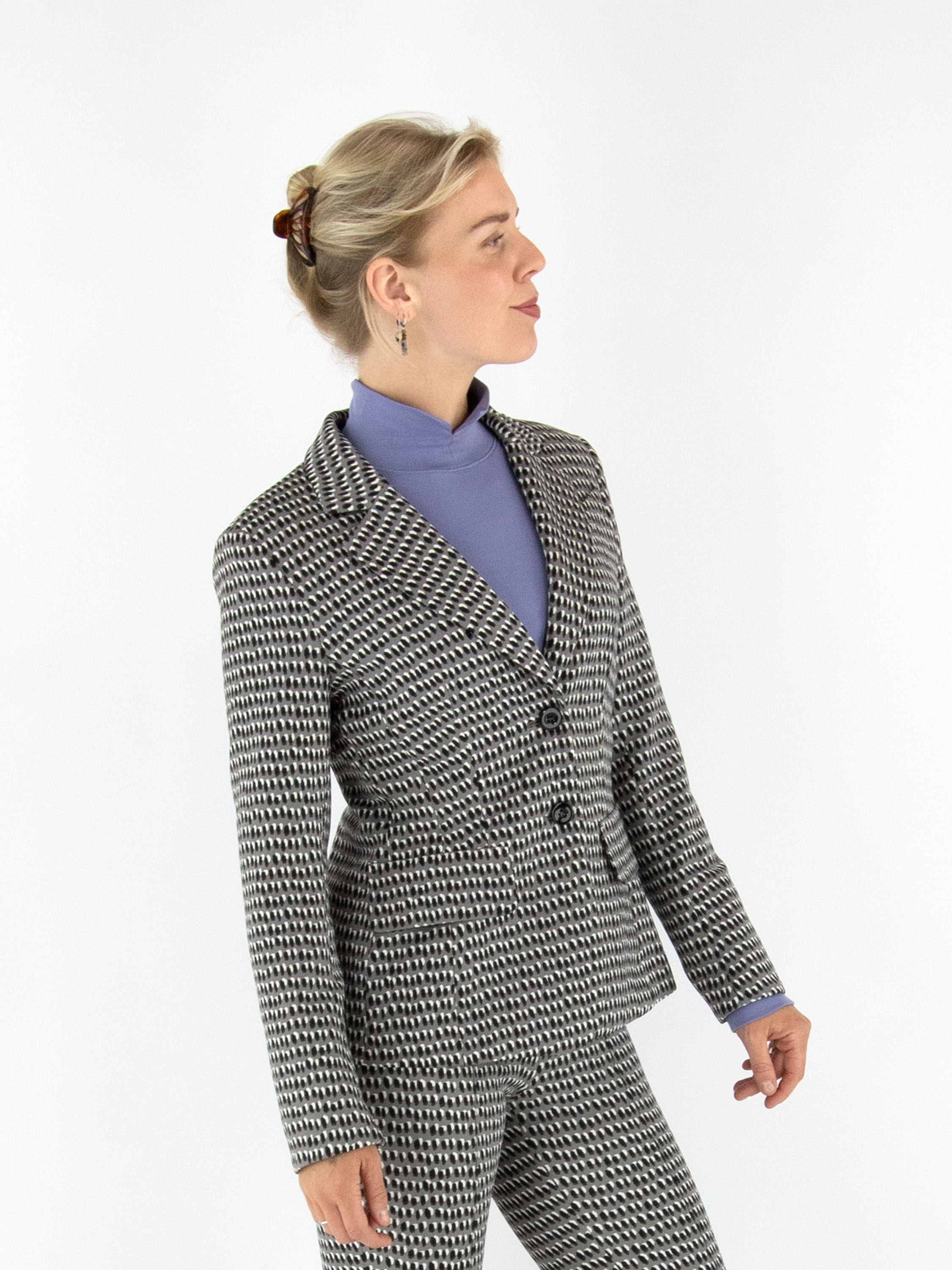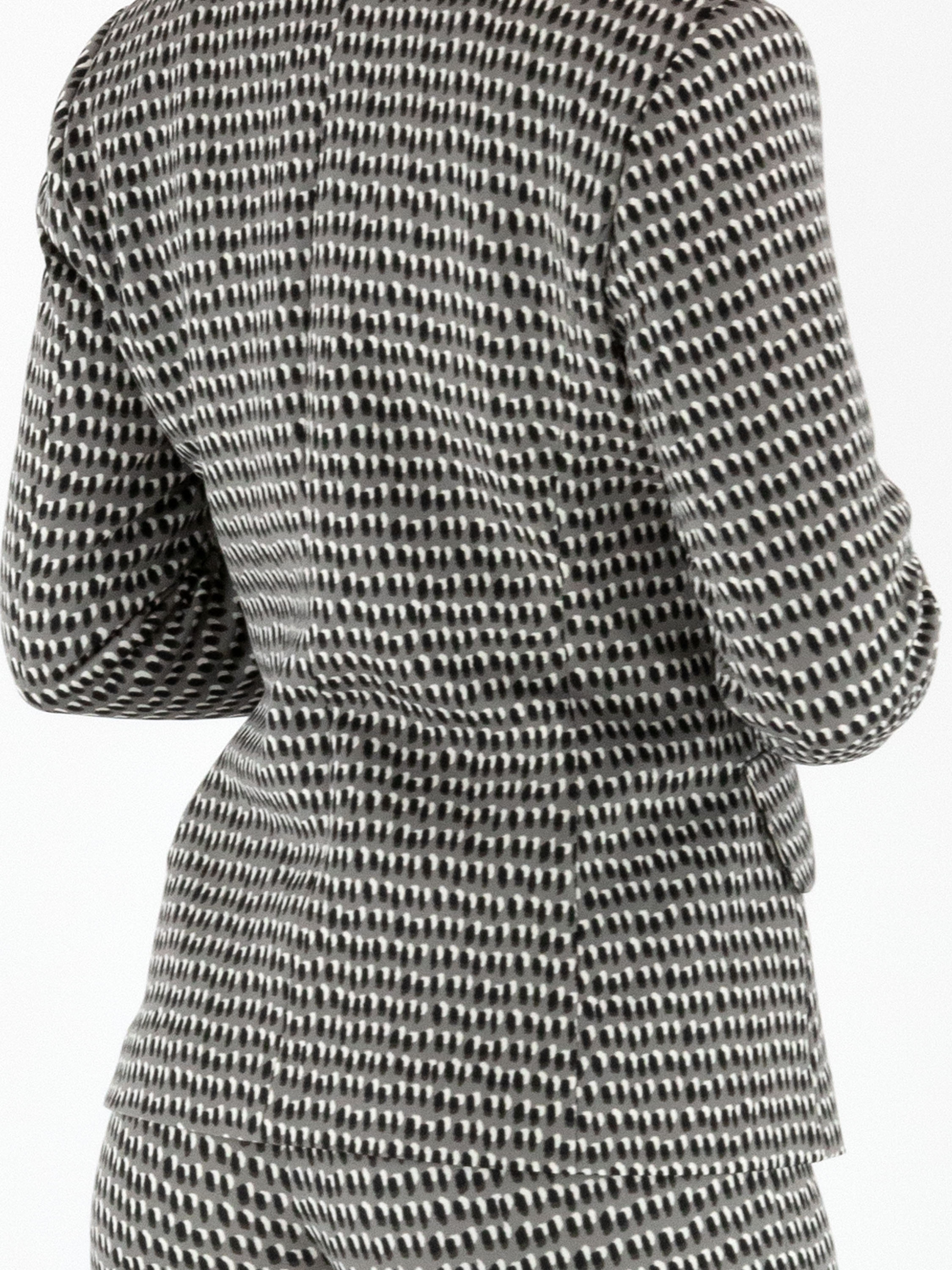 Blazer Marc Cain en matière scuba avec imprimé à pois noirs et blancs sur fond gris. Le blazer se ferme par deux boutons et est partiellement doublé. Ce vêtement peut être lavé à 30 degrés.